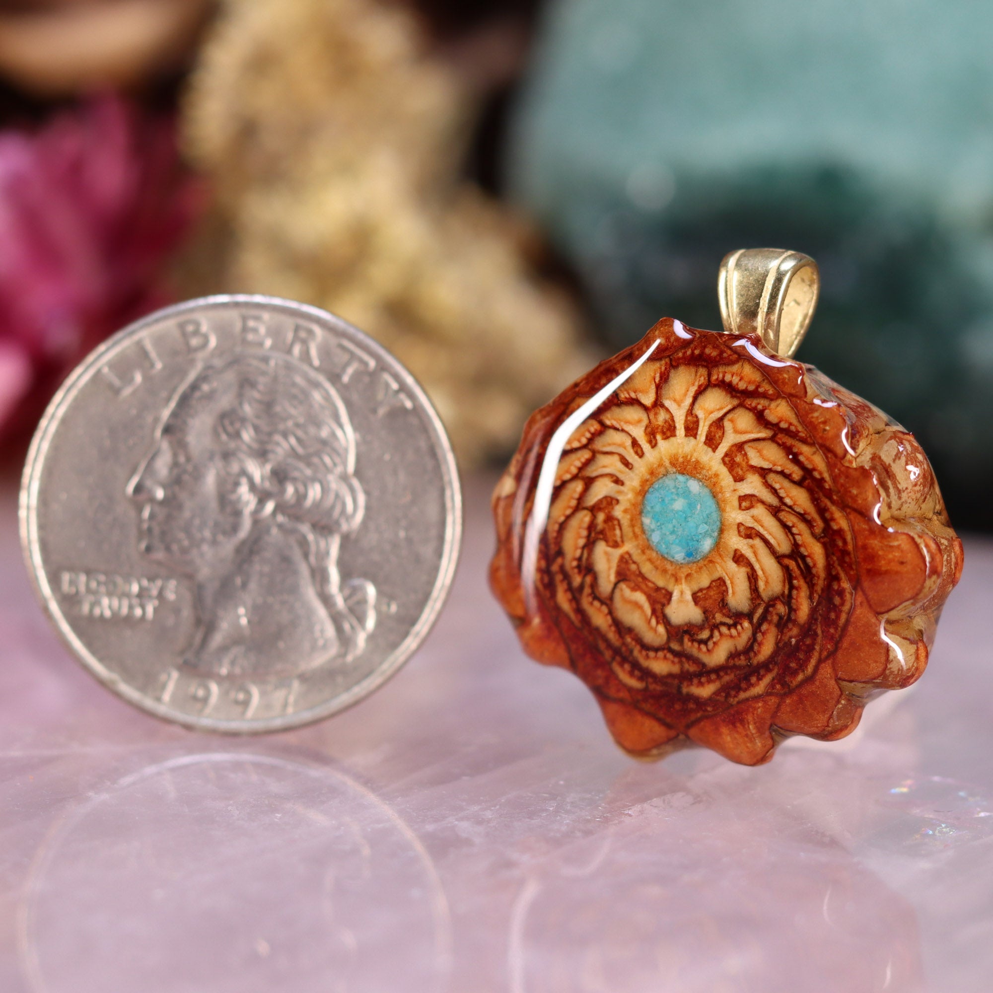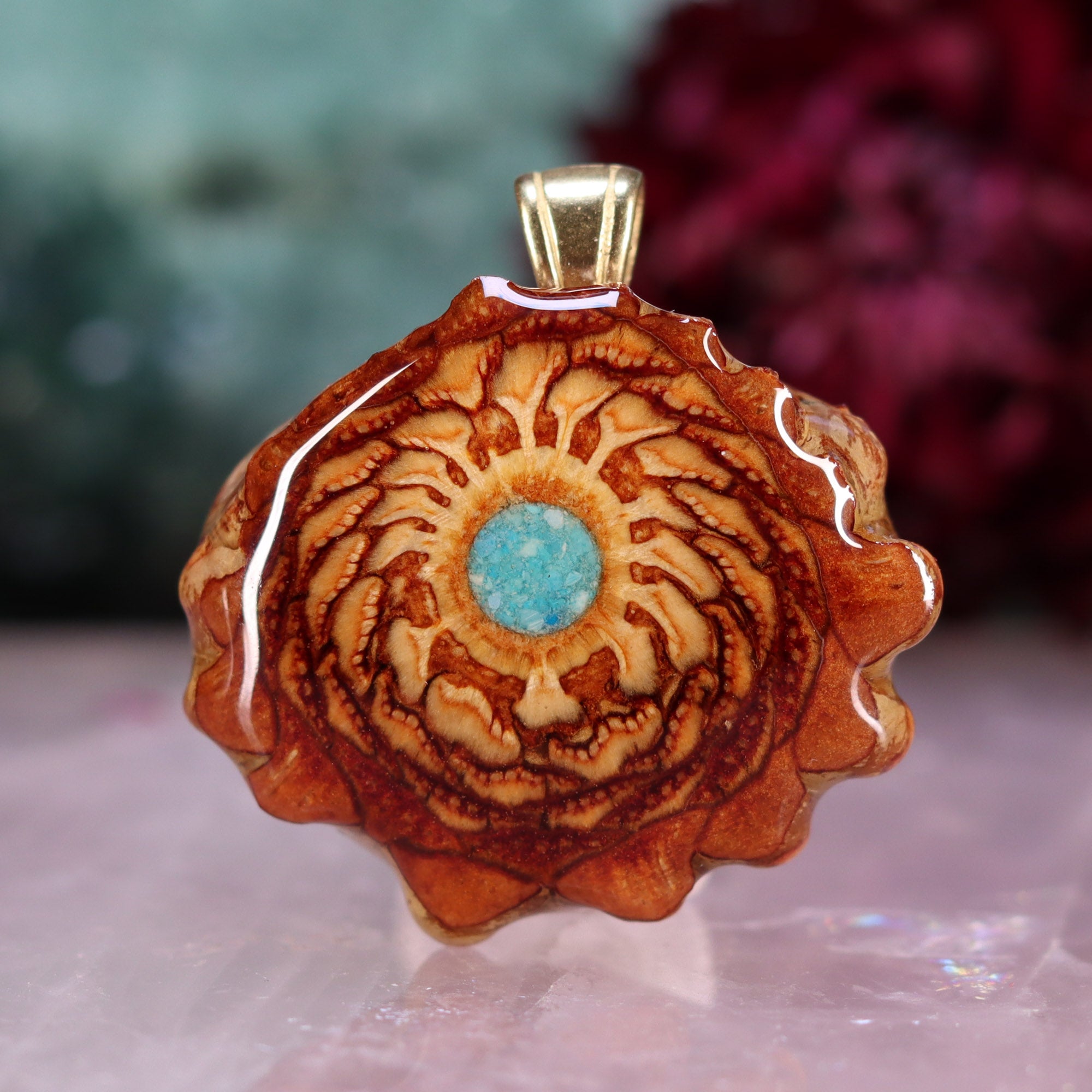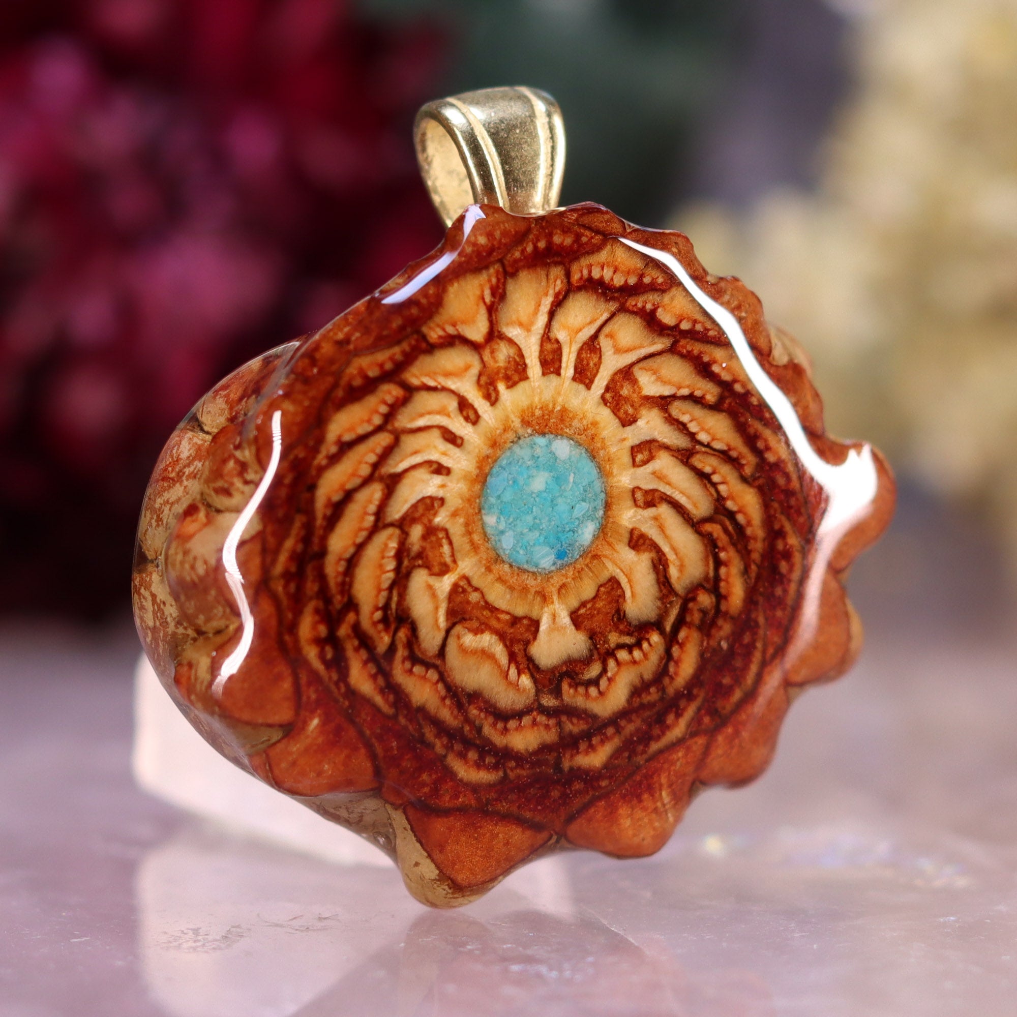 Every pinecone pendant is an elegant gift from Mother Nature -- unveiling the ornate Sacred Geometry hidden at the center of one of the world's densest Pinecones. Because only one cross-section is taken from the "heart" of each Cone, every pendant is absolutely unique, and truly one-of-a-kind.