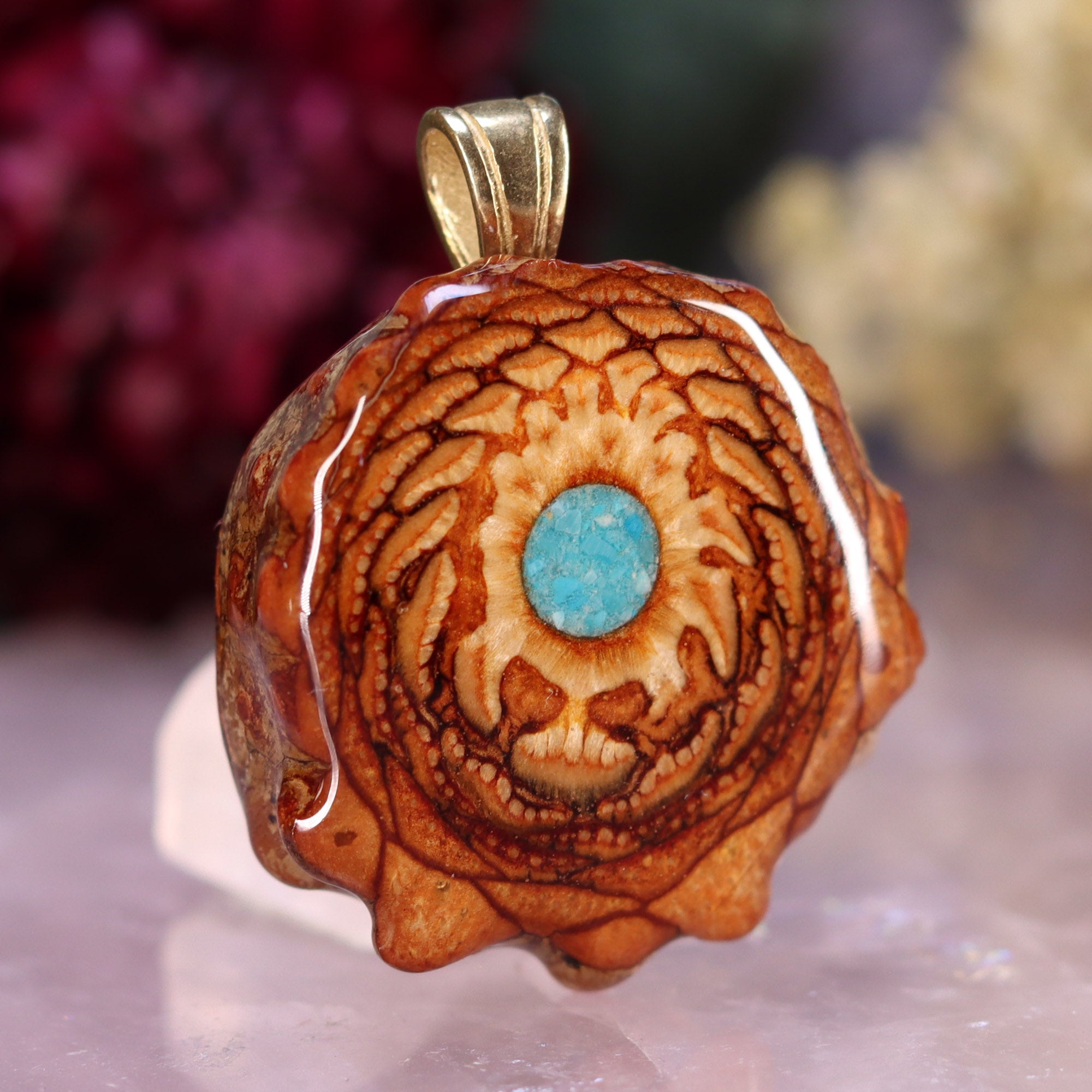 Every pinecone pendant is an elegant gift from Mother Nature -- unveiling the ornate Sacred Geometry hidden at the center of one of the world's densest Pinecones. Because only one cross-section is taken from the "heart" of each Cone, every pendant is absolutely unique, and truly one-of-a-kind.