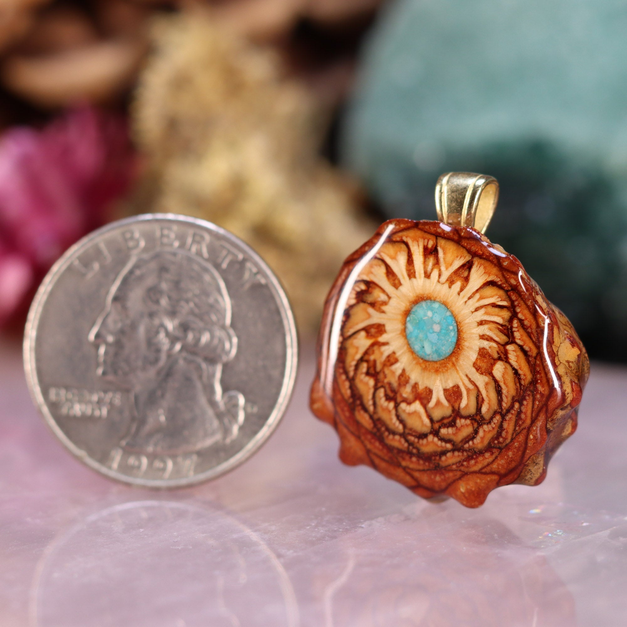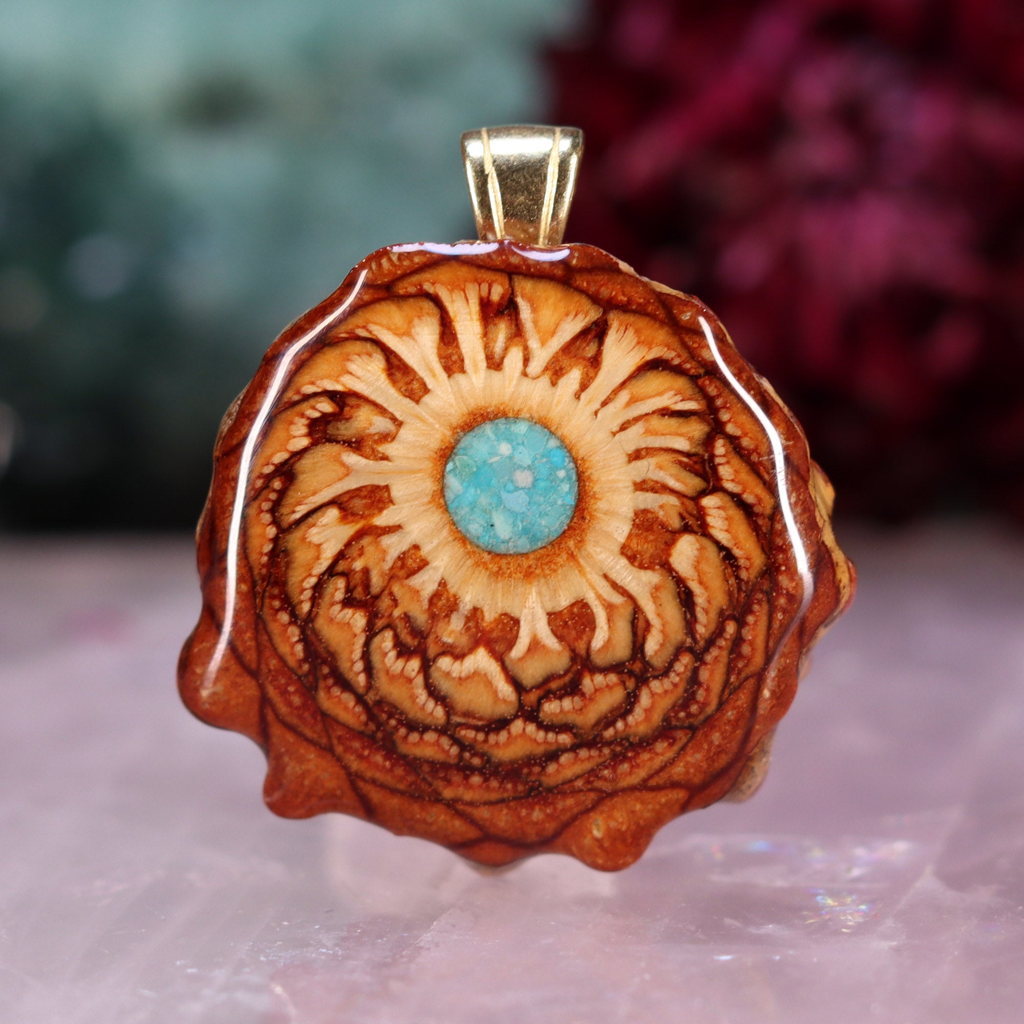 Crushed Turquoise has been carefully mixed with a Phosphorescent Powder, then inlaid into the center of this unique pendant -- causing it to gently "Glow" in the dark, in addition to its vibrant color during the day!