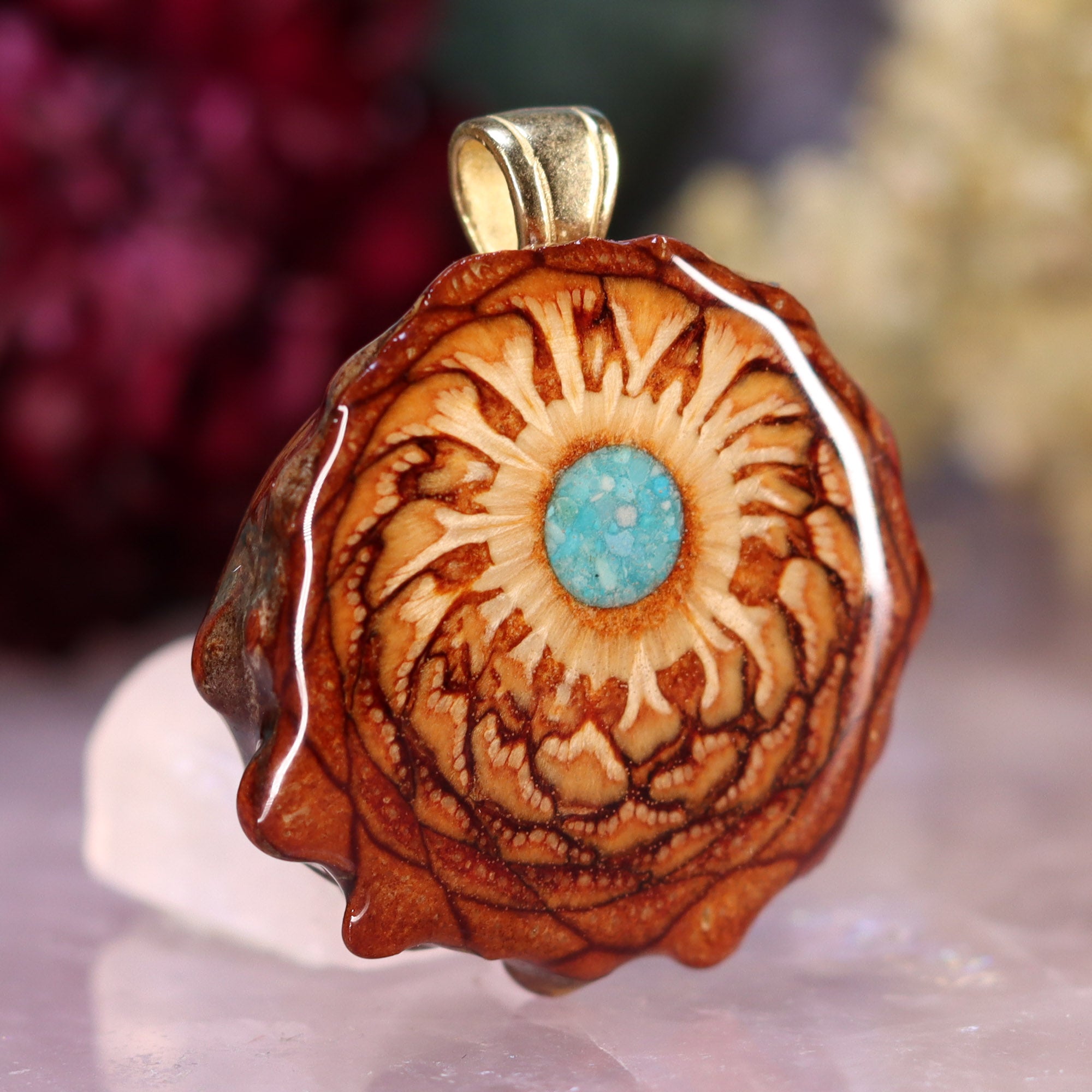 Every pinecone pendant is an elegant gift from Mother Nature -- unveiling the ornate Sacred Geometry hidden at the center of one of the world's densest Pinecones. Because only one cross-section is taken from the "heart" of each Cone, every pendant is absolutely unique, and truly one-of-a-kind.