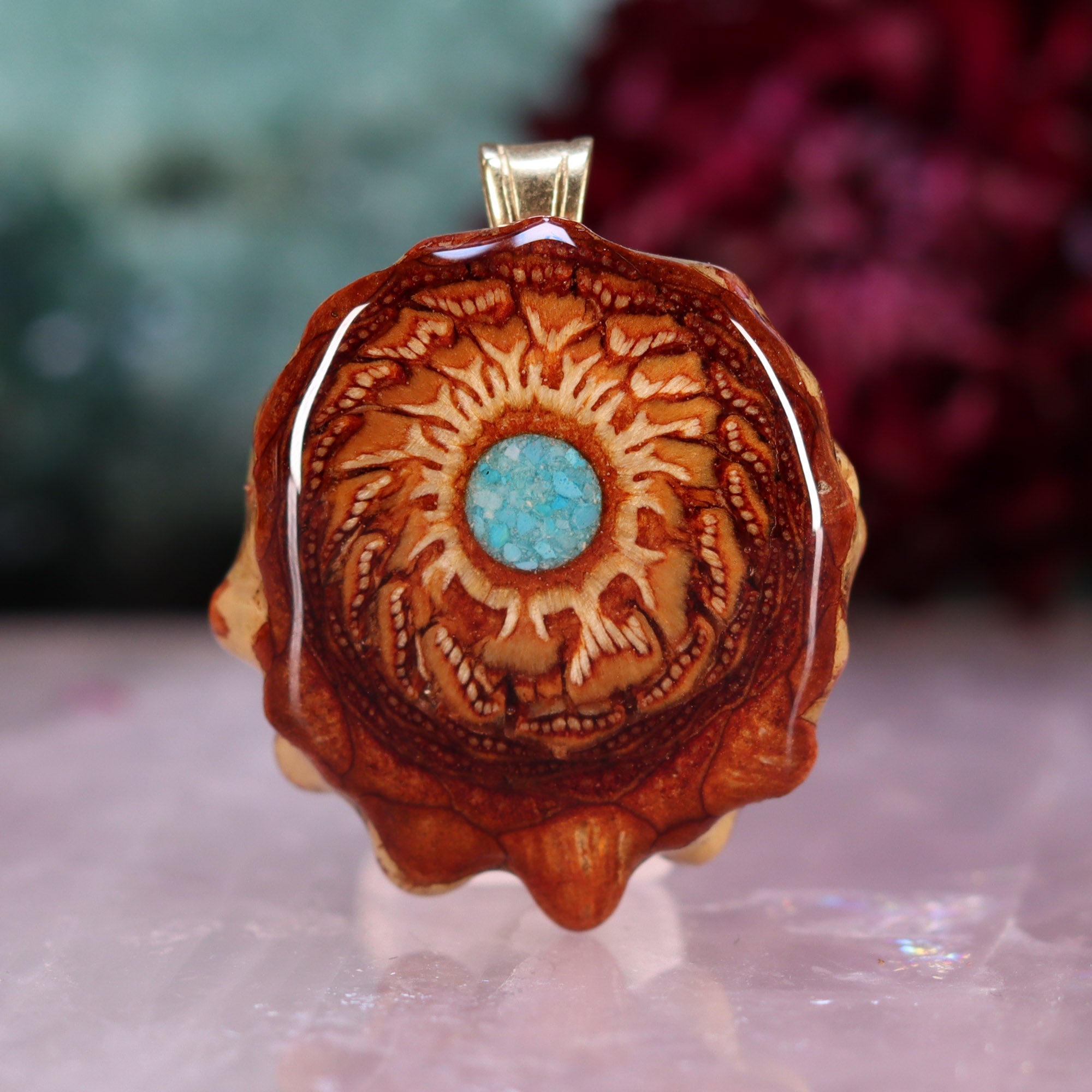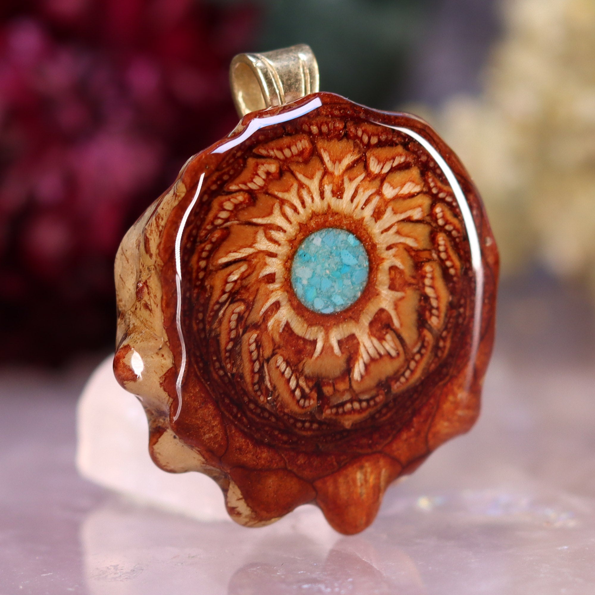Every pinecone pendant is an elegant gift from Mother Nature -- unveiling the ornate Sacred Geometry hidden at the center of one of the world's densest Pinecones. Because only one cross-section is taken from the "heart" of each Cone, every pendant is absolutely unique, and truly one-of-a-kind.