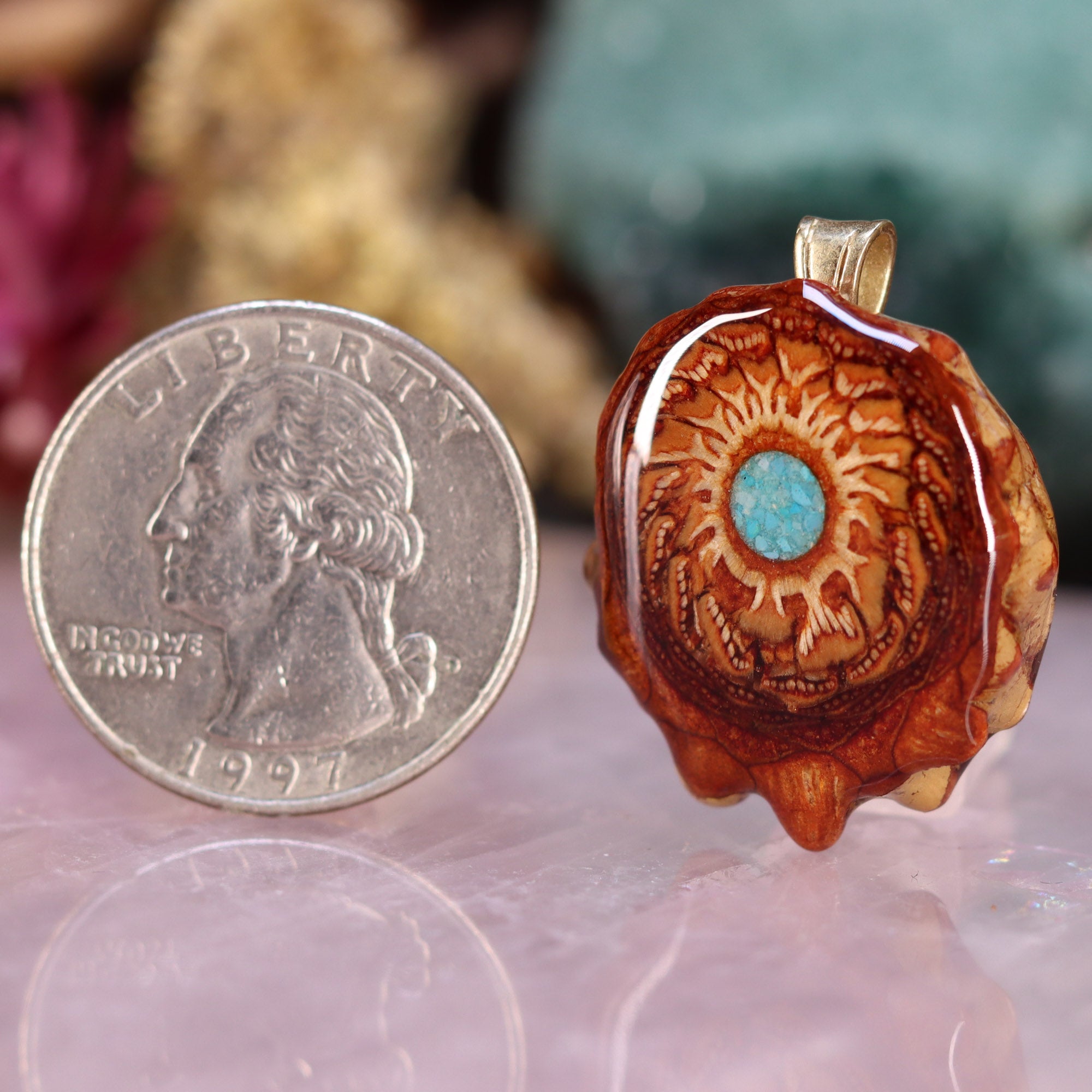 Crushed Turquoise has been carefully mixed with a Phosphorescent Powder, then inlaid into the center of this unique pendant -- causing it to gently "Glow" in the dark, in addition to its vibrant color during the day!