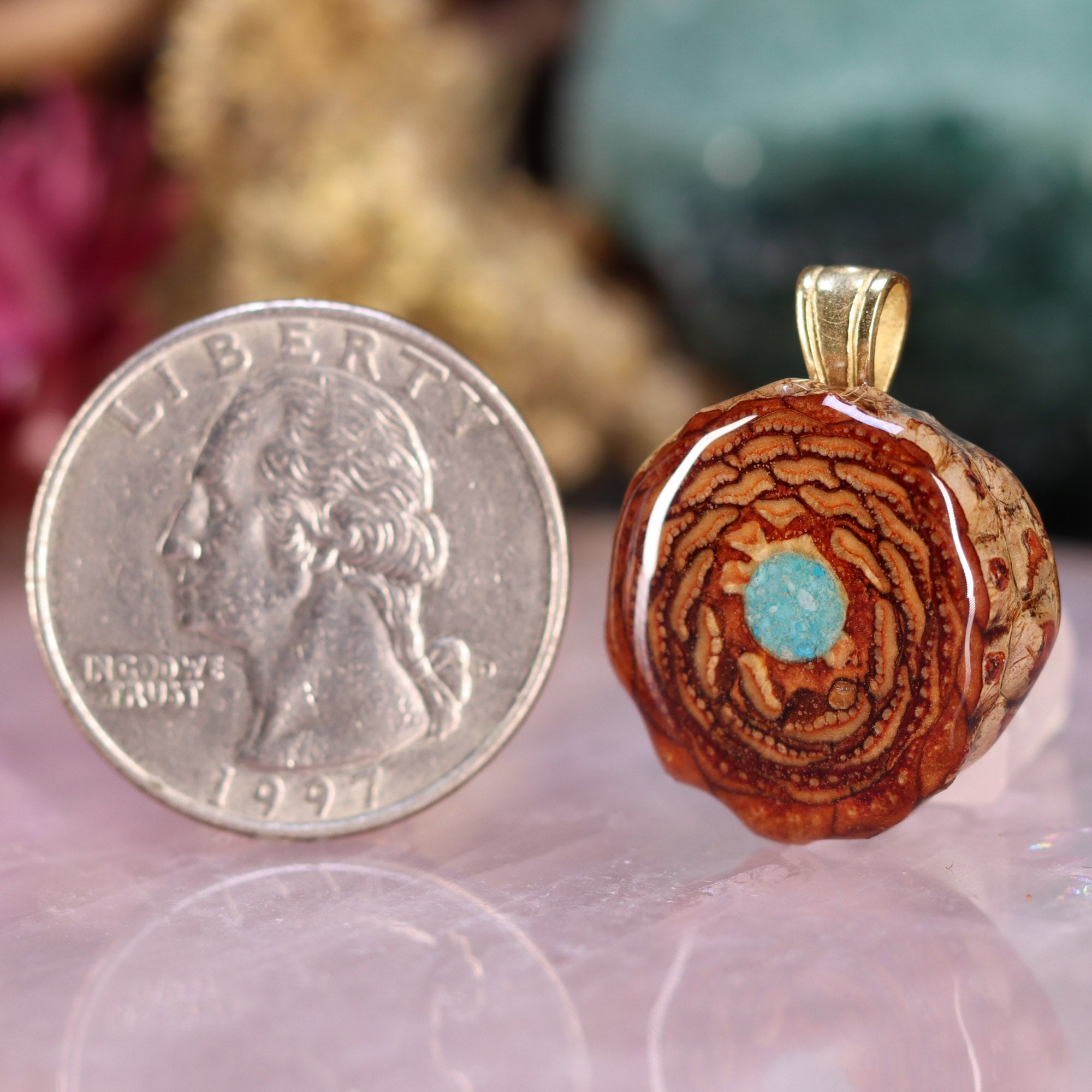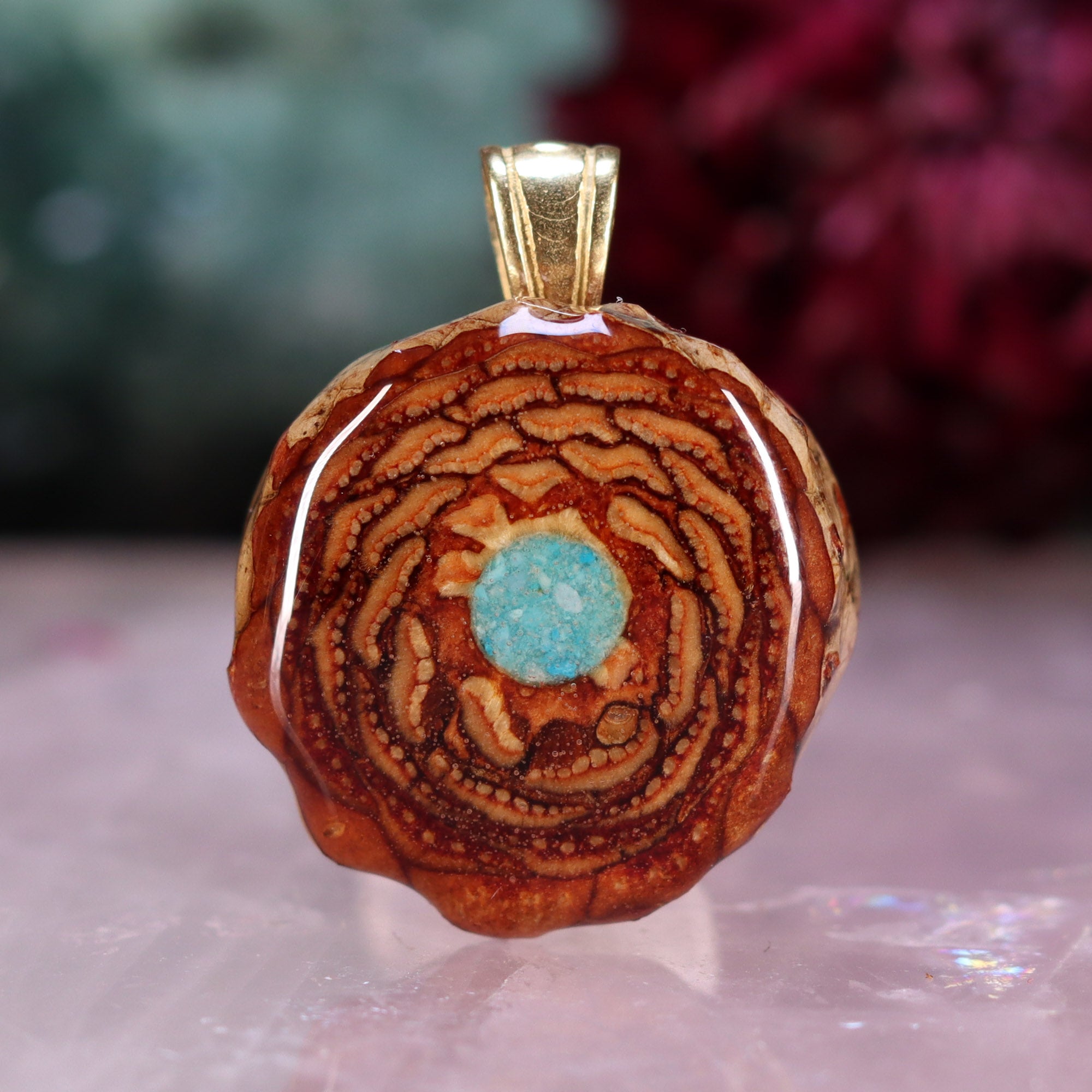 Crushed Turquoise has been carefully mixed with a Phosphorescent Powder, then inlaid into the center of this unique pendant -- causing it to gently "Glow" in the dark, in addition to its vibrant color during the day!