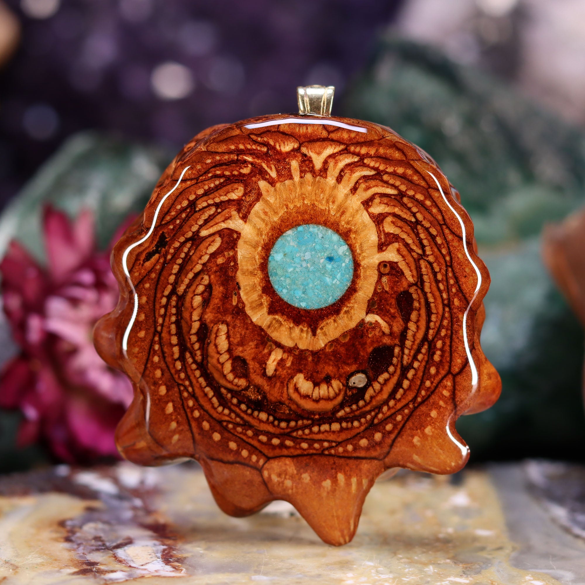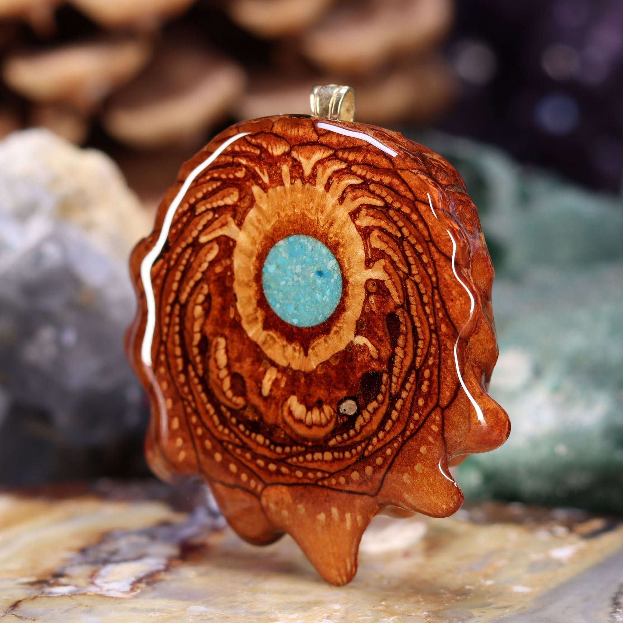 Every pinecone pendant is an elegant gift from Mother Nature -- unveiling the ornate Sacred Geometry hidden at the center of one of the world's densest Pinecones. Because only one cross-section is taken from the "heart" of each Cone, every pendant is absolutely unique, and truly one-of-a-kind.