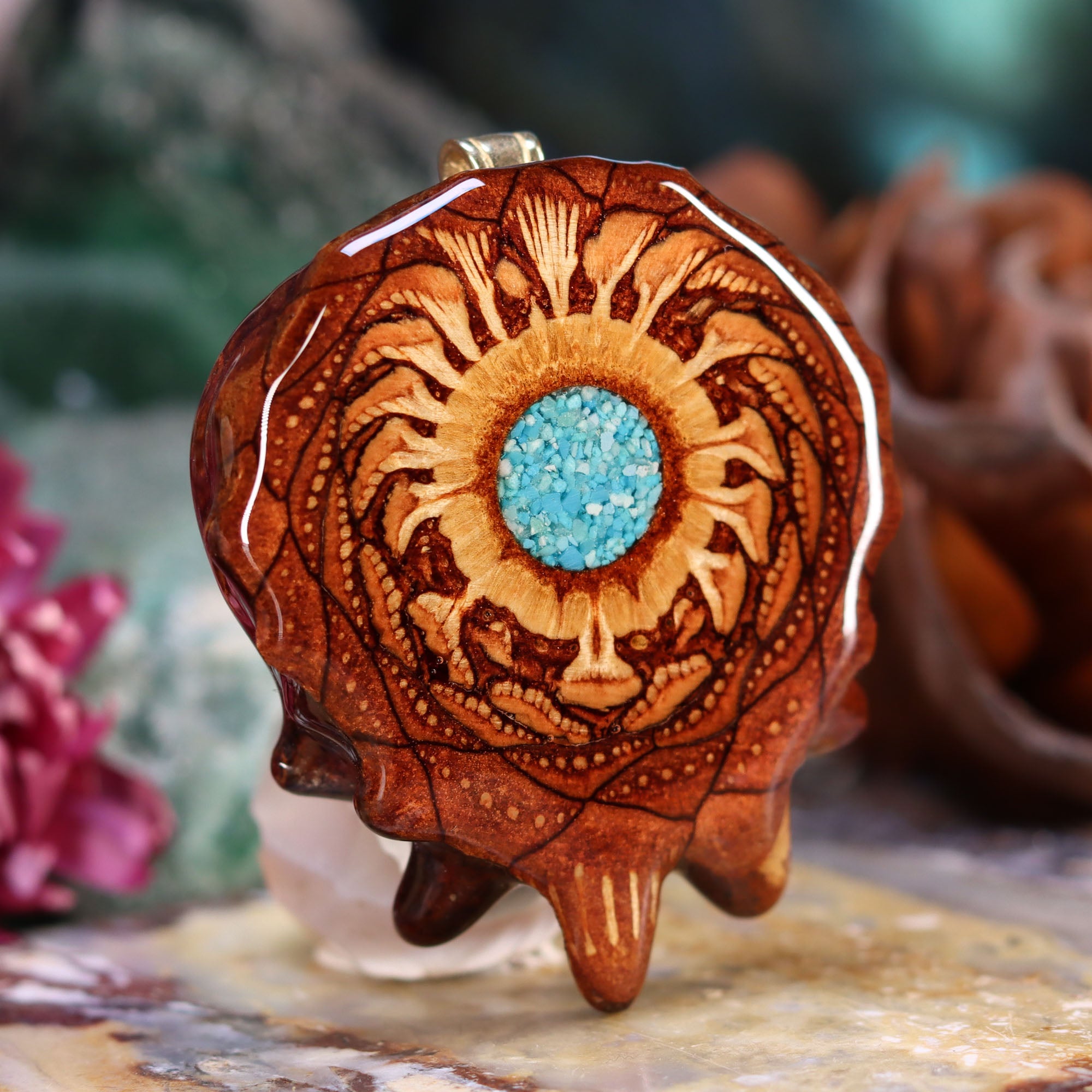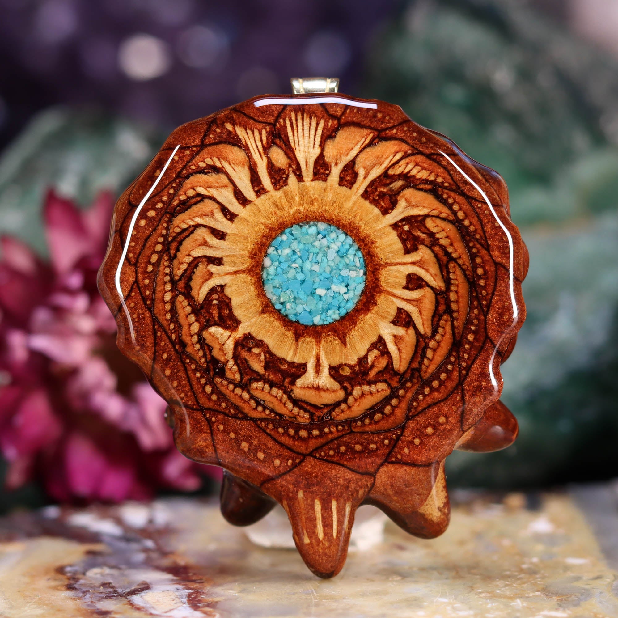 Crushed Turquoise has been carefully mixed with a Phosphorescent Powder, then inlaid into the center of this unique pendant -- causing it to gently "Glow" in the dark, in addition to its vibrant color during the day!