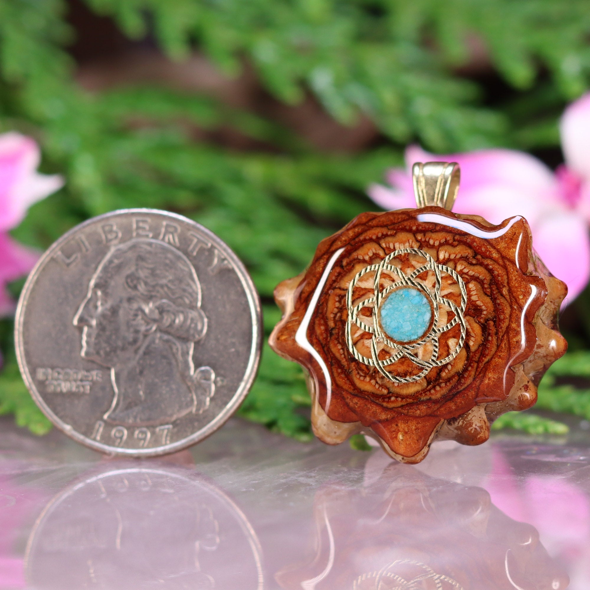 Every pinecone pendant is an elegant gift from Mother Nature -- unveiling the ornate Sacred Geometry hidden at the center of one of the world's densest Pinecones. Because only one cross-section is taken from the "heart" of each Cone, every pendant is absolutely unique, and truly one-of-a-kind.
