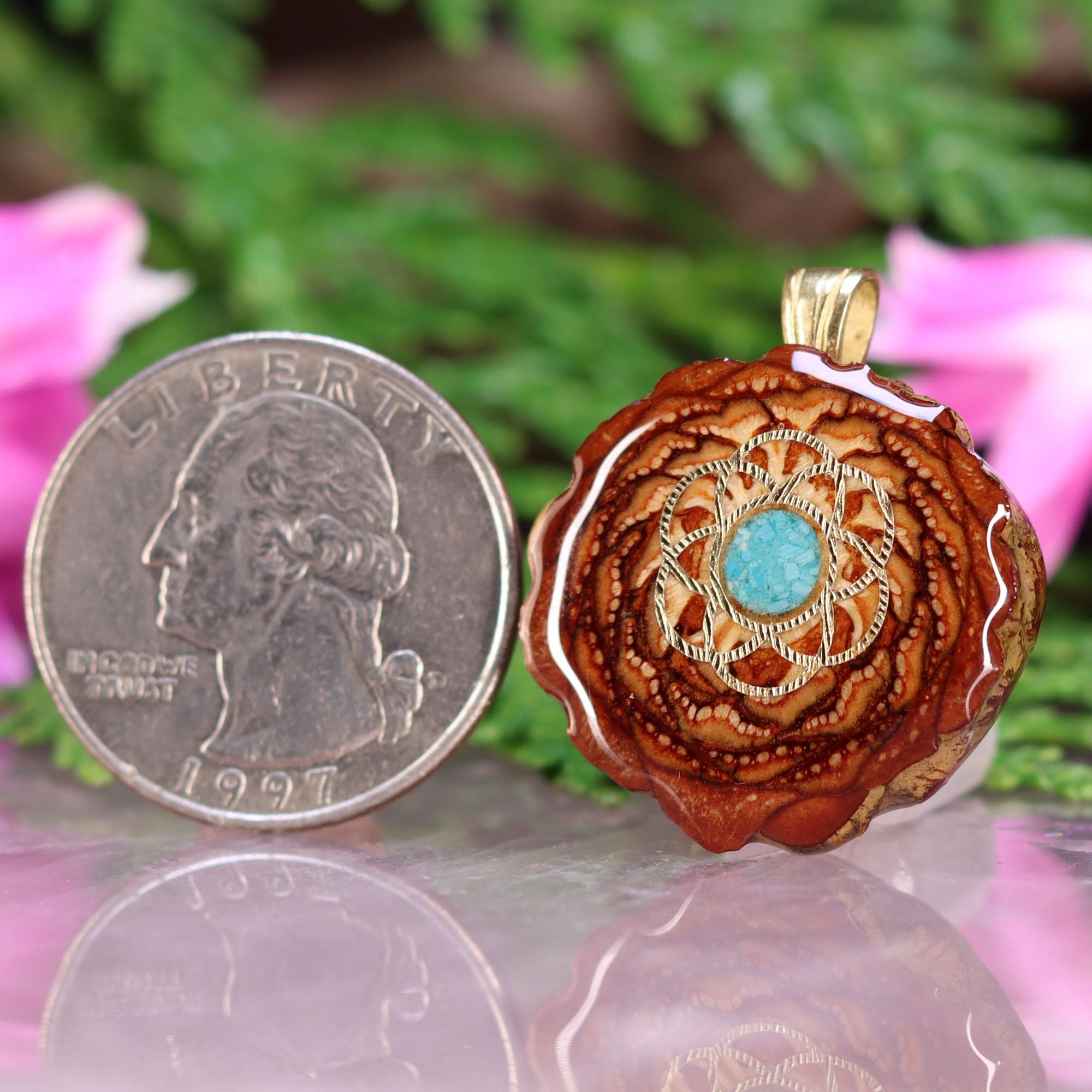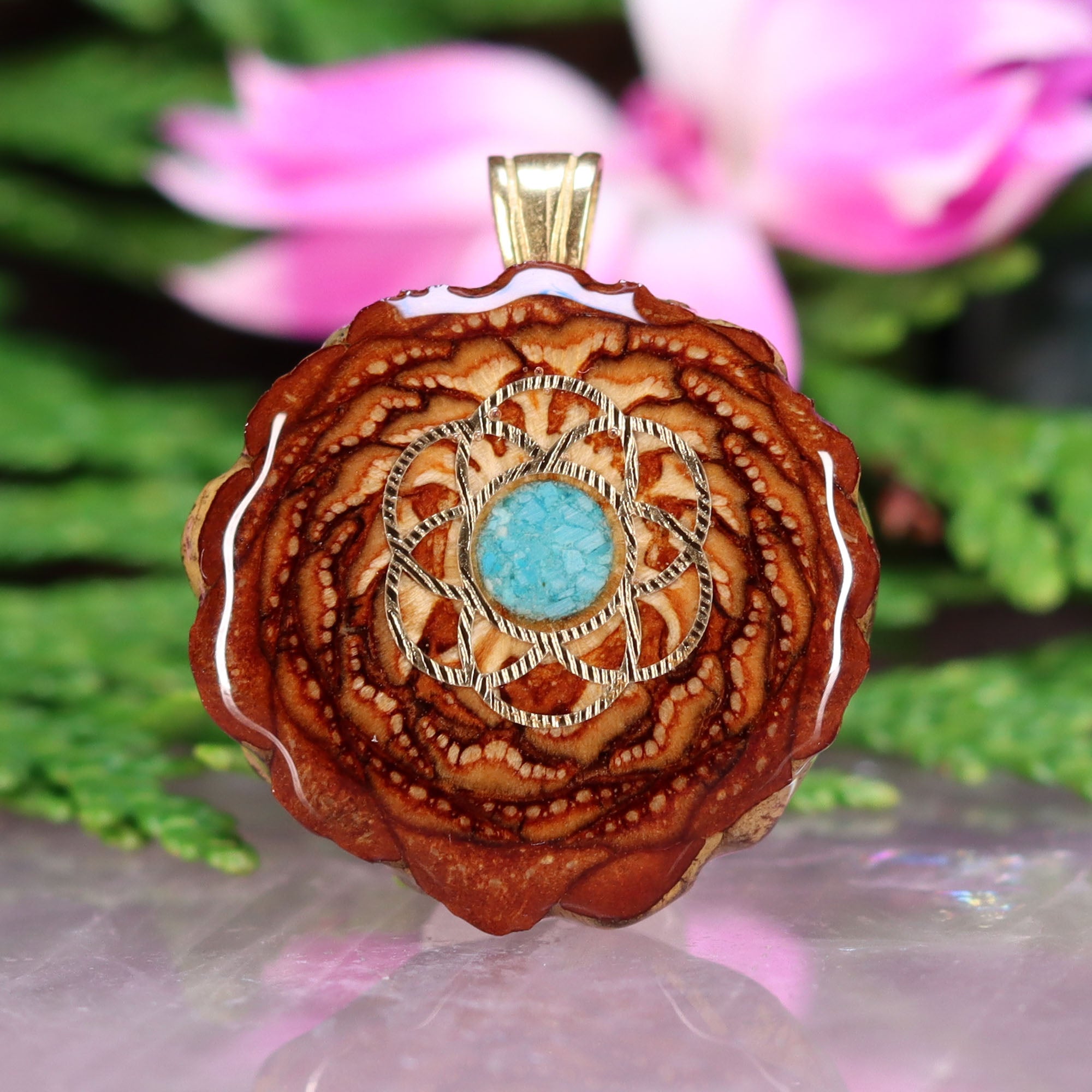 Every pinecone pendant is an elegant gift from Mother Nature -- unveiling the ornate Sacred Geometry hidden at the center of one of the world's densest Pinecones. Because only one cross-section is taken from the "heart" of each Cone, every pendant is absolutely unique, and truly one-of-a-kind.