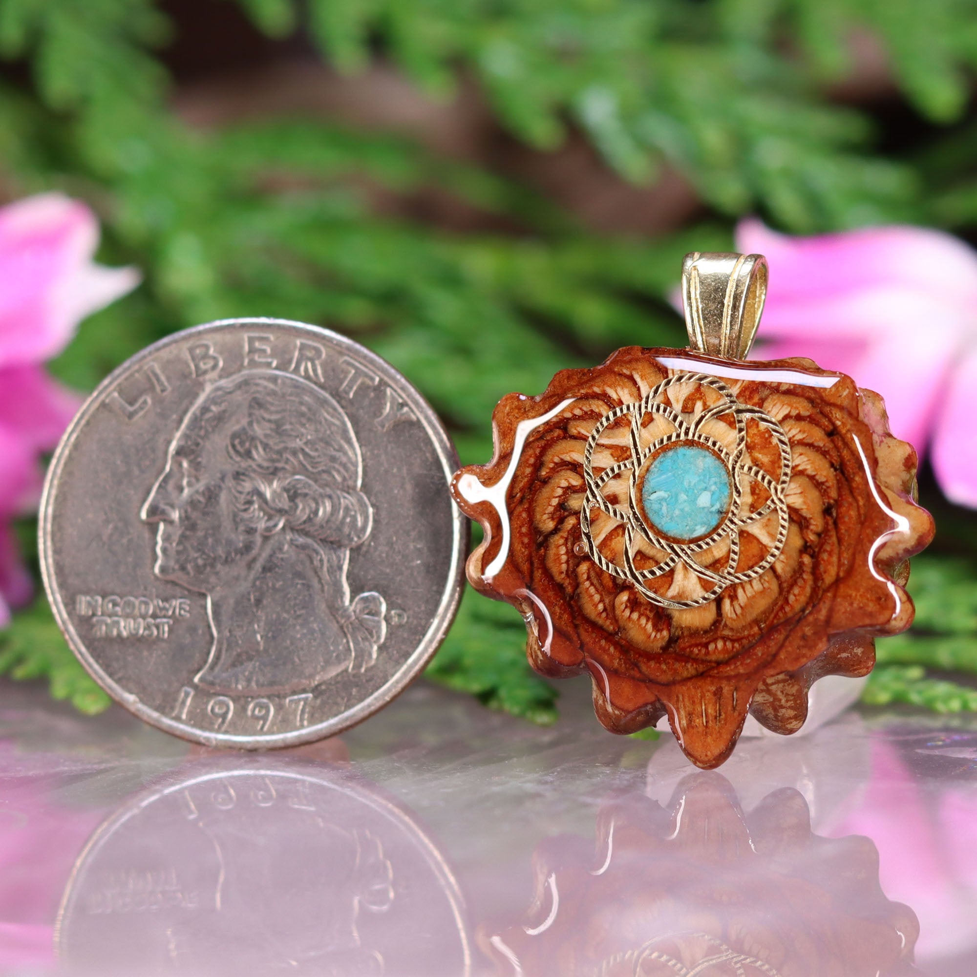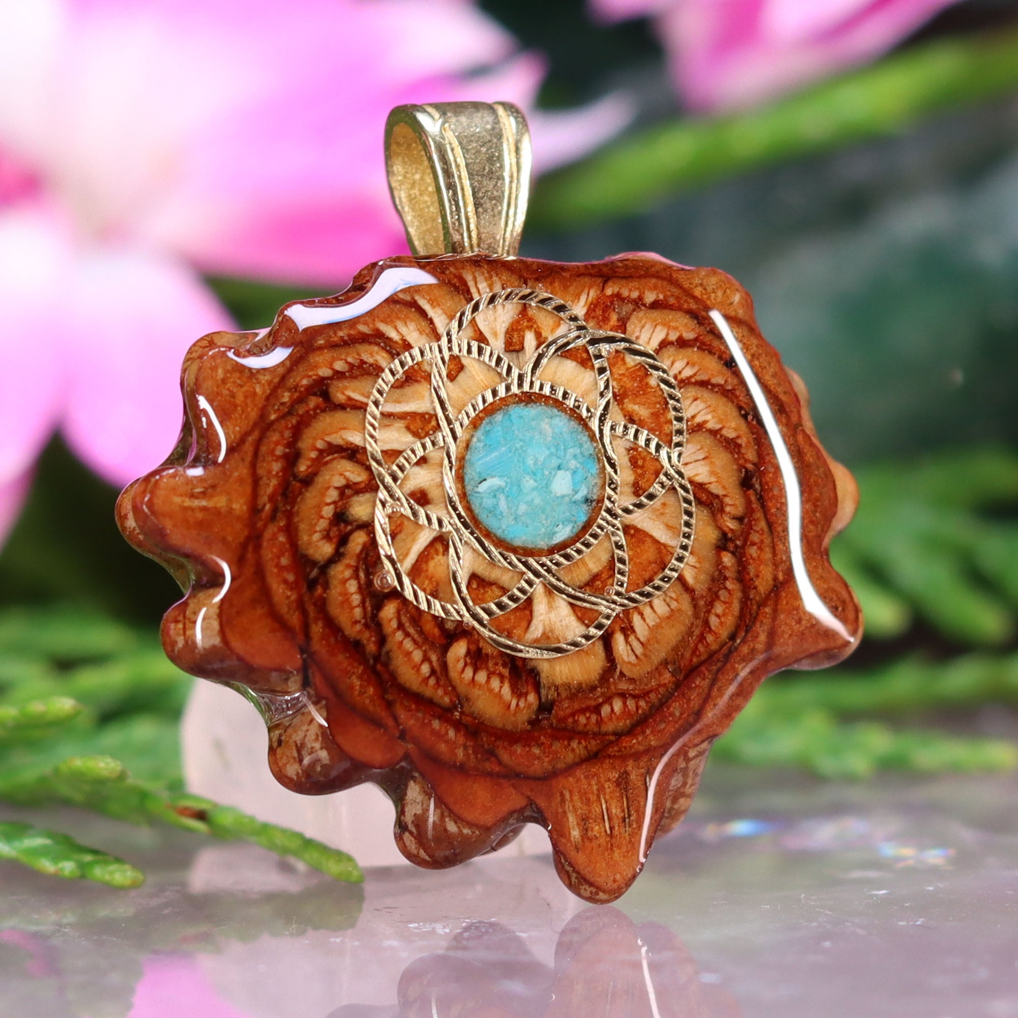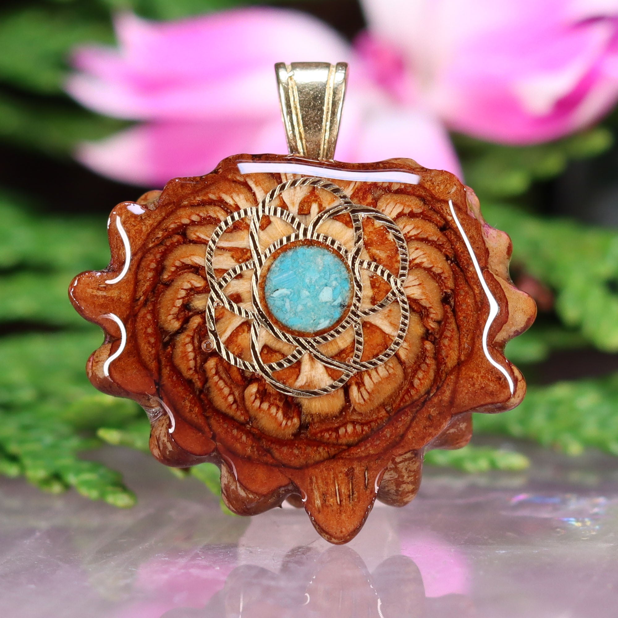 Every pinecone pendant is an elegant gift from Mother Nature -- unveiling the ornate Sacred Geometry hidden at the center of one of the world's densest Pinecones. Because only one cross-section is taken from the "heart" of each Cone, every pendant is absolutely unique, and truly one-of-a-kind.