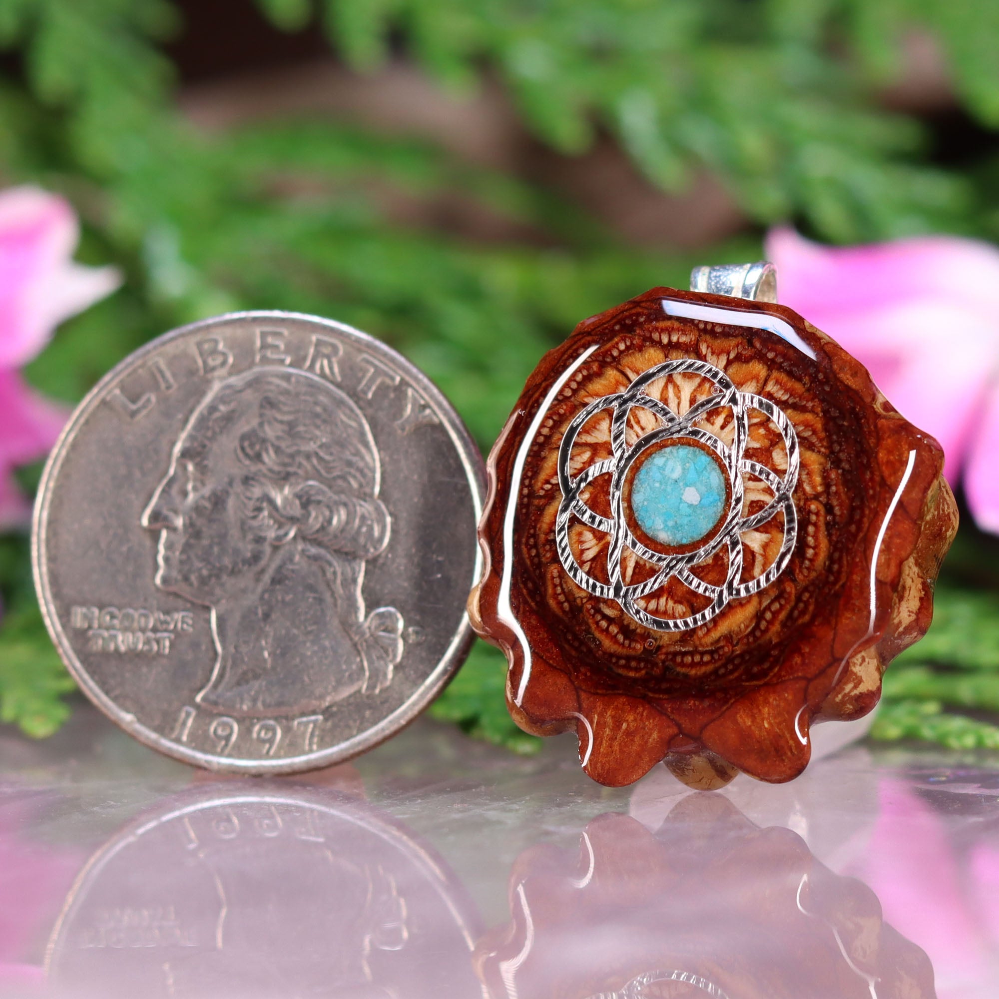 Every pinecone pendant is an elegant gift from Mother Nature -- unveiling the ornate Sacred Geometry hidden at the center of one of the world's densest Pinecones. Because only one cross-section is taken from the "heart" of each Cone, every pendant is absolutely unique, and truly one-of-a-kind.