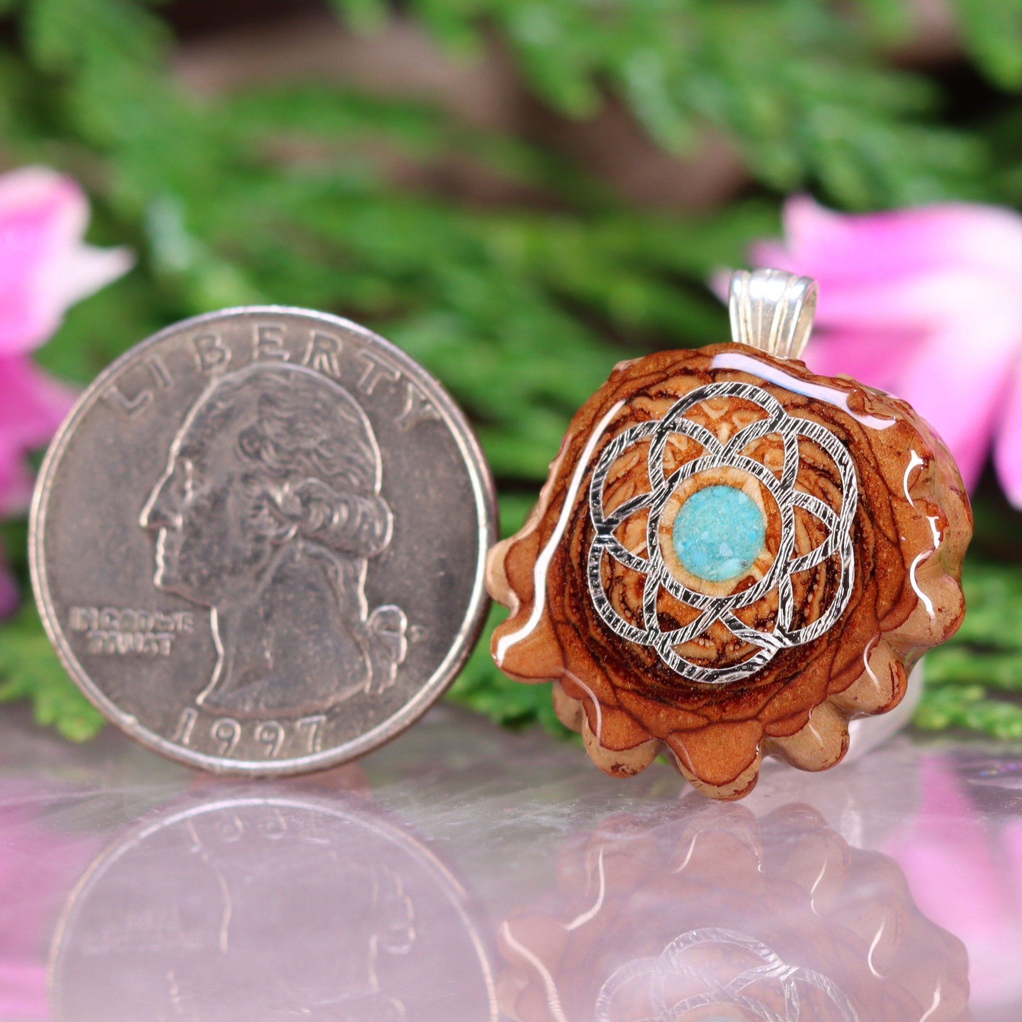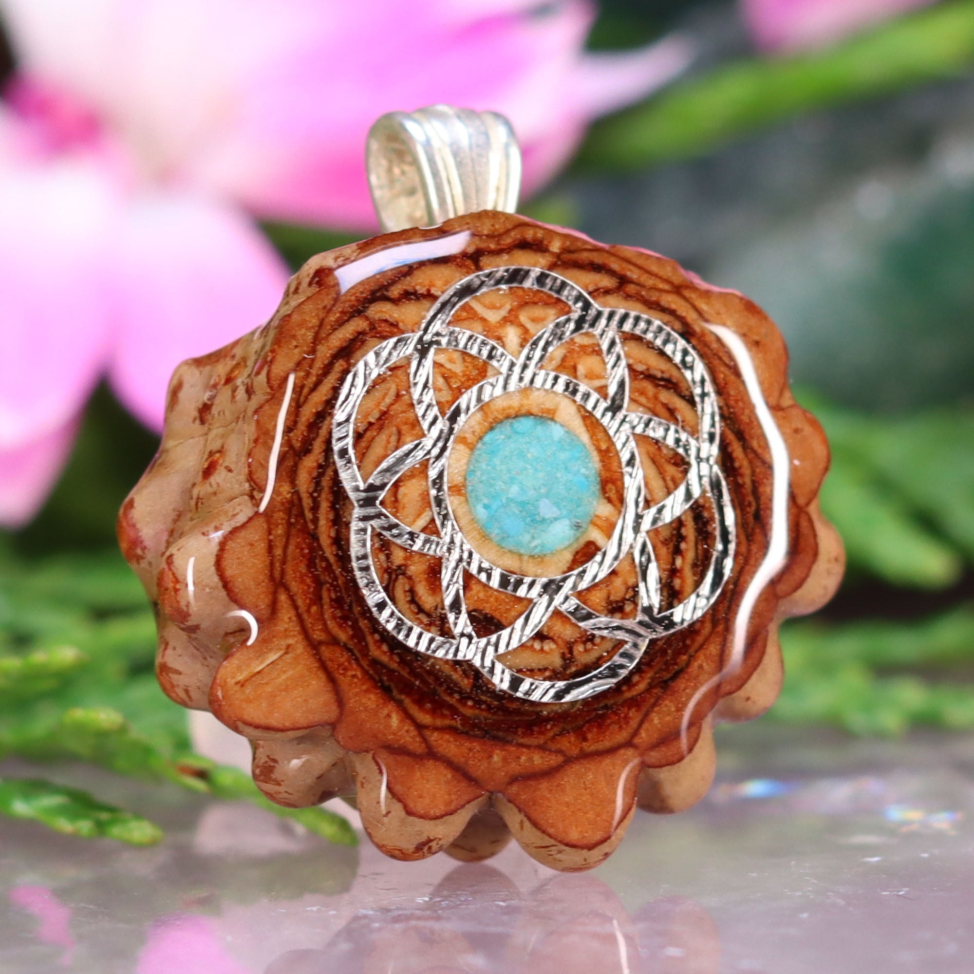 Every pinecone pendant is an elegant gift from Mother Nature -- unveiling the ornate Sacred Geometry hidden at the center of one of the world's densest Pinecones. Because only one cross-section is taken from the "heart" of each Cone, every pendant is absolutely unique, and truly one-of-a-kind.