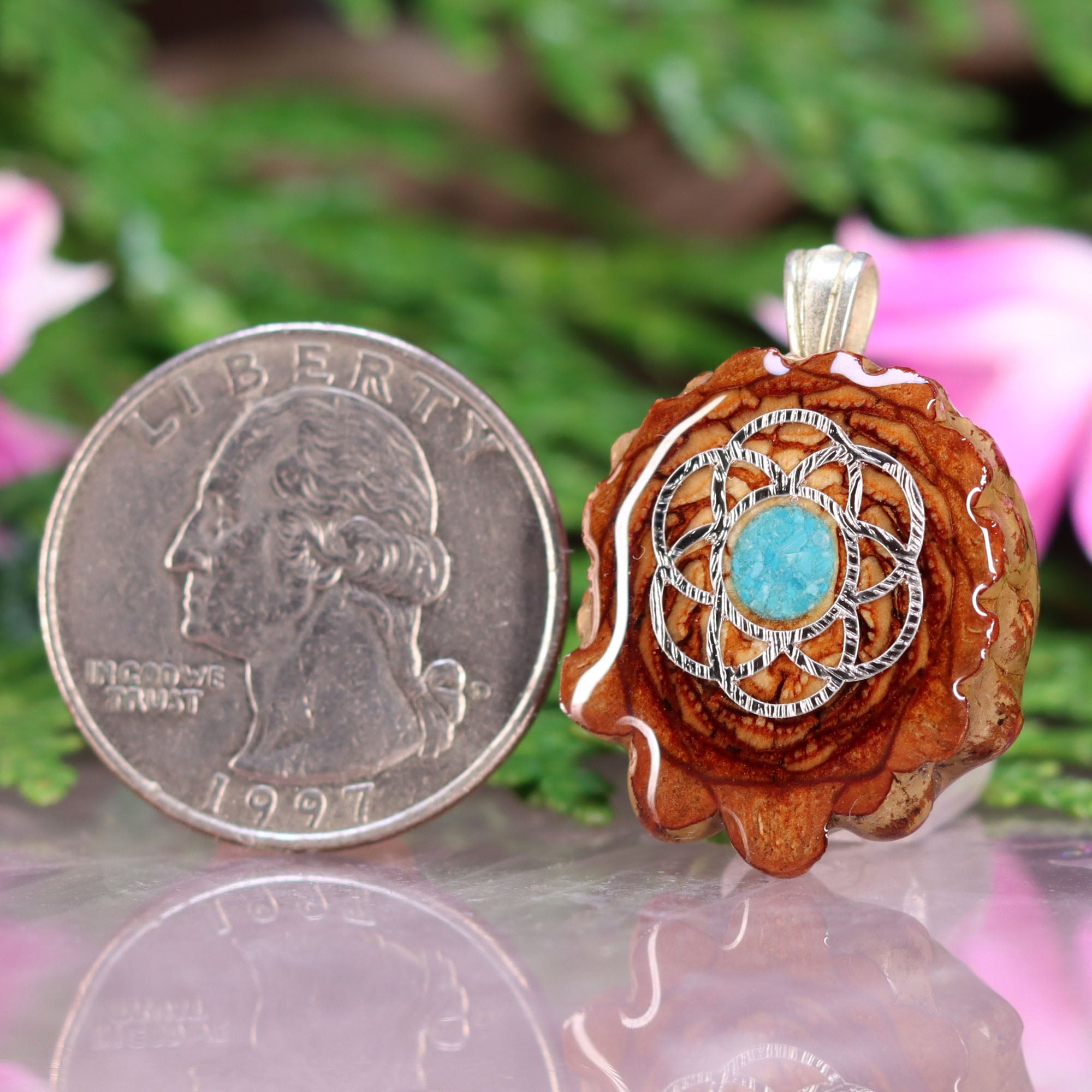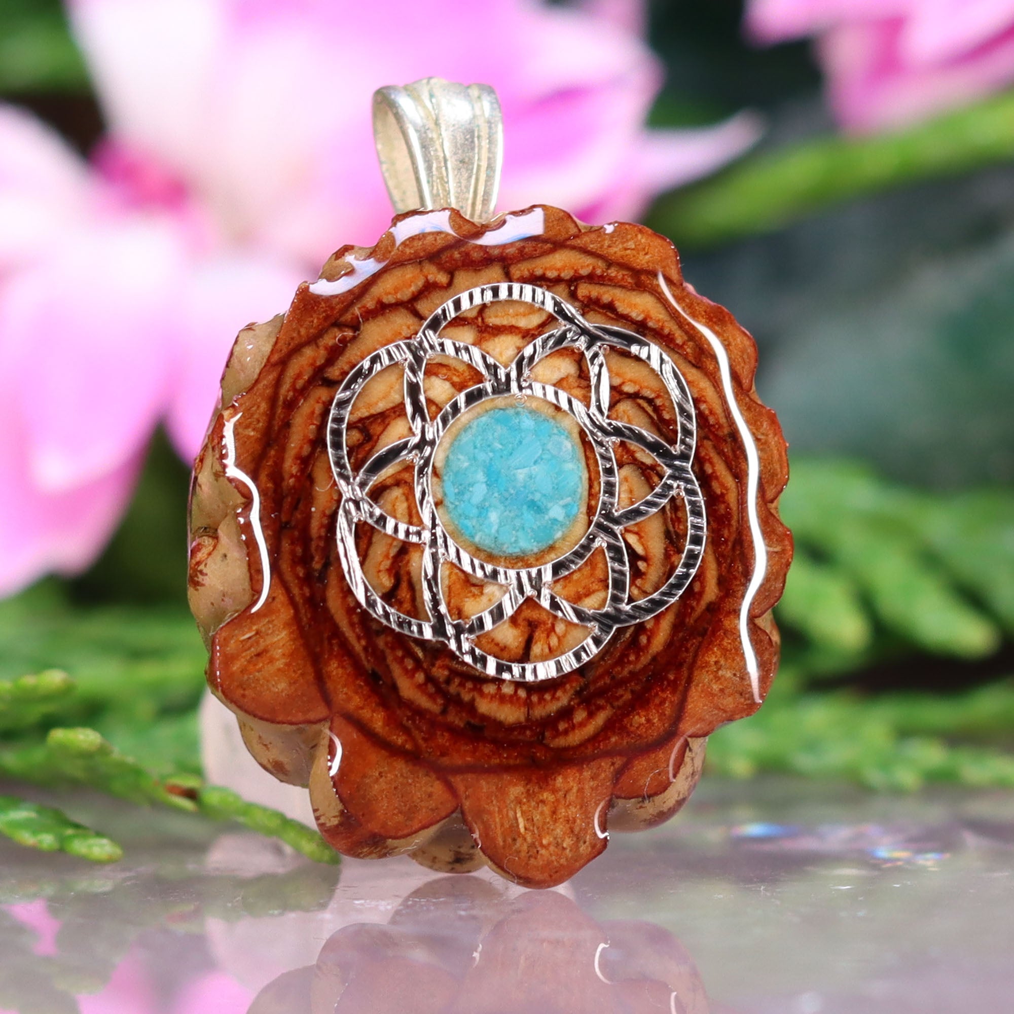 Every pinecone pendant is an elegant gift from Mother Nature -- unveiling the ornate Sacred Geometry hidden at the center of one of the world's densest Pinecones. Because only one cross-section is taken from the "heart" of each Cone, every pendant is absolutely unique, and truly one-of-a-kind.