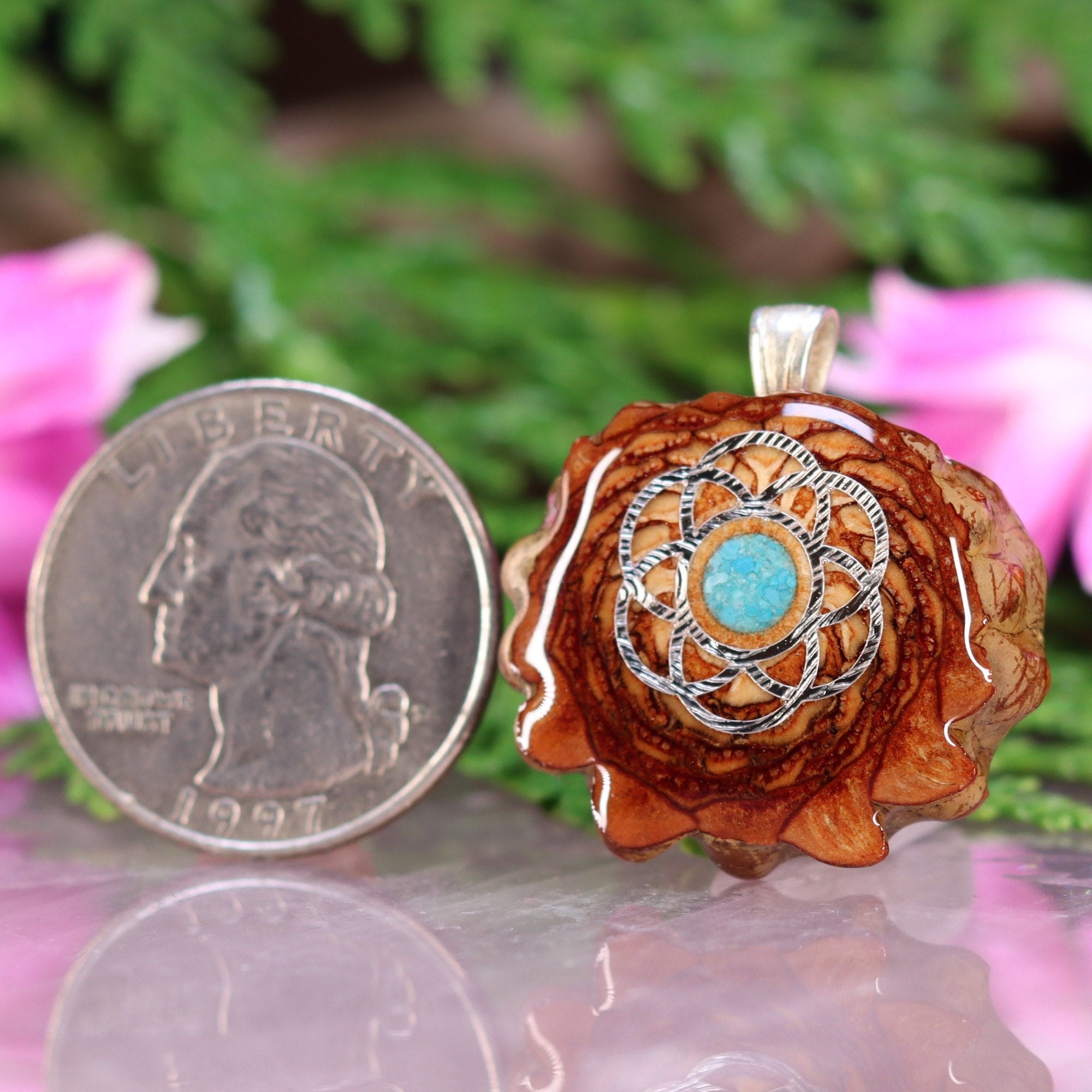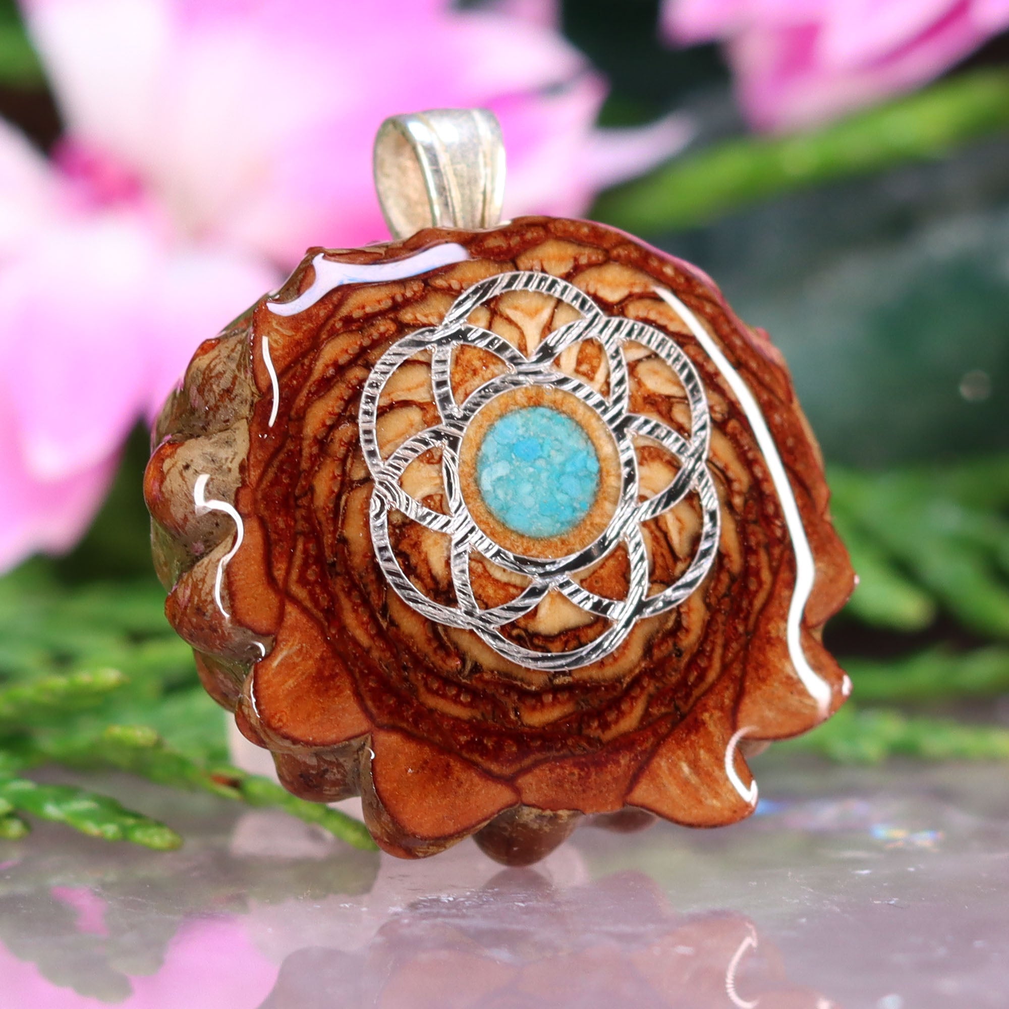 Every pinecone pendant is an elegant gift from Mother Nature -- unveiling the ornate Sacred Geometry hidden at the center of one of the world's densest Pinecones. Because only one cross-section is taken from the "heart" of each Cone, every pendant is absolutely unique, and truly one-of-a-kind.