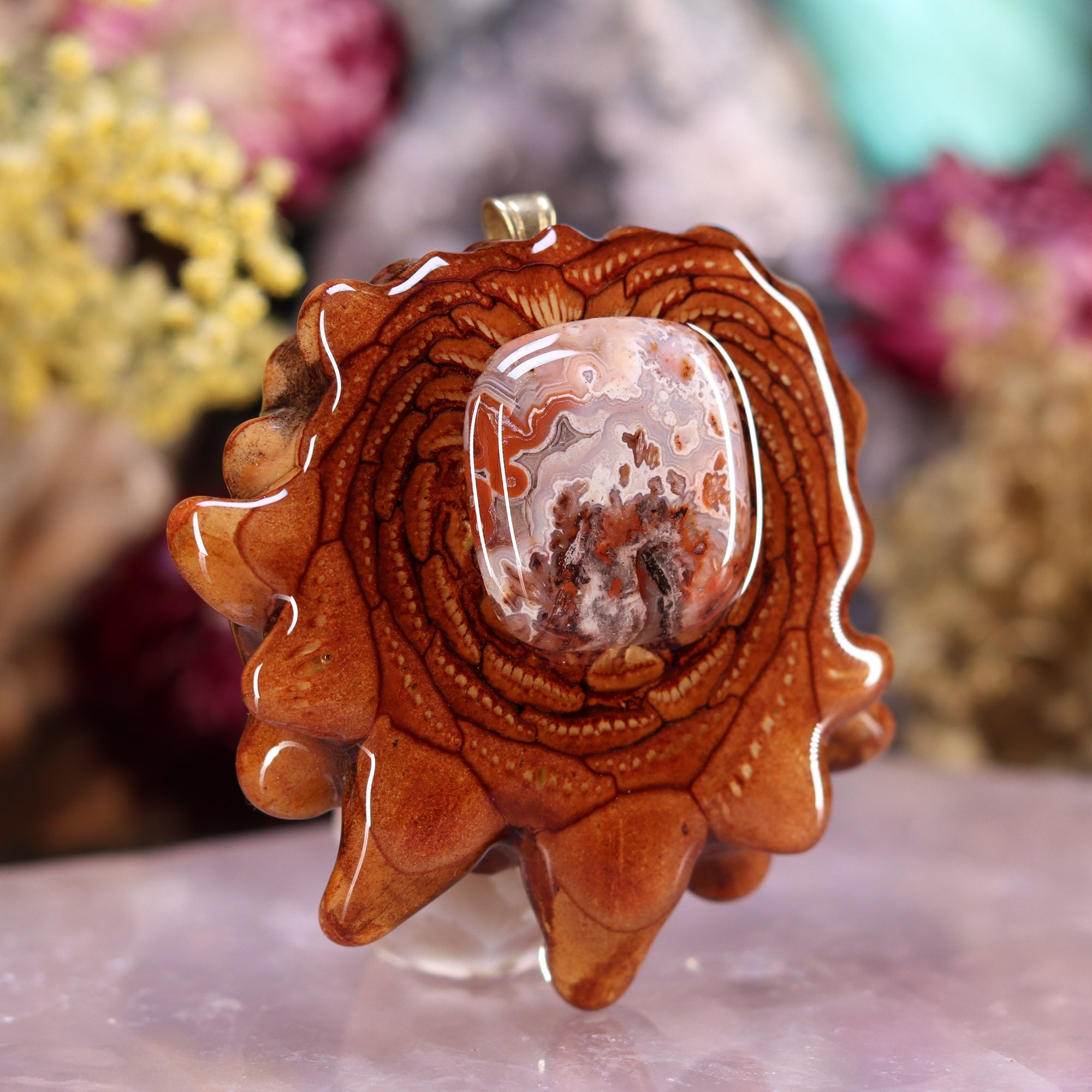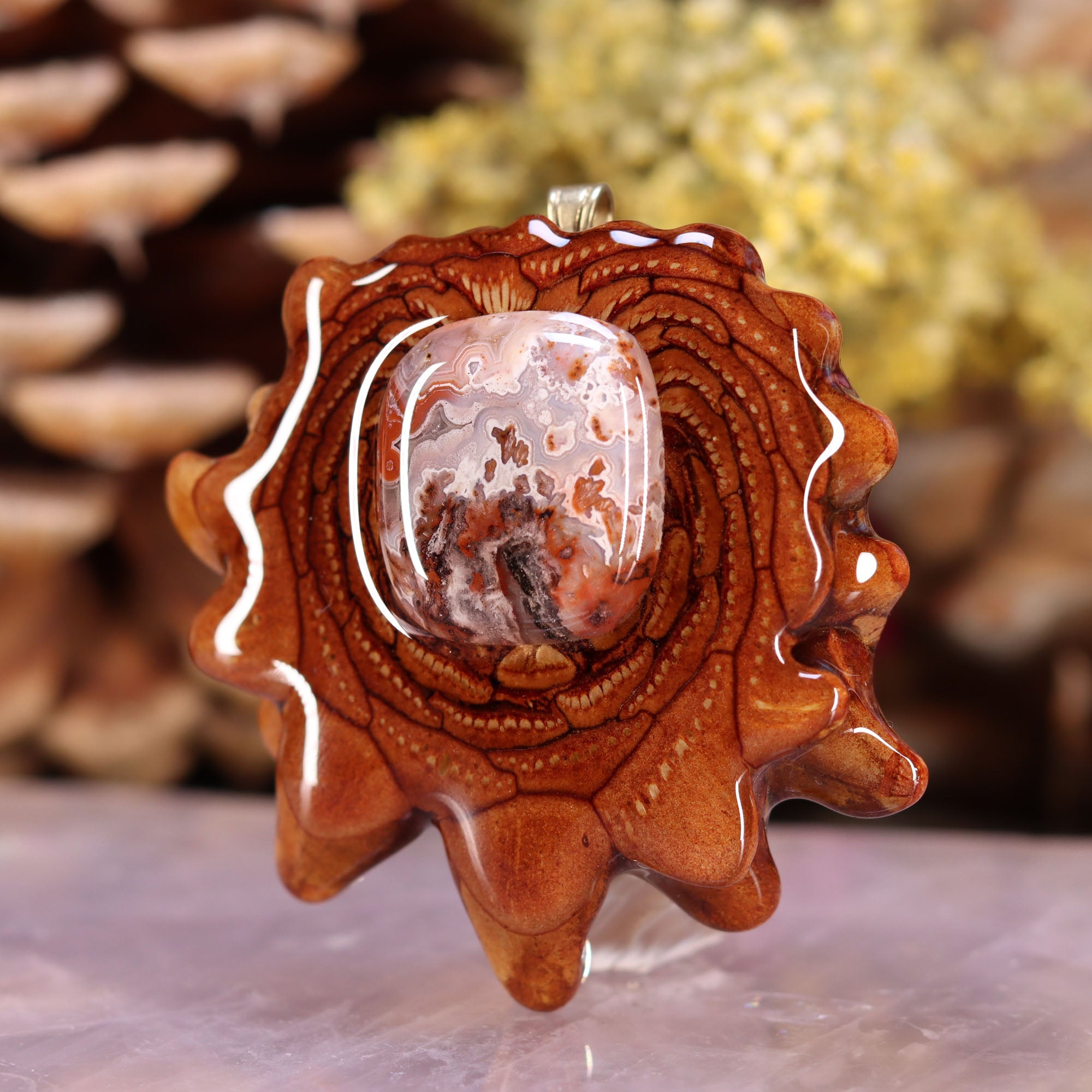 Every pinecone pendant is an elegant gift from Mother Nature -- unveiling the ornate Sacred Geometry hidden at the center of one of the world's densest Pinecones. Because only one cross-section is taken from the "heart" of each Cone, every pendant is absolutely unique, and truly one-of-a-kind.