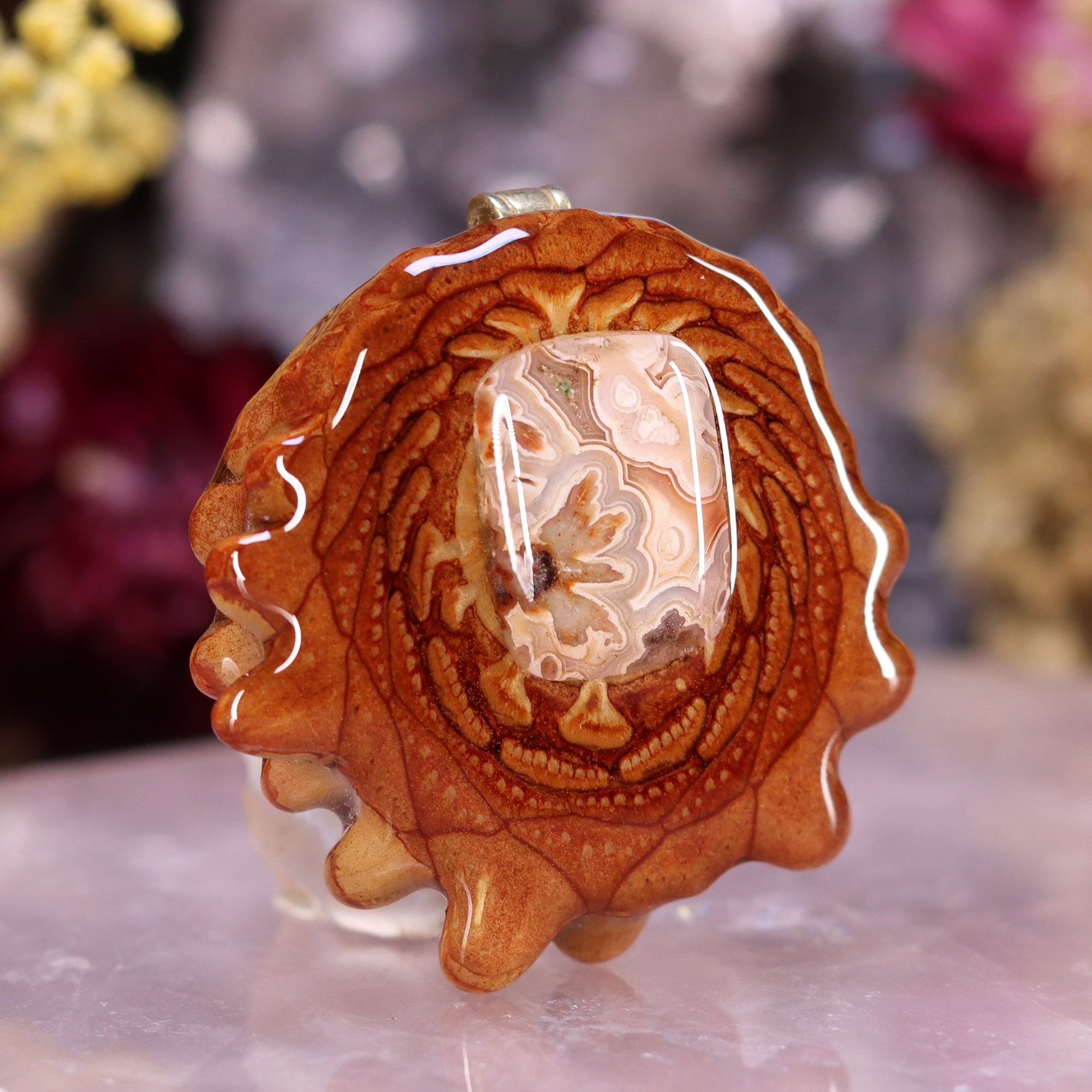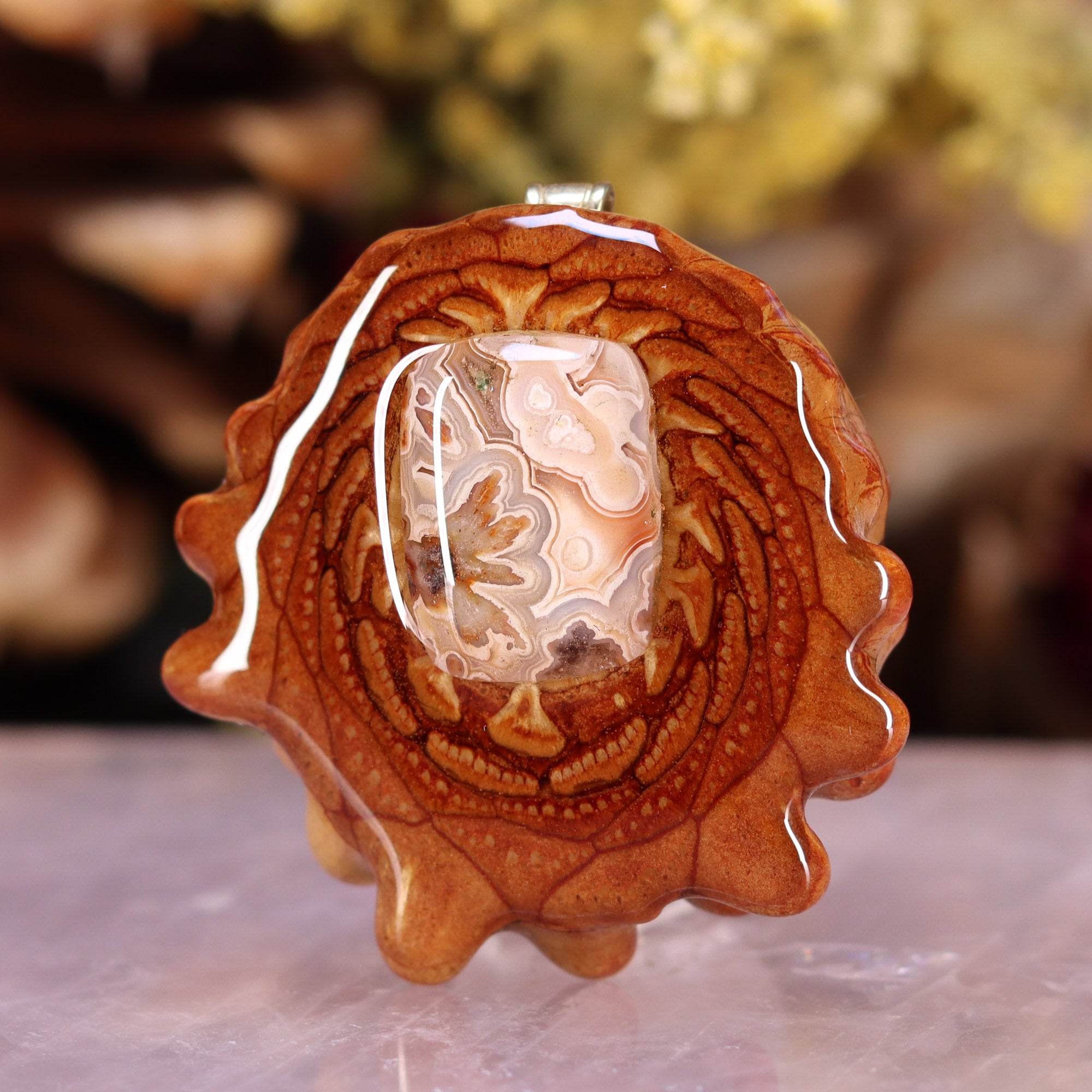 Every pinecone pendant is an elegant gift from Mother Nature -- unveiling the ornate Sacred Geometry hidden at the center of one of the world's densest Pinecones. Because only one cross-section is taken from the "heart" of each Cone, every pendant is absolutely unique, and truly one-of-a-kind.