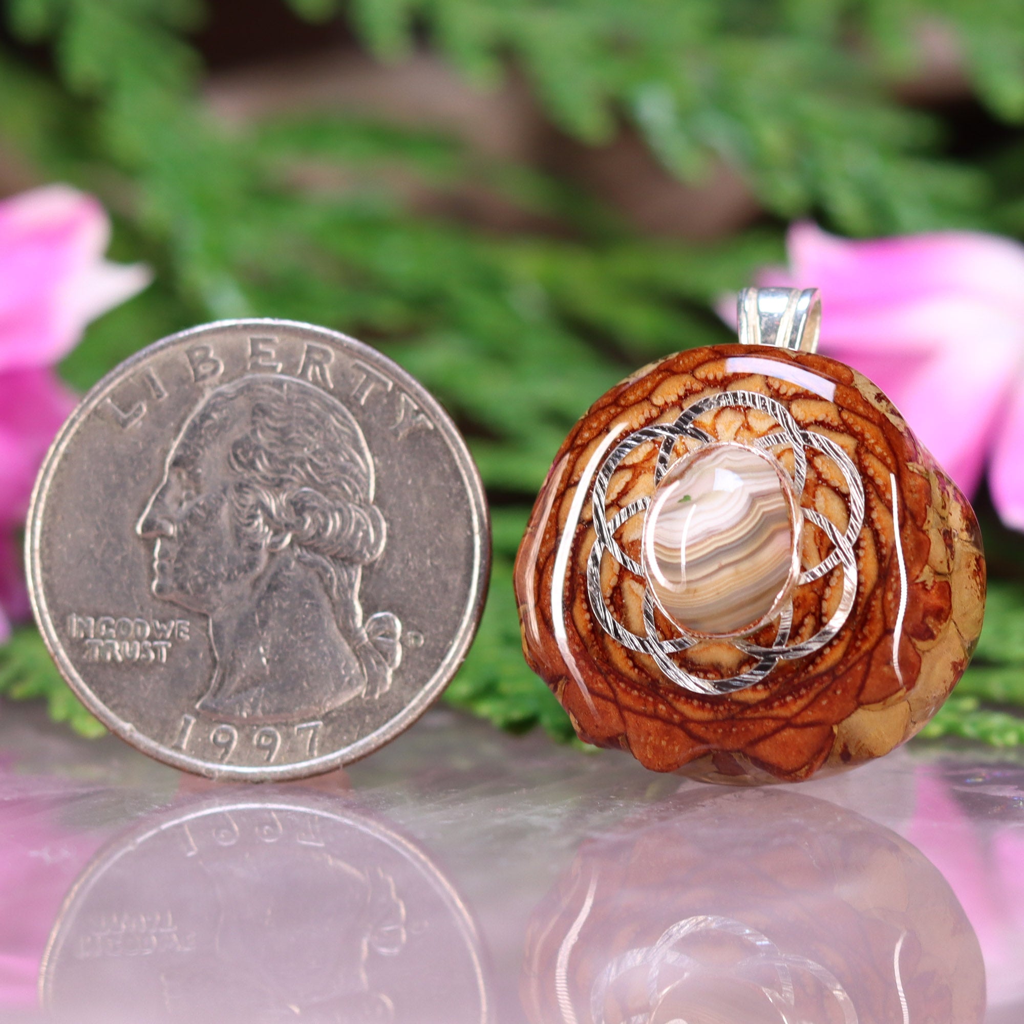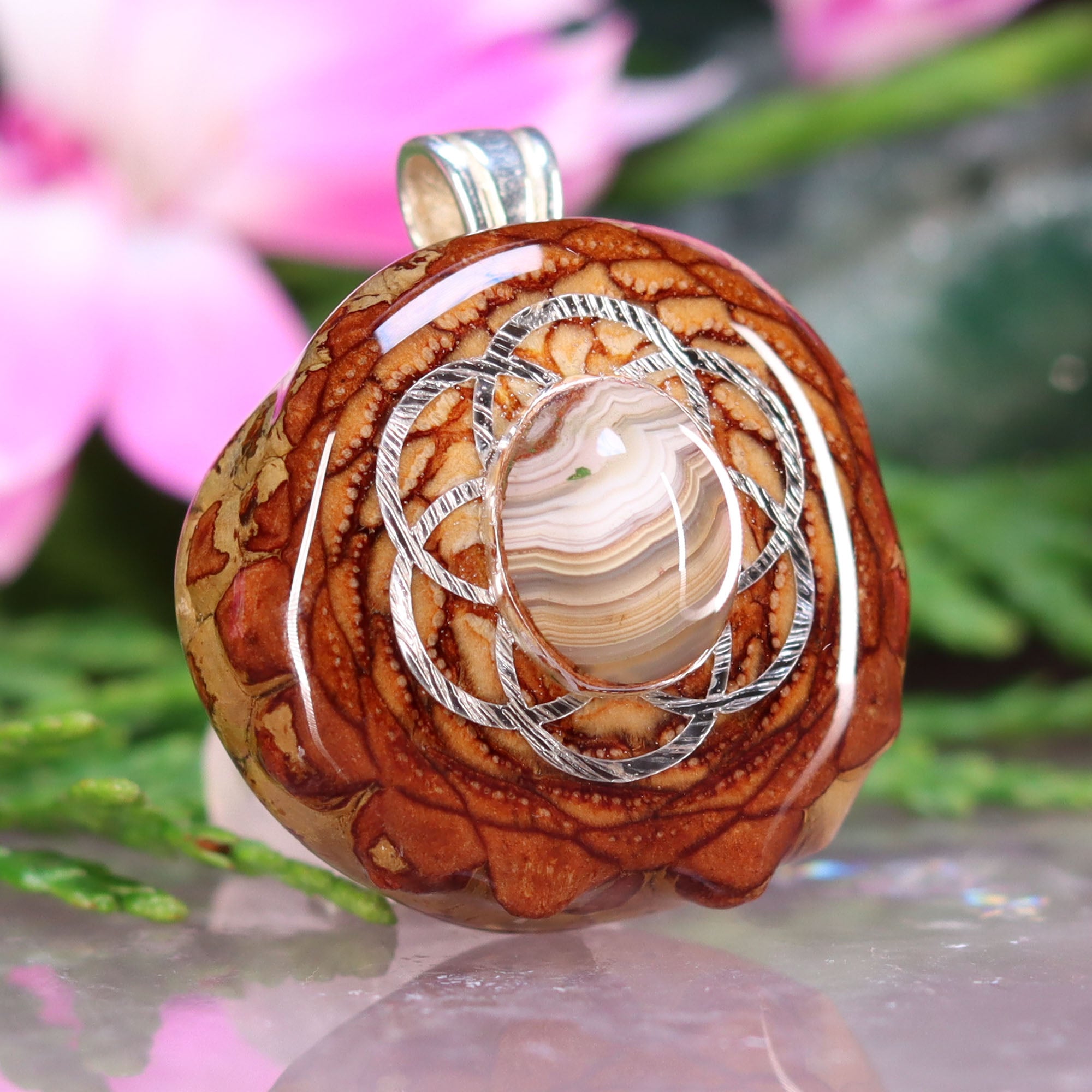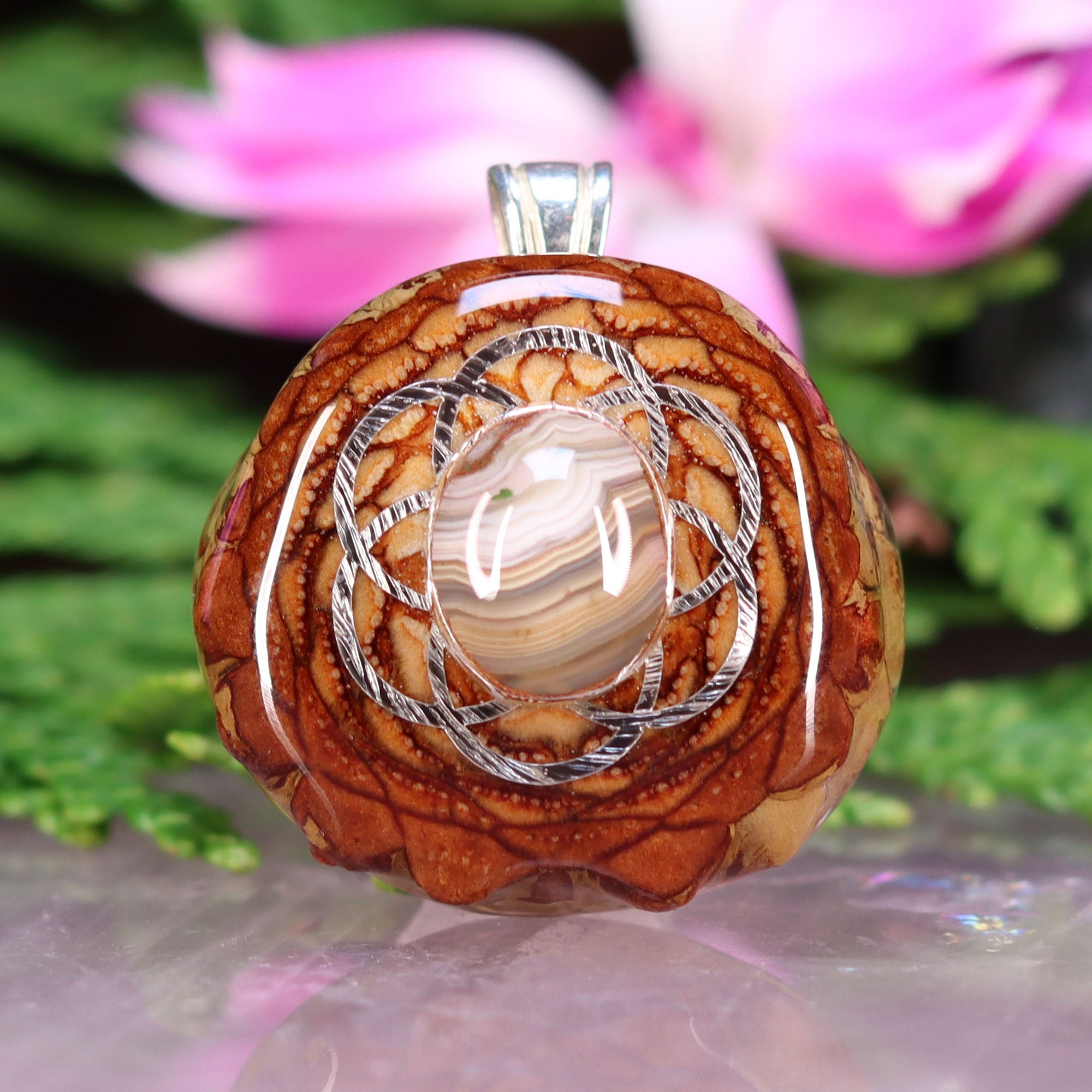 Every pinecone pendant is an elegant gift from Mother Nature -- unveiling the ornate Sacred Geometry hidden at the center of one of the world's densest Pinecones. Because only one cross-section is taken from the "heart" of each Cone, every pendant is absolutely unique, and truly one-of-a-kind.