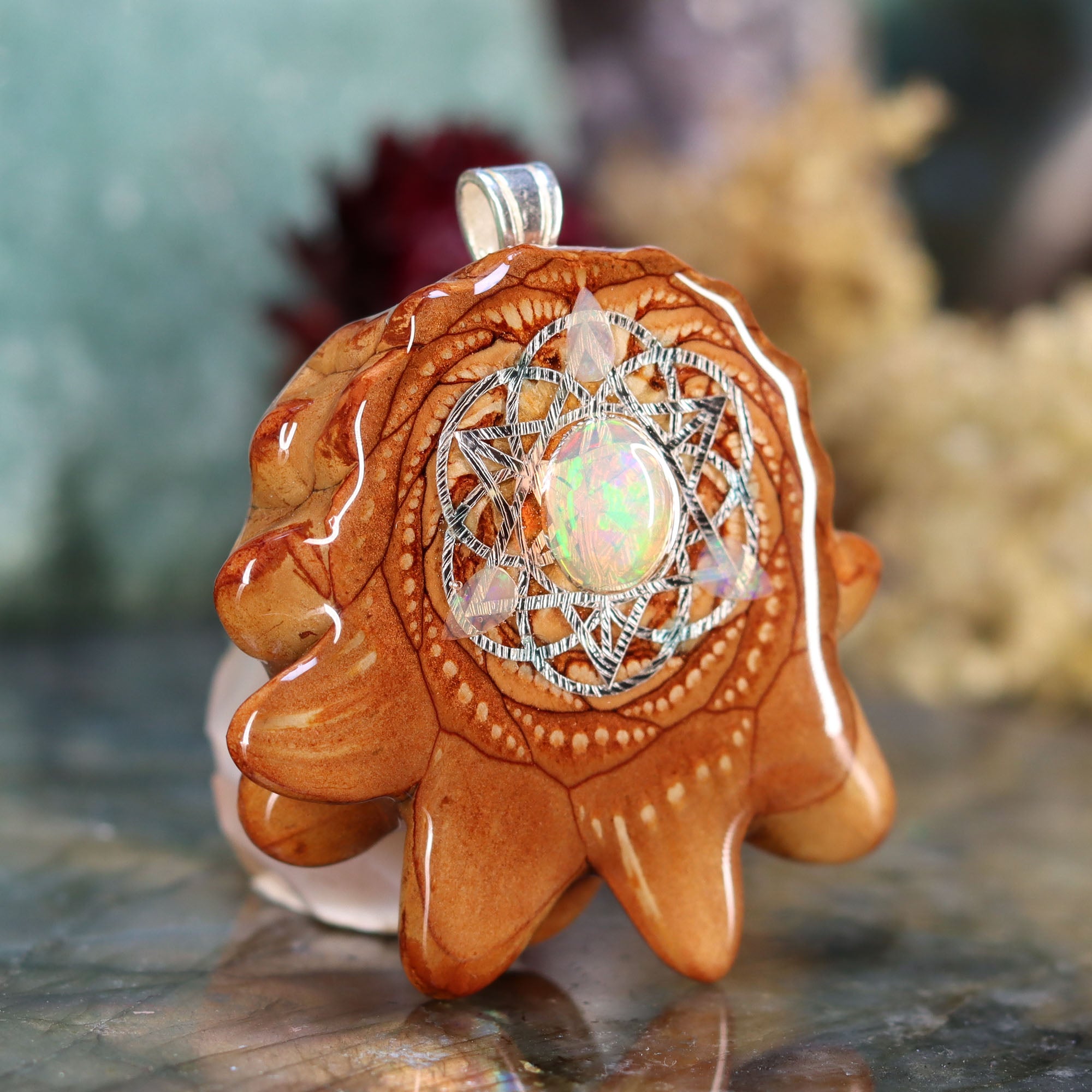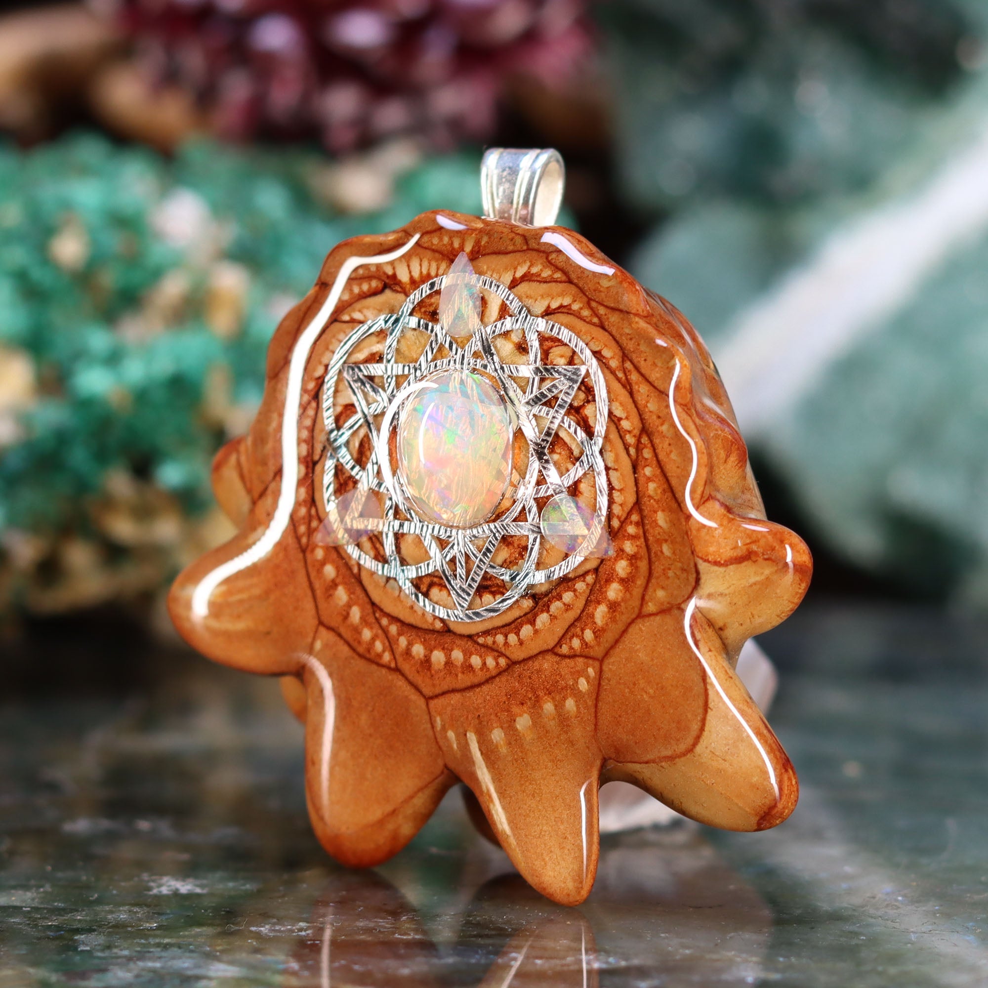 Every pinecone pendant is an elegant gift from Mother Nature -- unveiling the ornate Sacred Geometry hidden at the center of one of the world's densest Pinecones. Because only one cross-section is taken from the "heart" of each Cone, every pendant is absolutely unique, and truly one-of-a-kind.