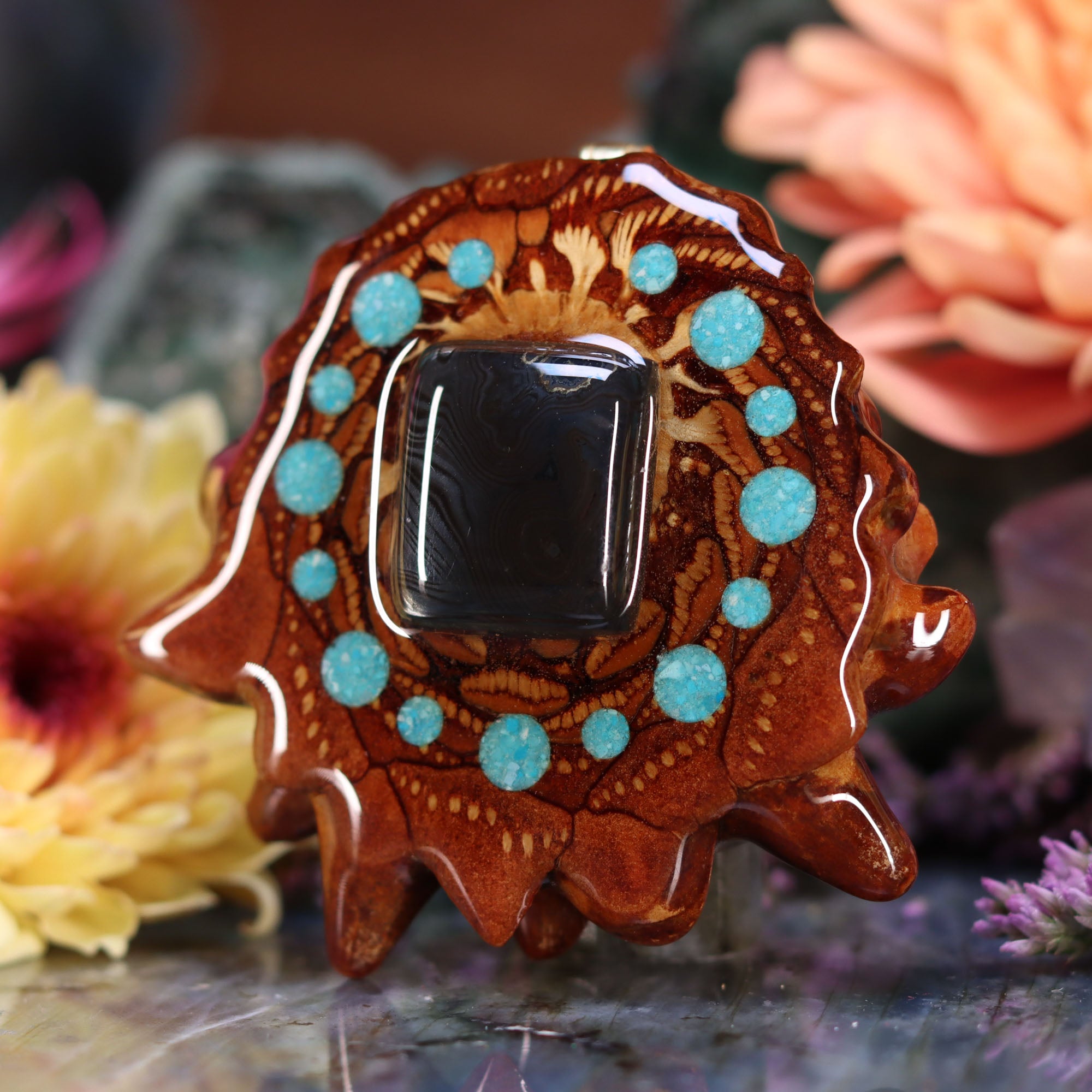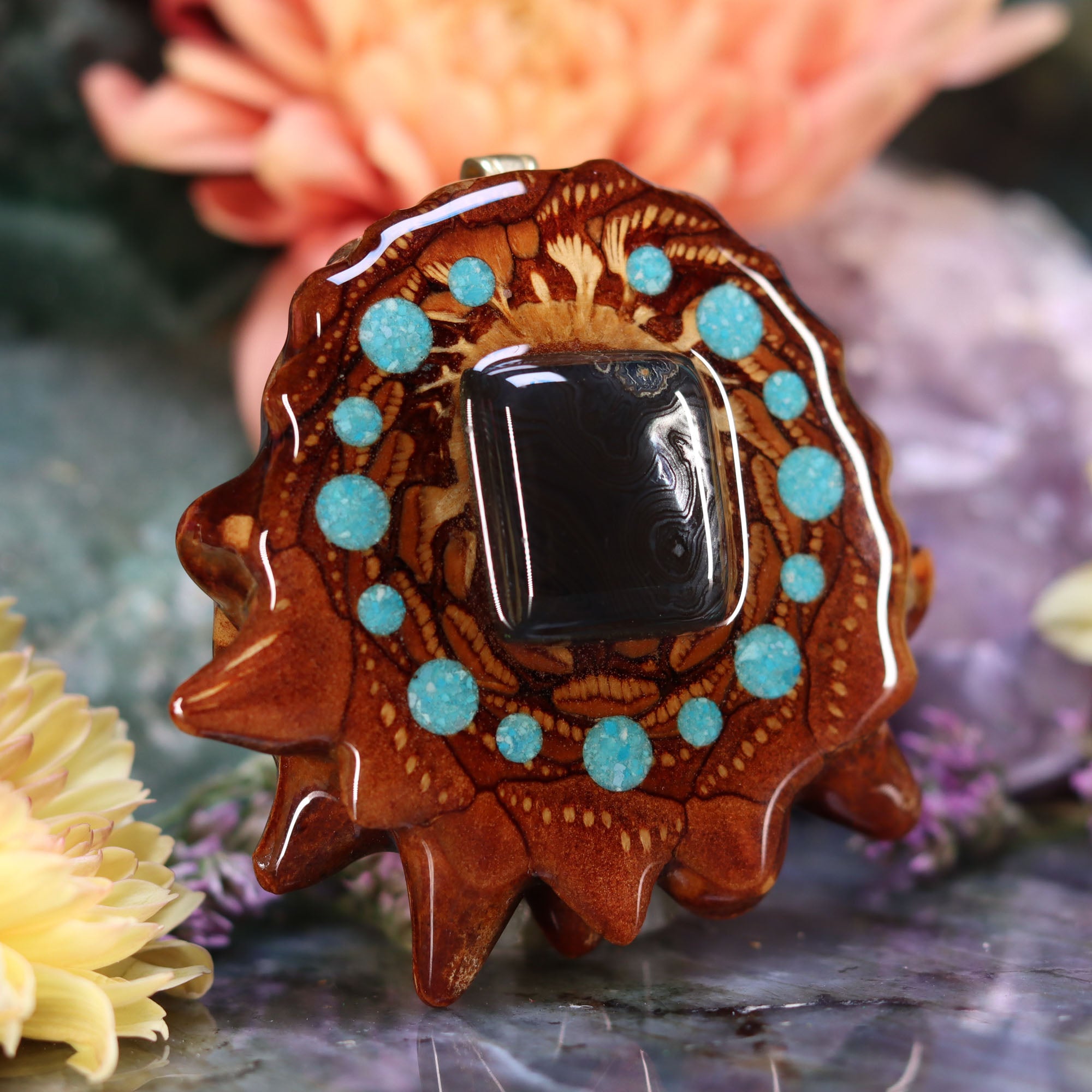 Every pinecone pendant is an elegant gift from Mother Nature -- unveiling the ornate Sacred Geometry hidden at the center of one of the world's densest Pinecones. Because only one cross-section is taken from the "heart" of each Cone, every pendant is absolutely unique, and truly one-of-a-kind.