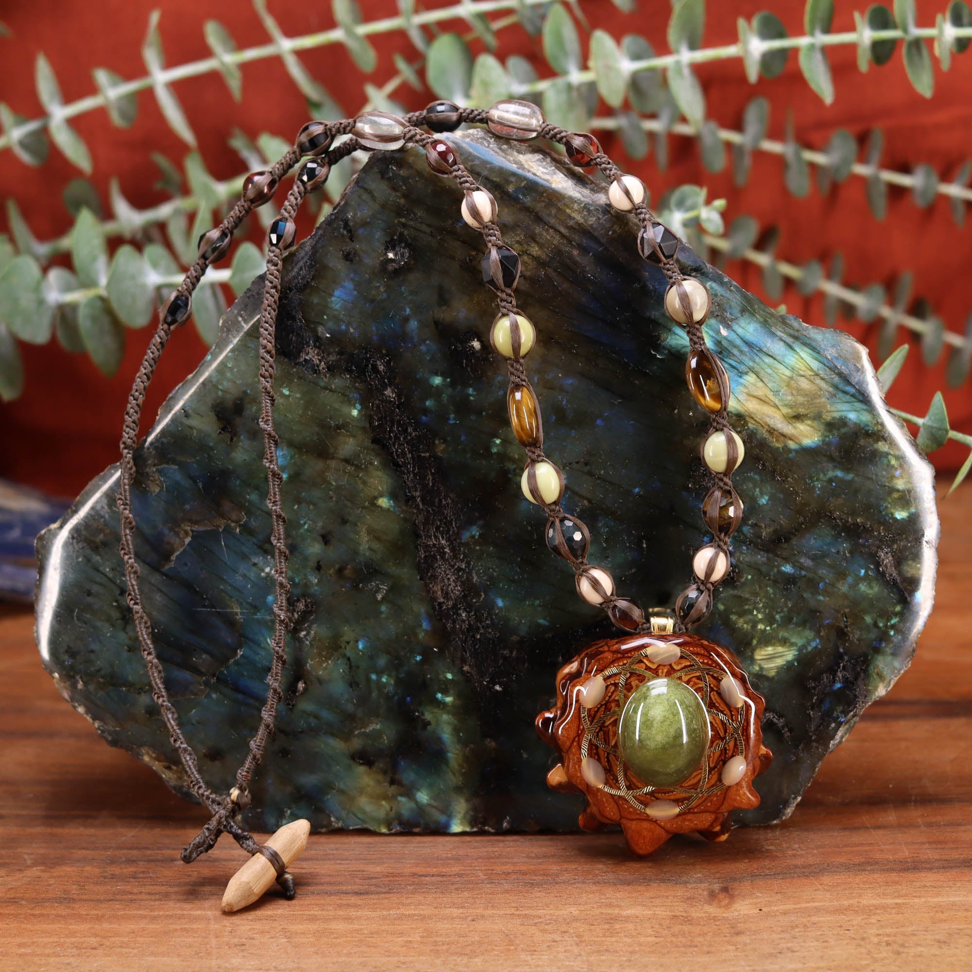Hand-woven in Bellingham, WA, this necklace features a Jade with Gold Seed of Life Multi-Stone pendant lovingly strung with Red Tiger's Eye, White Jasper, Yellow Tiger's Eye, Lemon Chrysoprase, Matte Onyx, Fluorite and Onyx beads to activate and energize body, mind and spirit!