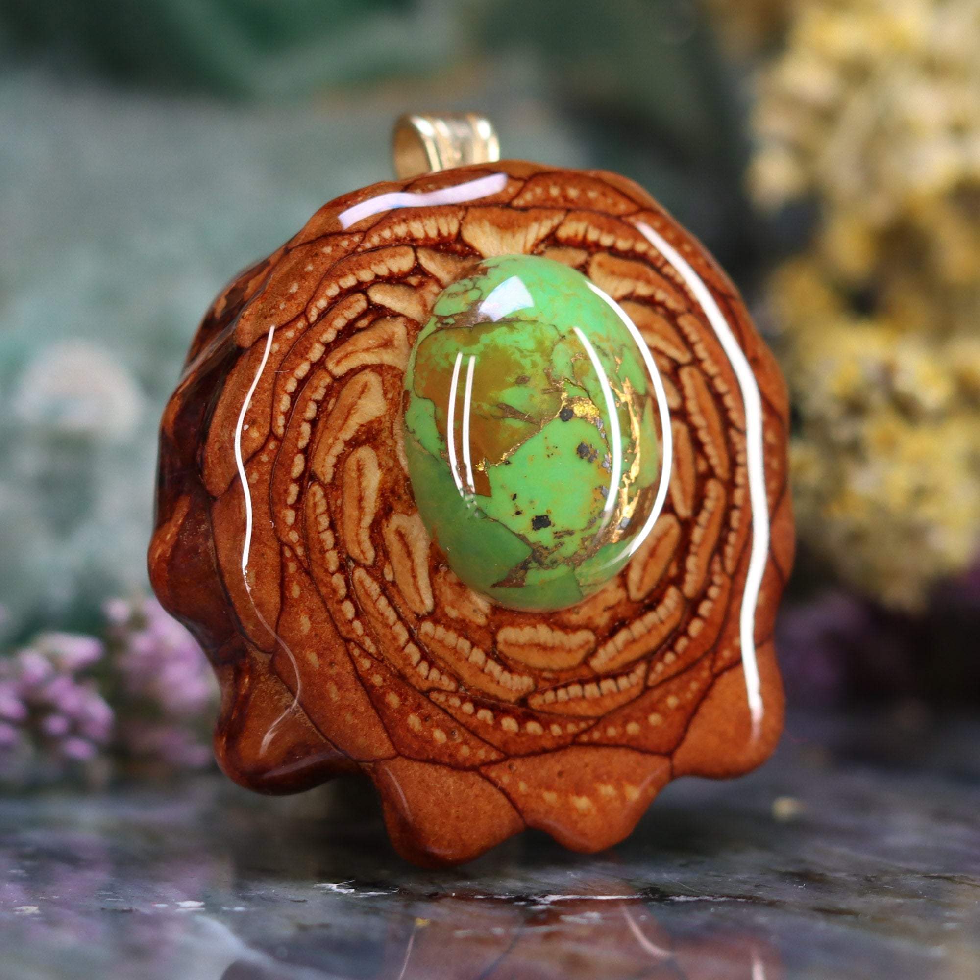 Every pinecone pendant is an elegant gift from Mother Nature -- unveiling the ornate Sacred Geometry hidden at the center of one of the world's densest Pinecones. Because only one cross-section is taken from the "heart" of each Cone, every pendant is absolutely unique, and truly one-of-a-kind.