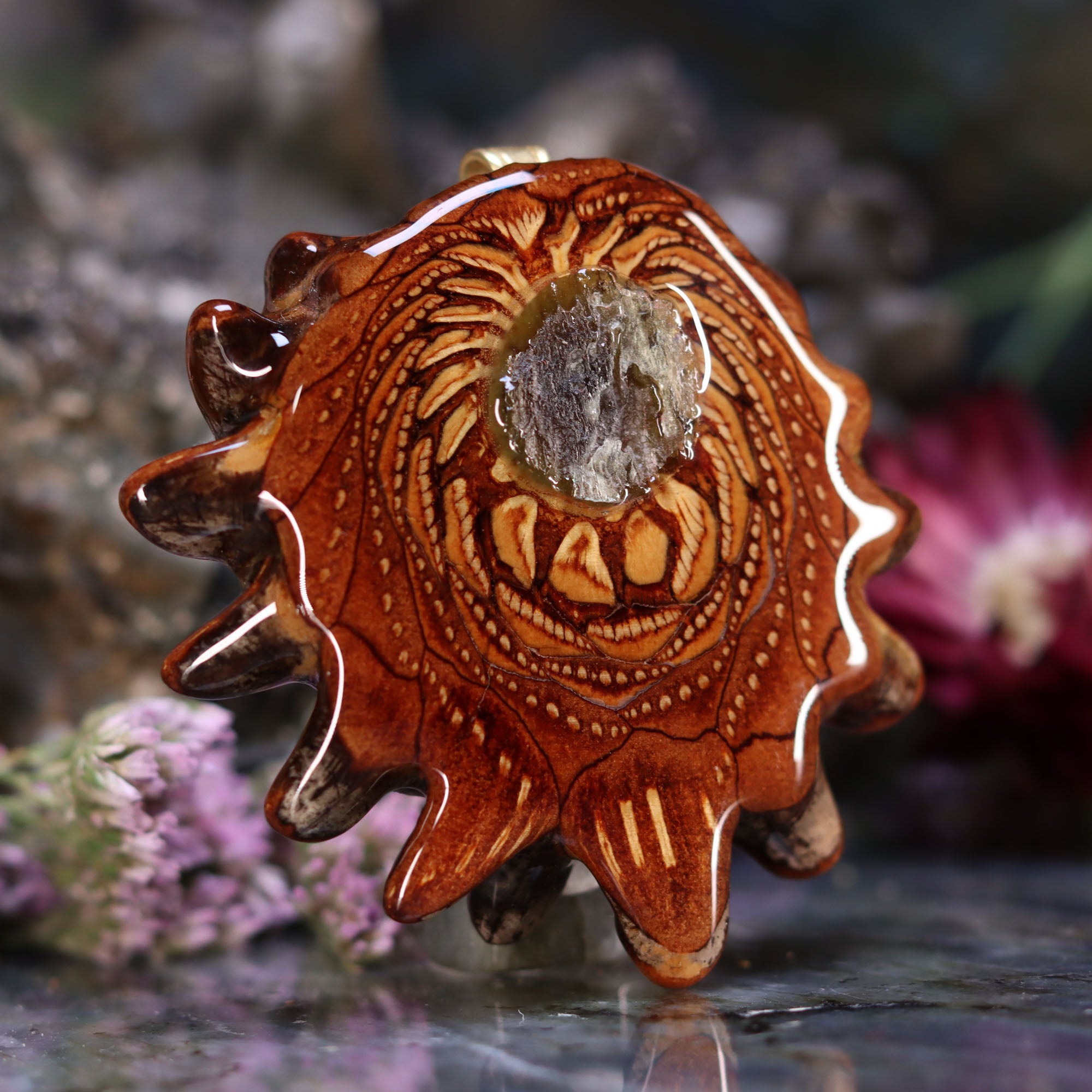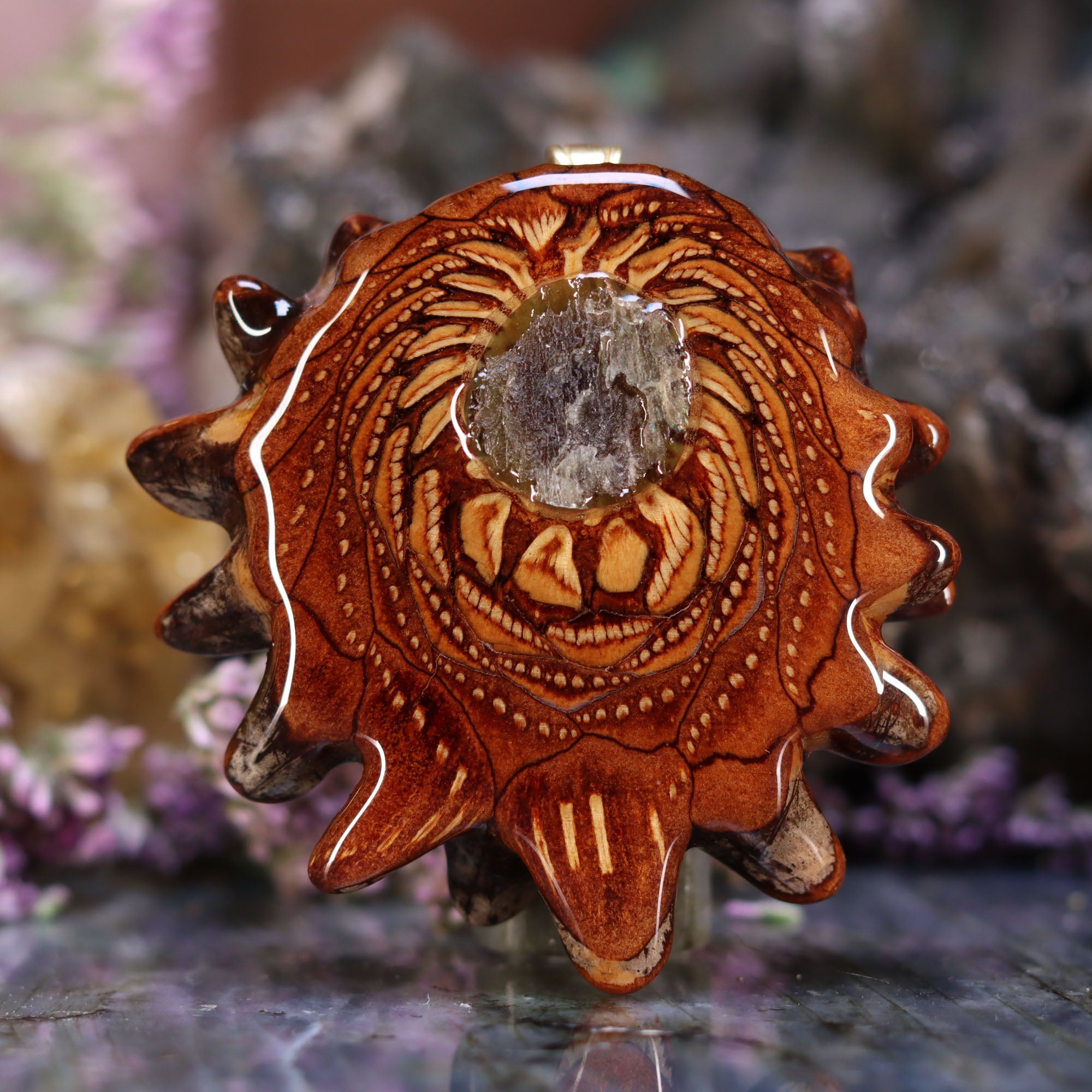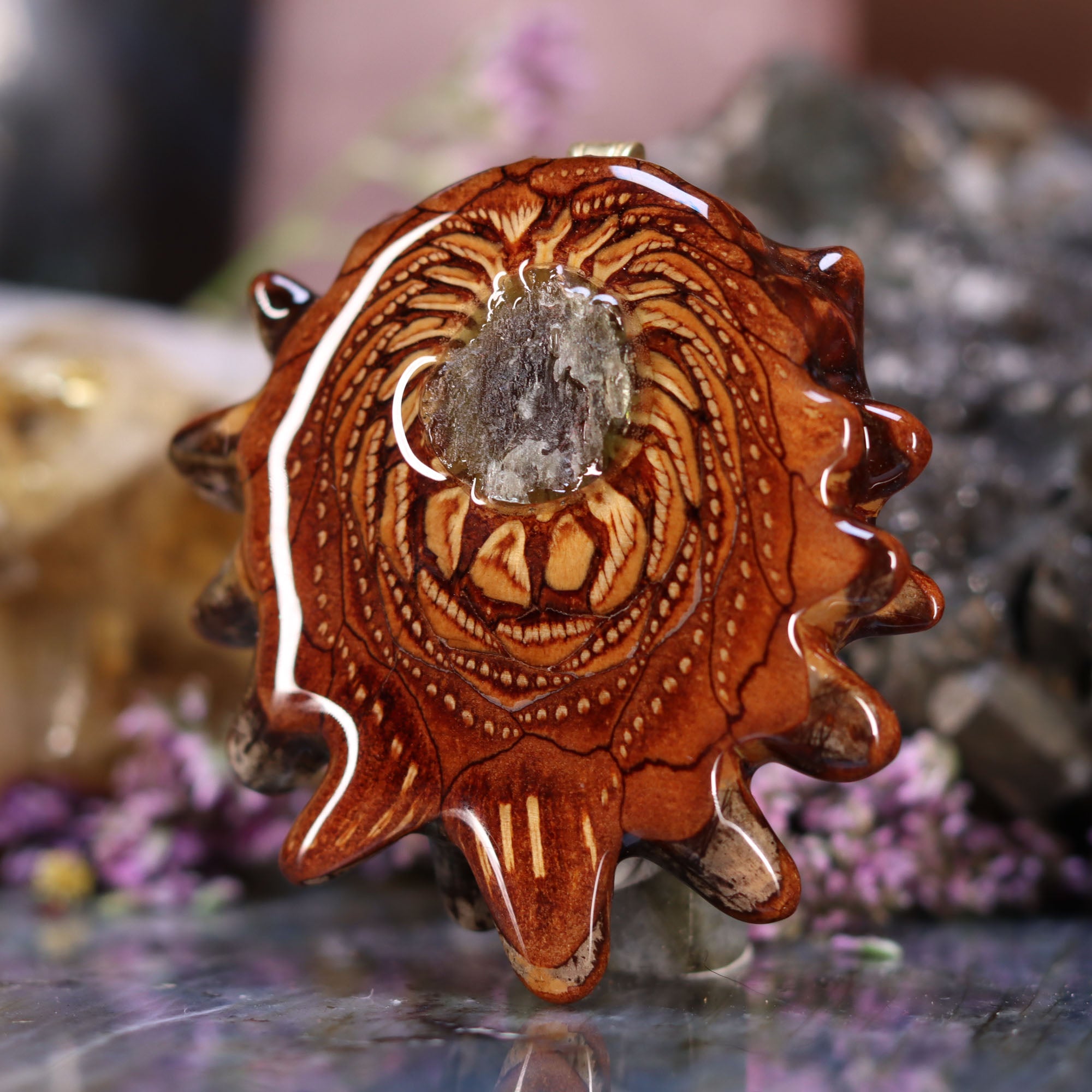 Every pinecone pendant is an elegant gift from Mother Nature -- unveiling the ornate Sacred Geometry hidden at the center of one of the world's densest Pinecones. Because only one cross-section is taken from the "heart" of each Cone, every pendant is absolutely unique, and truly one-of-a-kind.