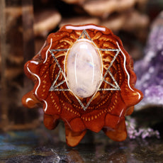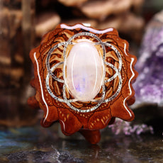 As its name suggests, Moonstone is strongly connected to the archetypal feminine energies of the moon, intuition, and empathy. It helps reconnect with the softness and wisdom of the great mother if one gets caught up in stress, fixation, or aggression. It is recognized as a powerful tool to make conscious the unconscious, and traditionally has been worn as a pendant to encourage the fruition of one's psychic gifts, as well as to facilitate lucid dreaming.
