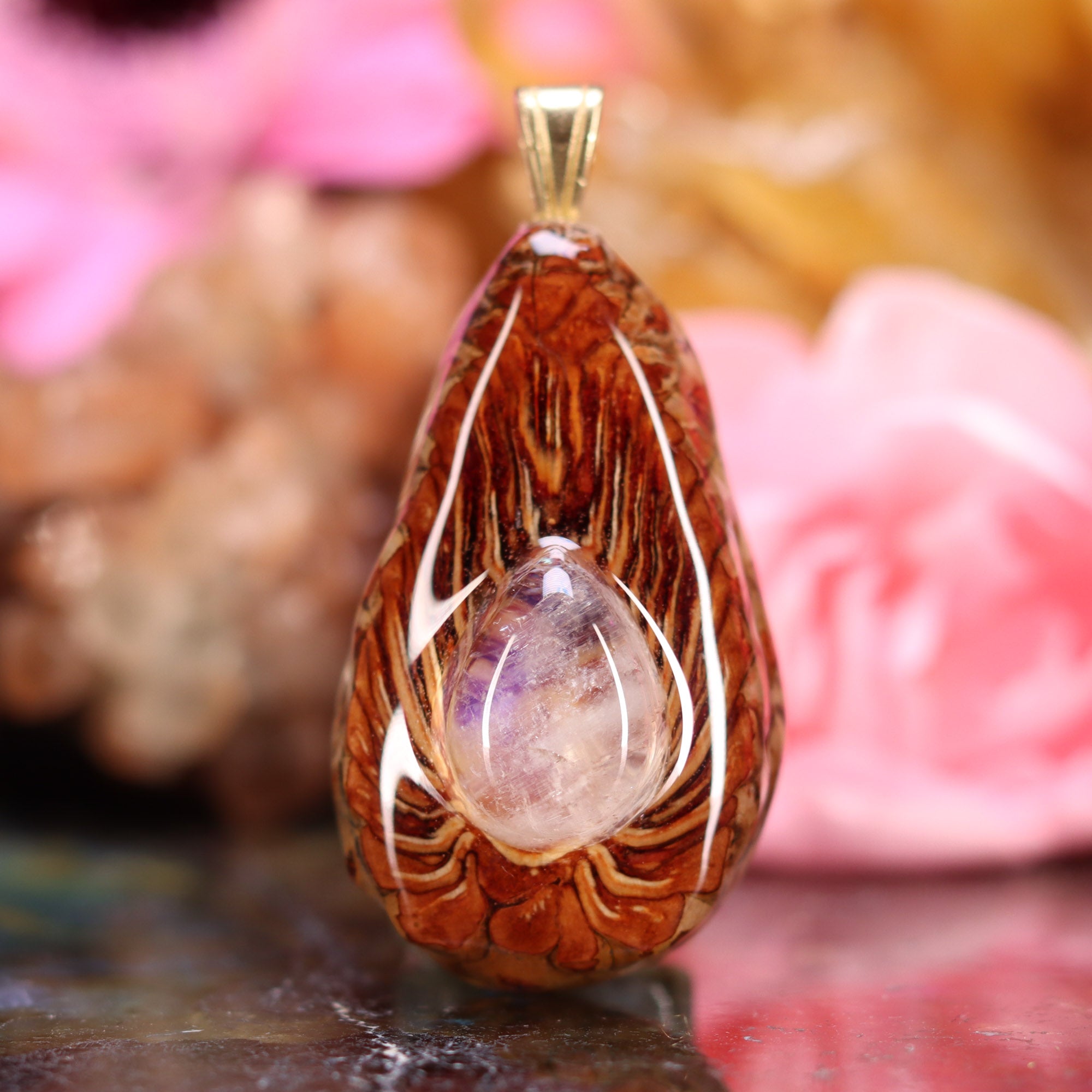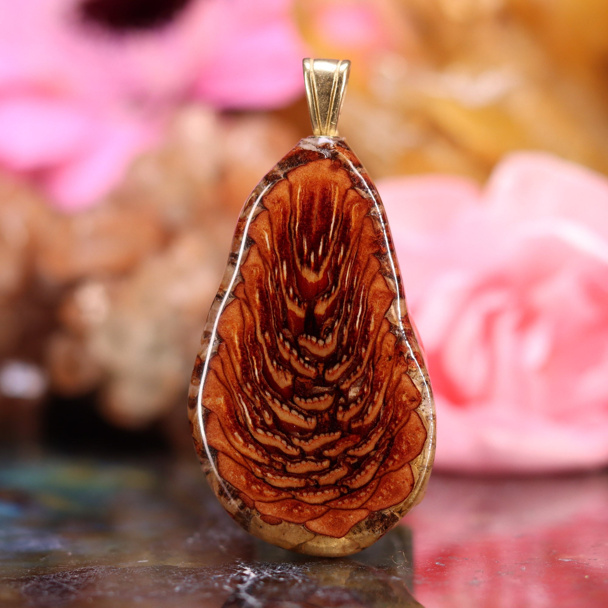 Every pinecone pendant is an elegant gift from Mother Nature -- unveiling the ornate Sacred Geometry hidden at the center of one of the world's densest Pinecones. Because only one cross-section is taken from the "heart" of each Cone, every pendant is absolutely unique, and truly one-of-a-kind.