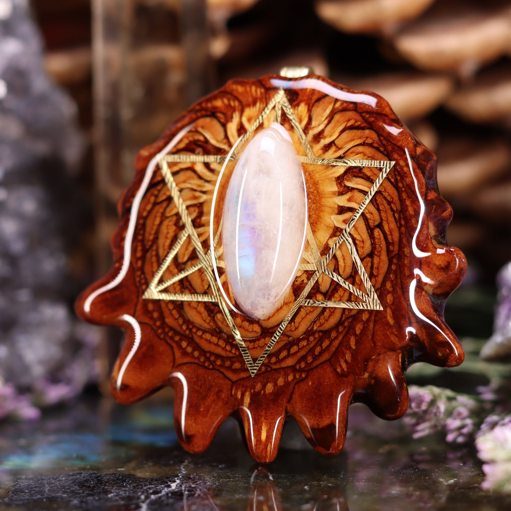 Every pinecone pendant is an elegant gift from Mother Nature -- unveiling the ornate Sacred Geometry hidden at the center of one of the world's densest Pinecones. Because only one cross-section is taken from the "heart" of each Cone, every pendant is absolutely unique, and truly one-of-a-kind.