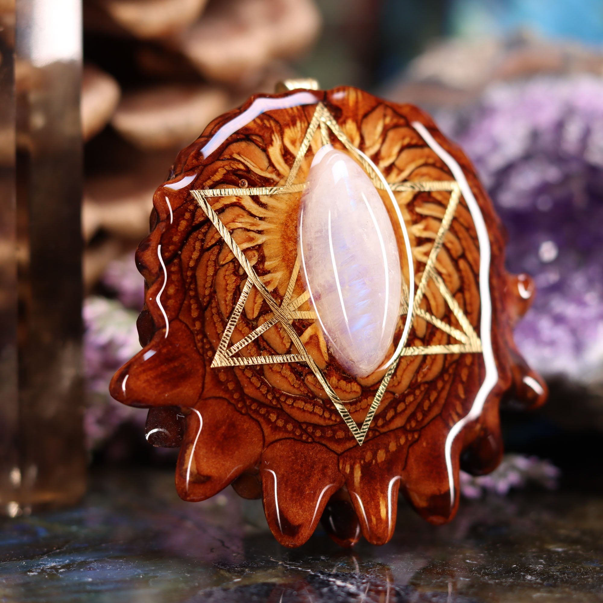 As its name suggests, Moonstone is strongly connected to the archetypal feminine energies of the moon, intuition, and empathy. It helps reconnect with the softness and wisdom of the great mother if one gets caught up in stress, fixation, or aggression. It is recognized as a powerful tool to make conscious the unconscious, and traditionally has been worn as a pendant to encourage the fruition of one's psychic gifts, as well as to facilitate lucid dreaming.