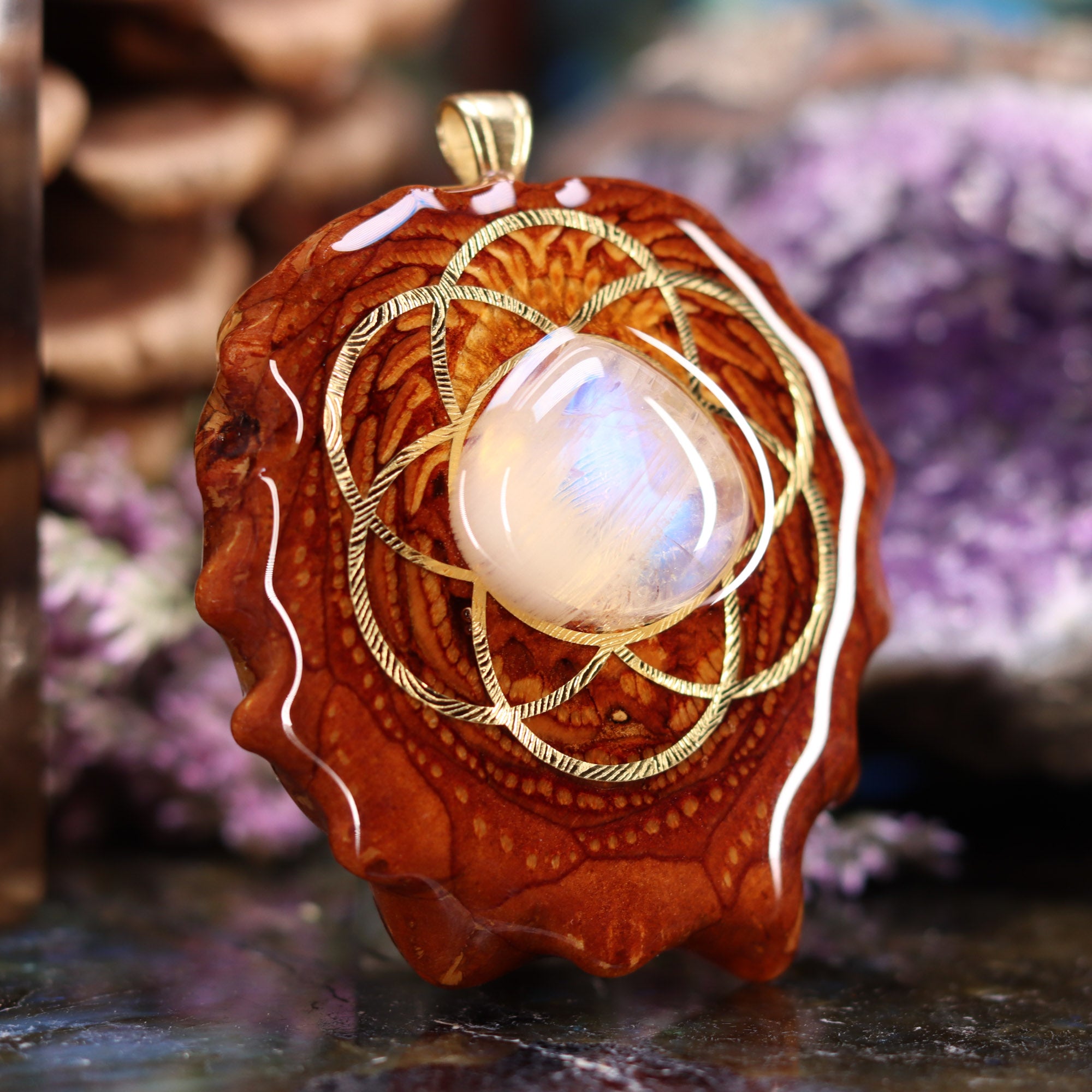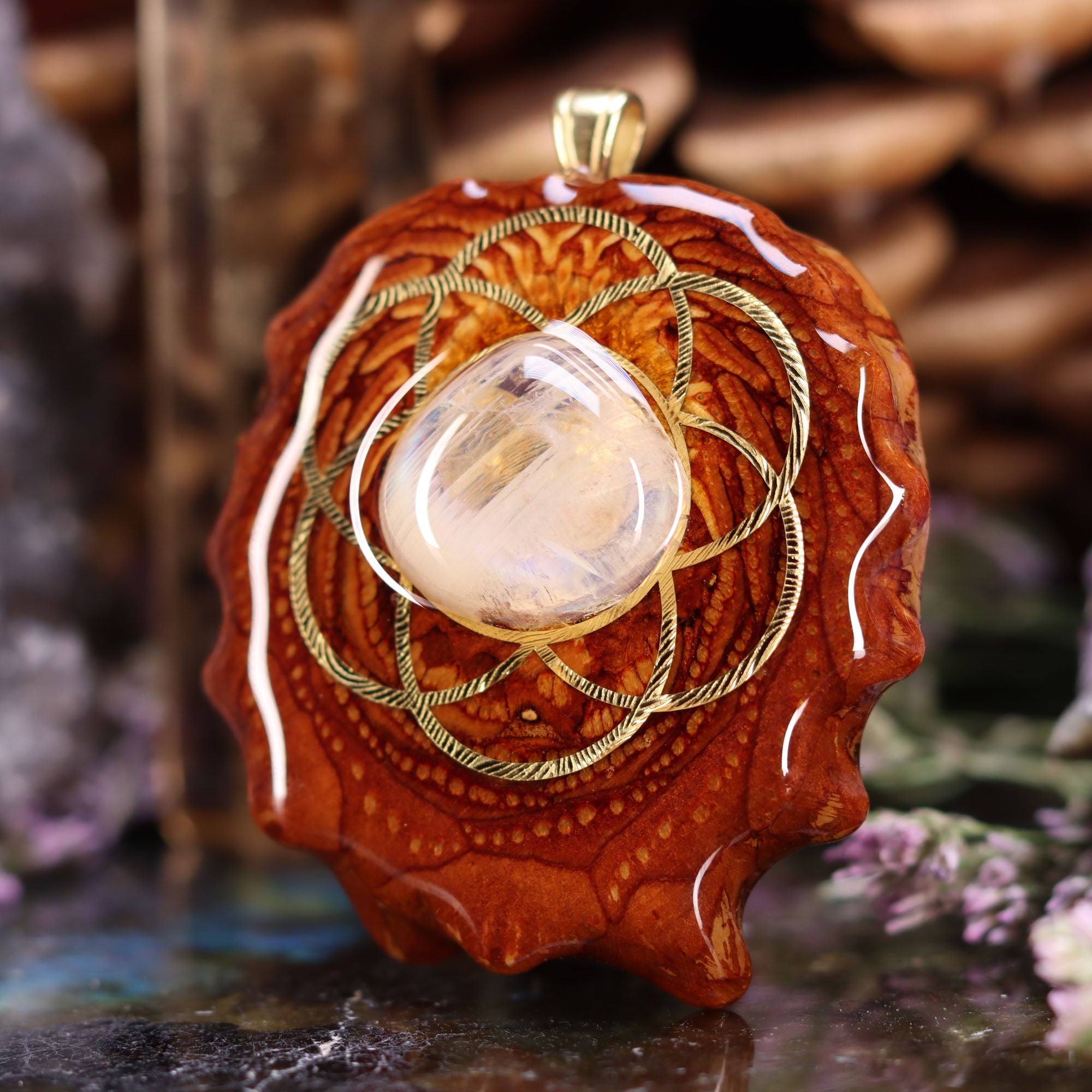 As its name suggests, Moonstone is strongly connected to the archetypal feminine energies of the moon, intuition, and empathy. It helps reconnect with the softness and wisdom of the great mother if one gets caught up in stress, fixation, or aggression. It is recognized as a powerful tool to make conscious the unconscious, and traditionally has been worn as a pendant to encourage the fruition of one's psychic gifts, as well as to facilitate lucid dreaming.