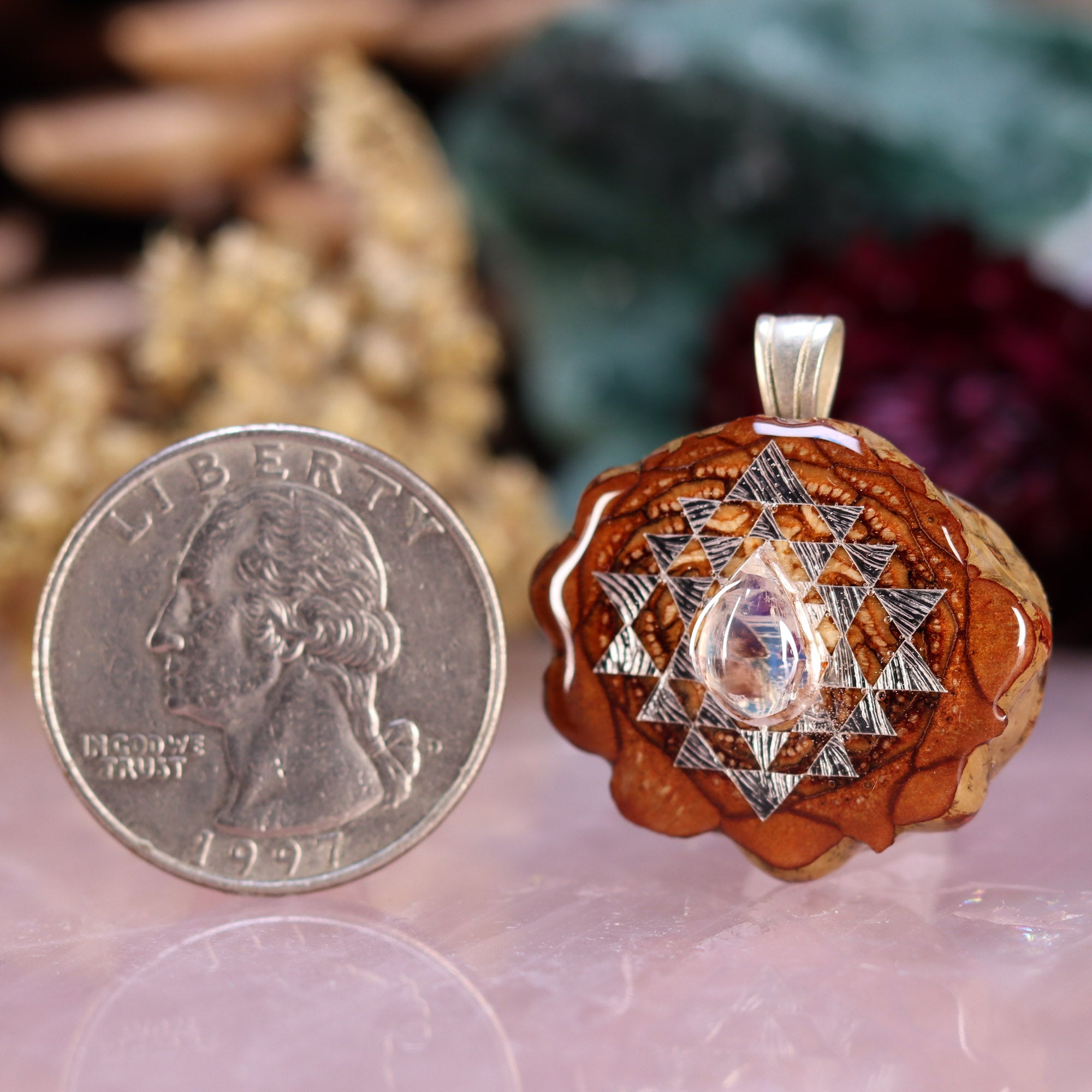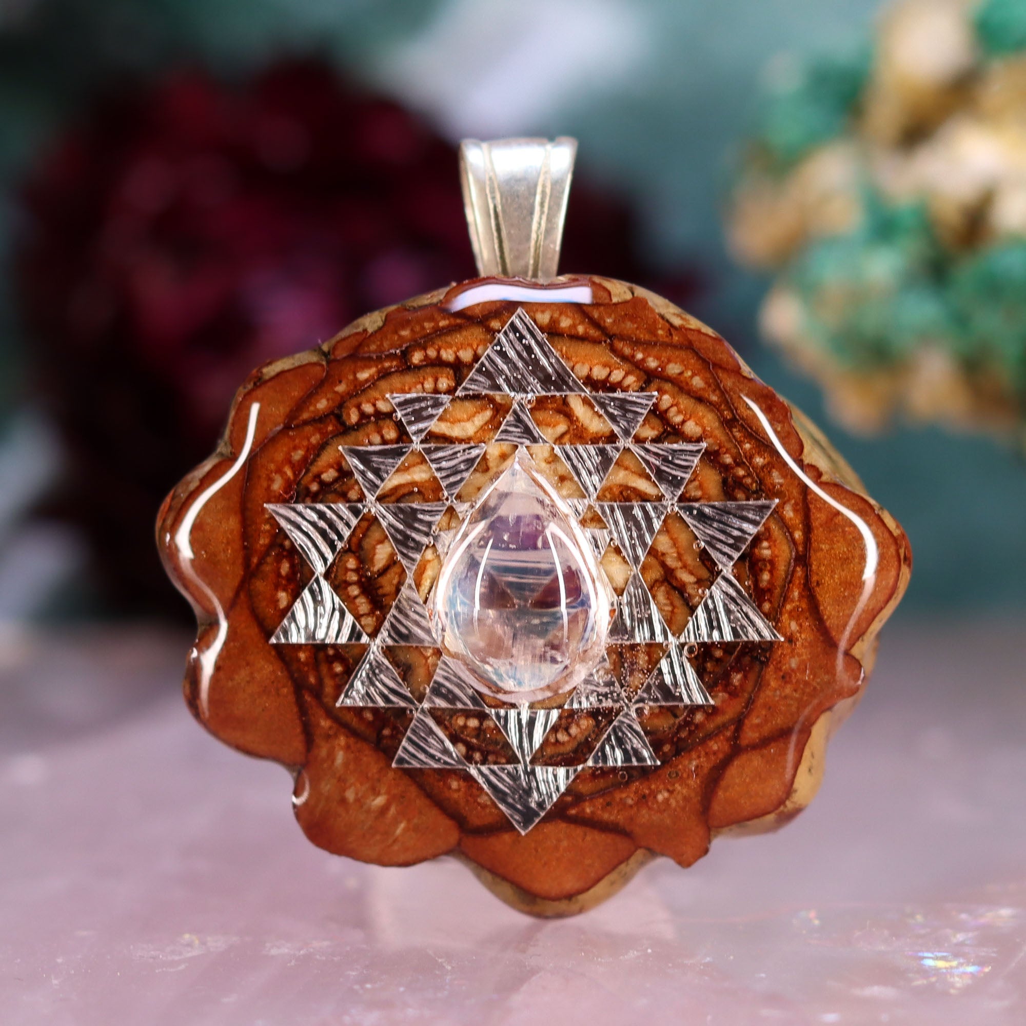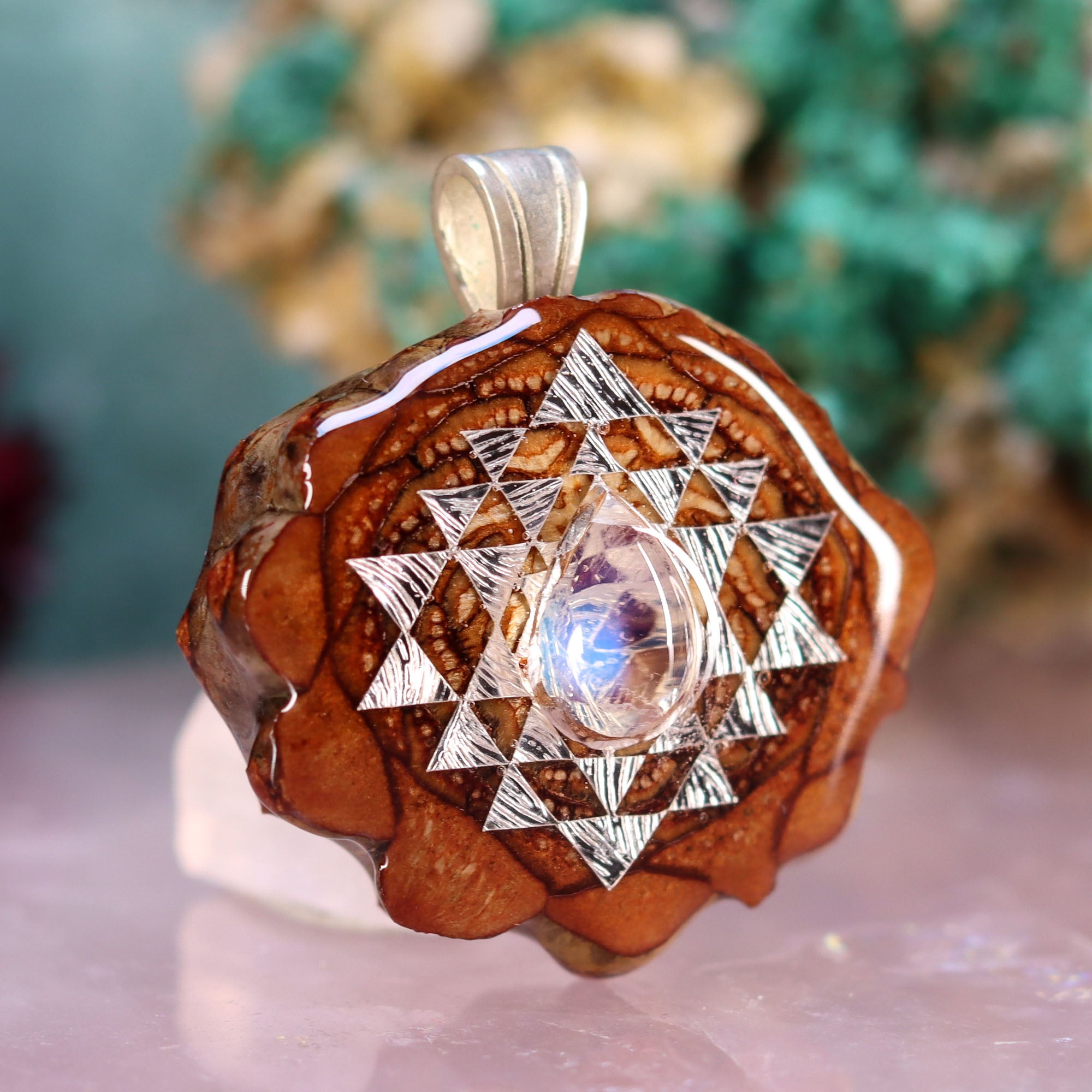 This piece bears a Sterling Silver Sri Yantra (literally meaning "holy instrument") Mandala, symbolizing the junction between the physical universe and its unmanifest source according to Hindu Mysticism. Four triangles face upwards to represent the Divine Masculine (Shiva), and five triangles face downwards to represent the Divine Feminine (Shakti). The Sri Yantra is often referred to as the Chakra Raja – King of all Chakras – making it a supreme instrument in the path of spiritual advancement.