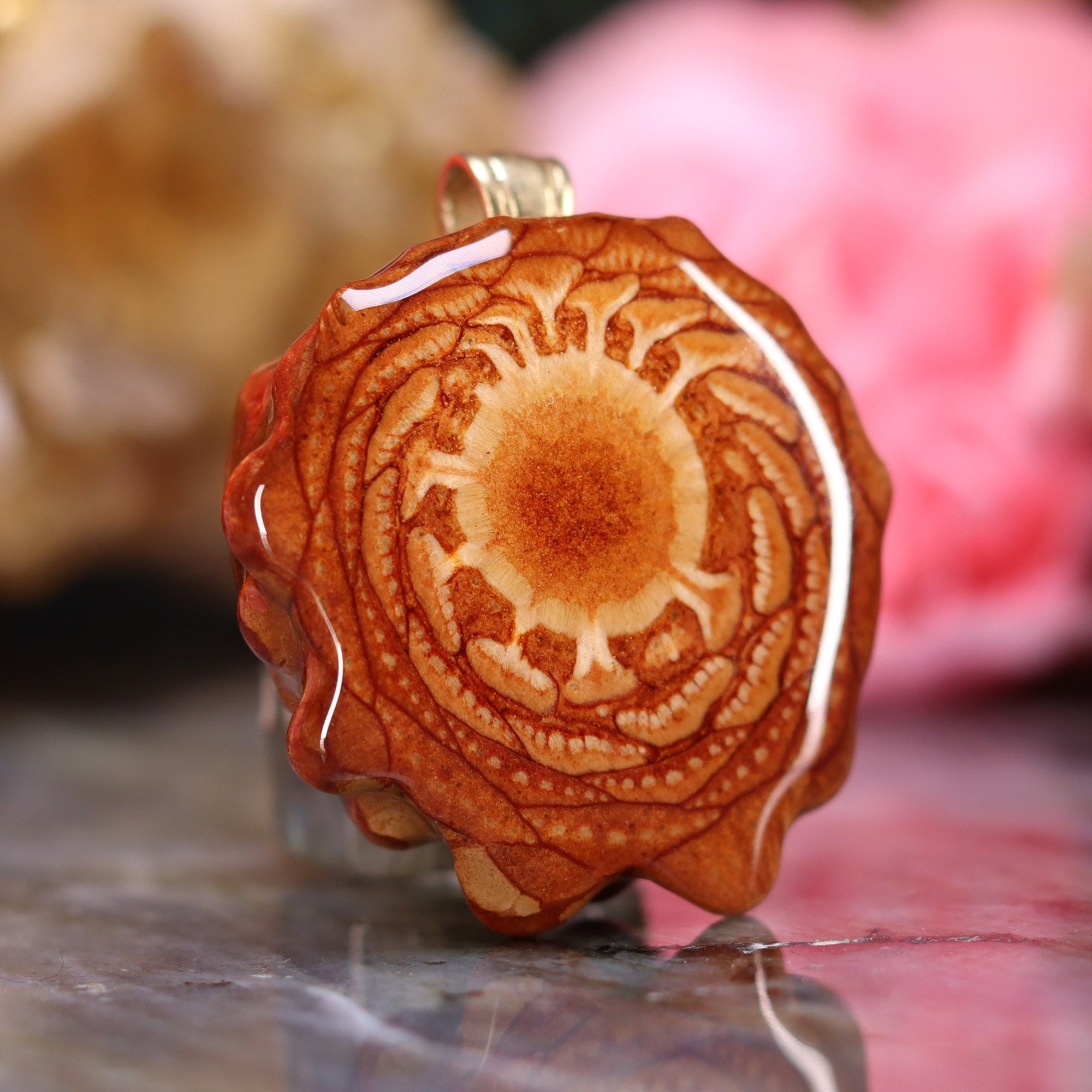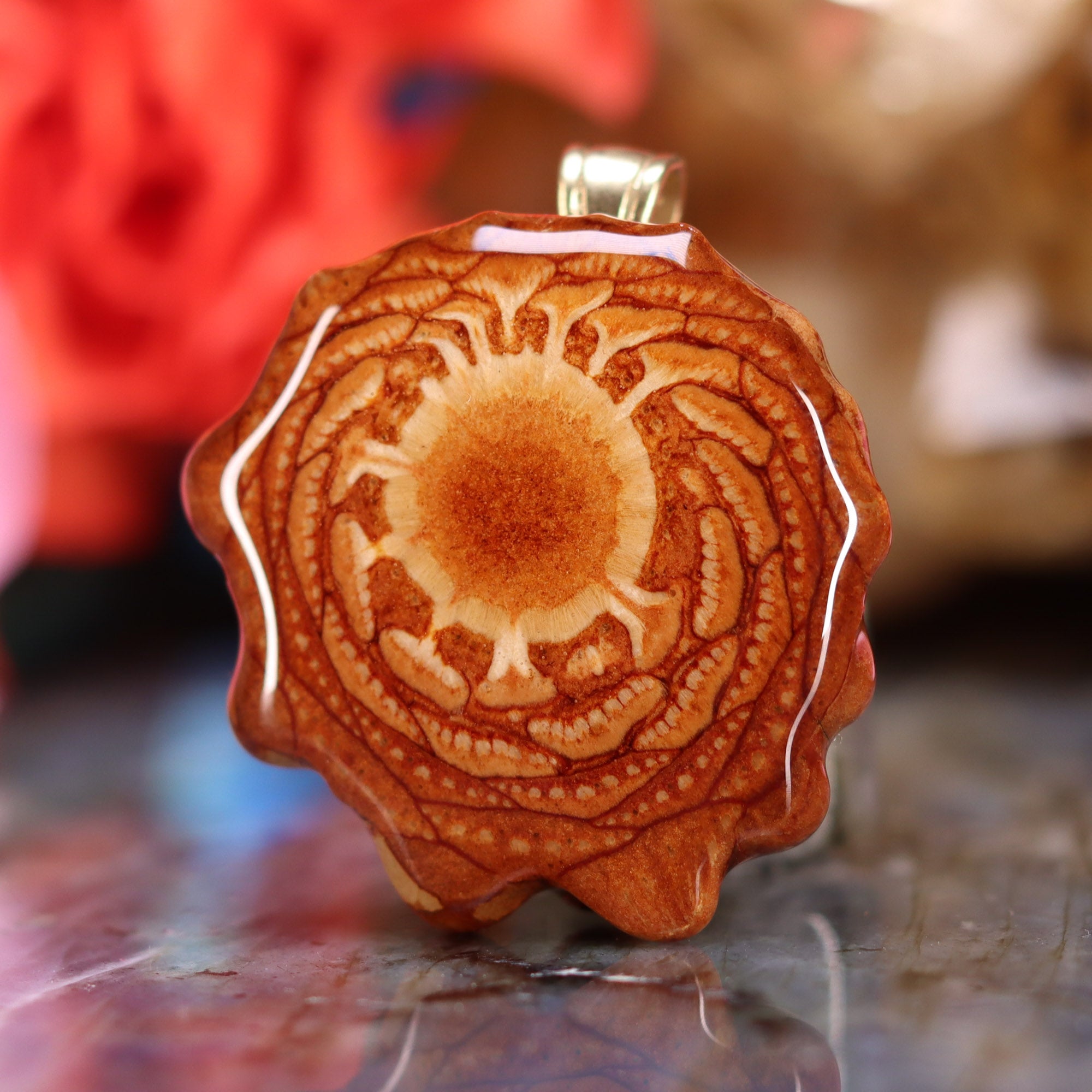 Every pinecone pendant is an elegant gift from Mother Nature -- unveiling the ornate Sacred Geometry hidden at the center of the world's densest Pinecone. Because only one cross-section is taken from the "heart" of each Cone, every pendant is absolutely unique, and truly the one-of-a-kind.