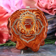 This pinecone bears a 24k Gold emblem of the 3rd chakra, the Solar Plexus Chakra. Known as “Manipura” (“the place of resplendence”) in Sanskrit, the 3rd chakra is characterized by the Archetype of the Warrior, and is associated with self-esteem, transformation, and the ability to assert one’s Will in the world.
