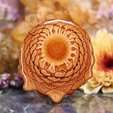 This pinecone bears a Sterling Silver emblem of the 3rd chakra, the Solar Plexus Chakra. Known as “Manipura” (“the place of resplendence”) in Sanskrit, the 3rd chakra is characterized by the Archetype of the Warrior, and is associated with self-esteem, transformation, and the ability to assert one’s Will in the world.