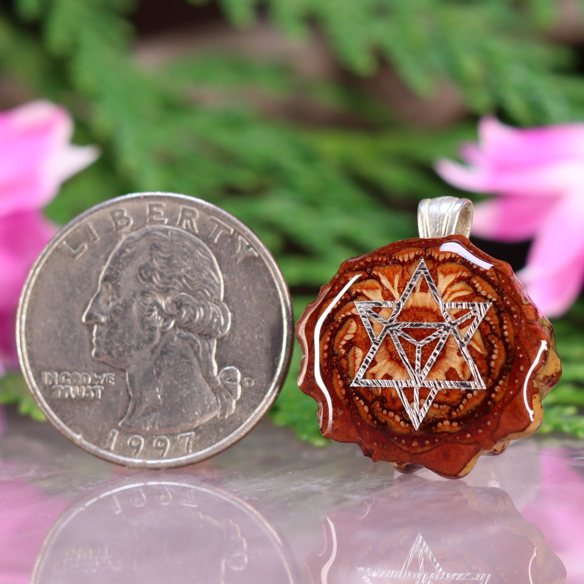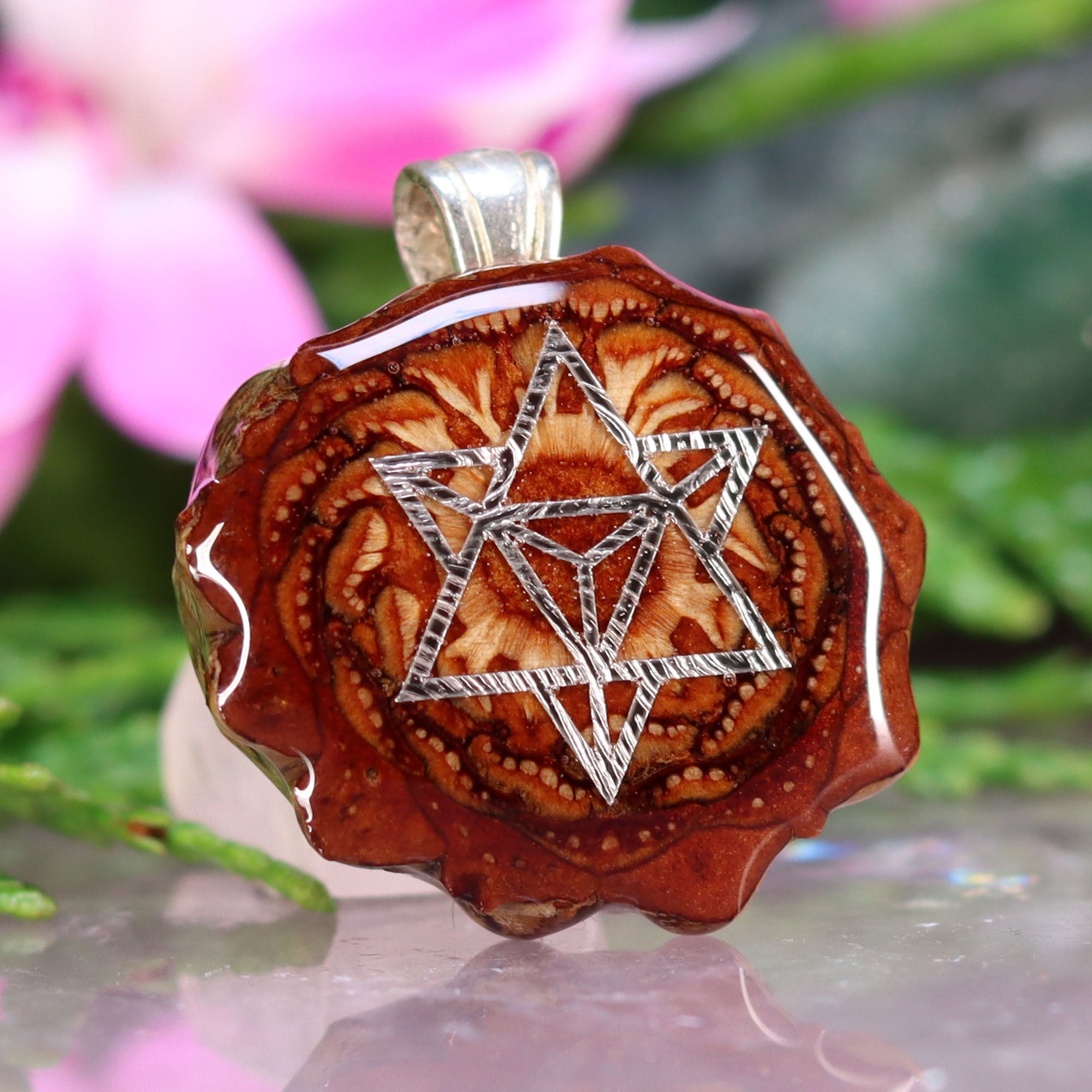 This Pinecone has been anointed with our "Merkaba" emblem, cast in Sterling SIlver. Merkaba - "Mer" meaning Light, "Ka" meaning Spirit, and "Ba" meaning Body - is a powerful icon historically known as the "Vehicle of ascension". The Merkaba opens the mind to increased awareness and promotes deep conscious interconnection.