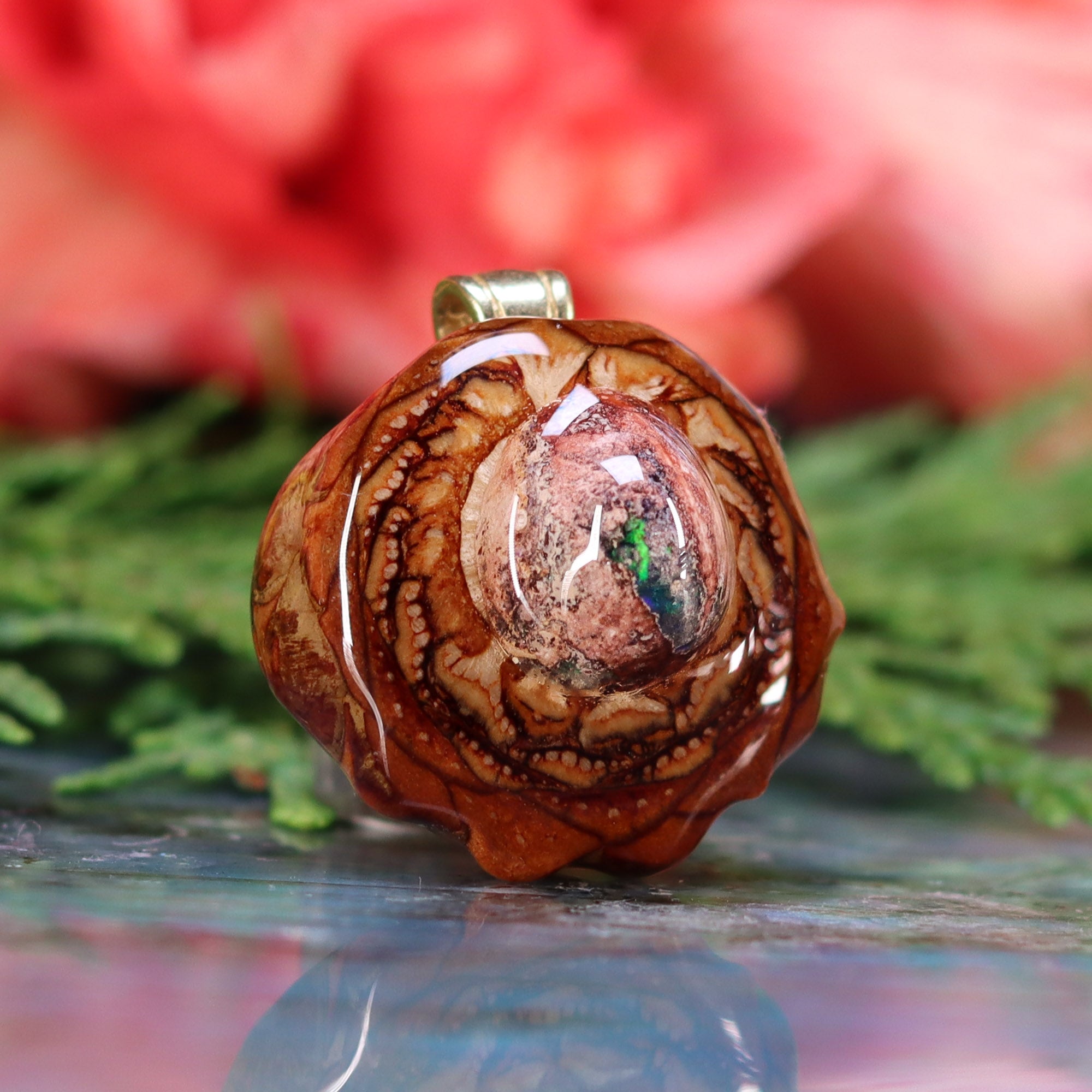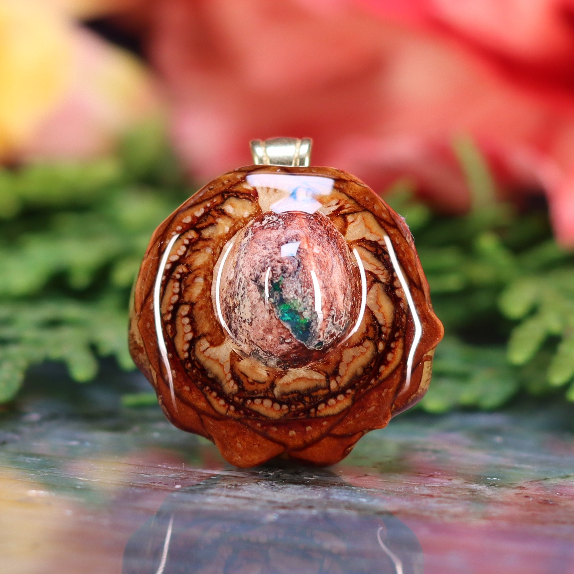 Every pinecone pendant is an elegant gift from Mother Nature -- unveiling the ornate Sacred Geometry hidden at the center of one of the world's densest Pinecones. Because only one cross-section is taken from the "heart" of each Cone, every pendant is absolutely unique, and truly one-of-a-kind.