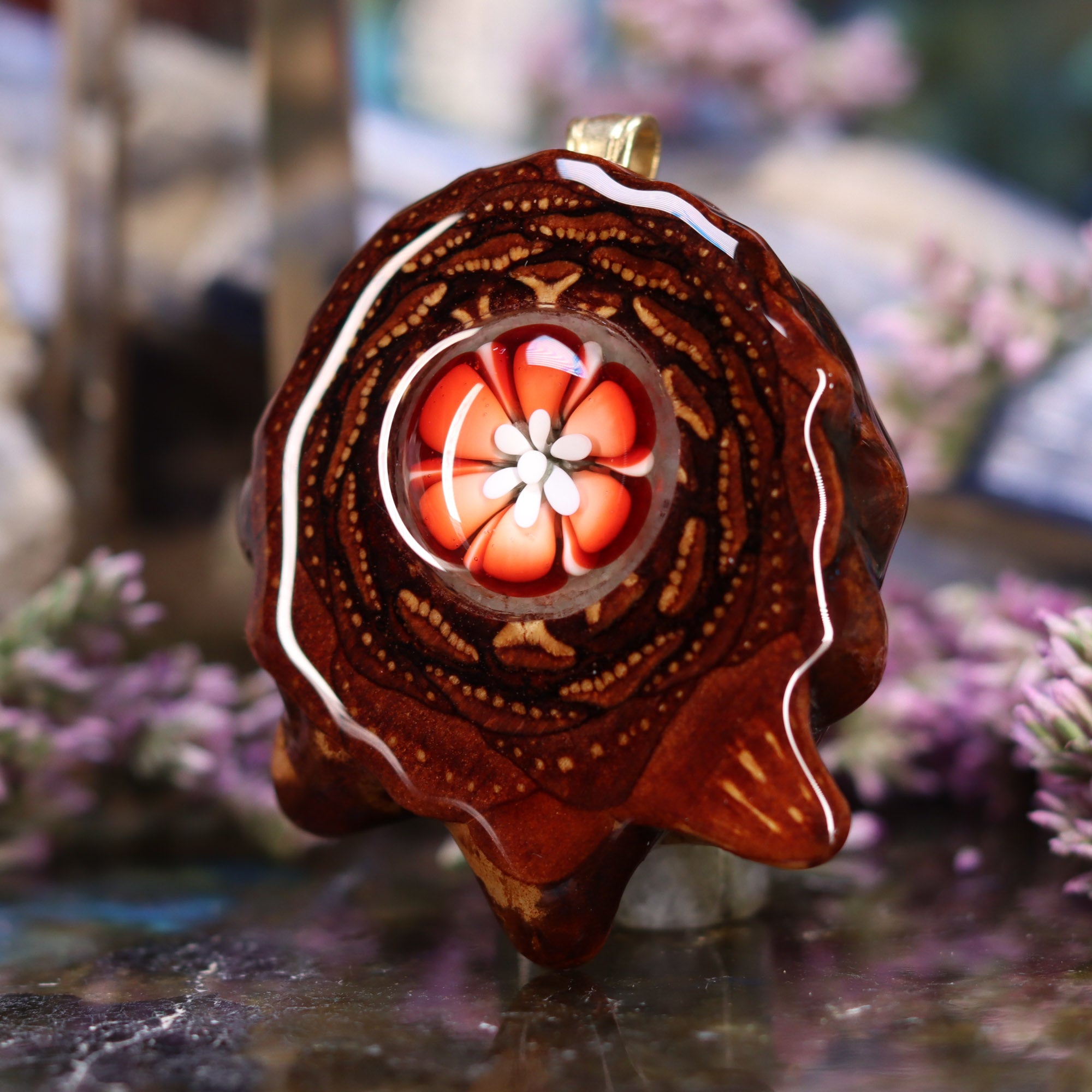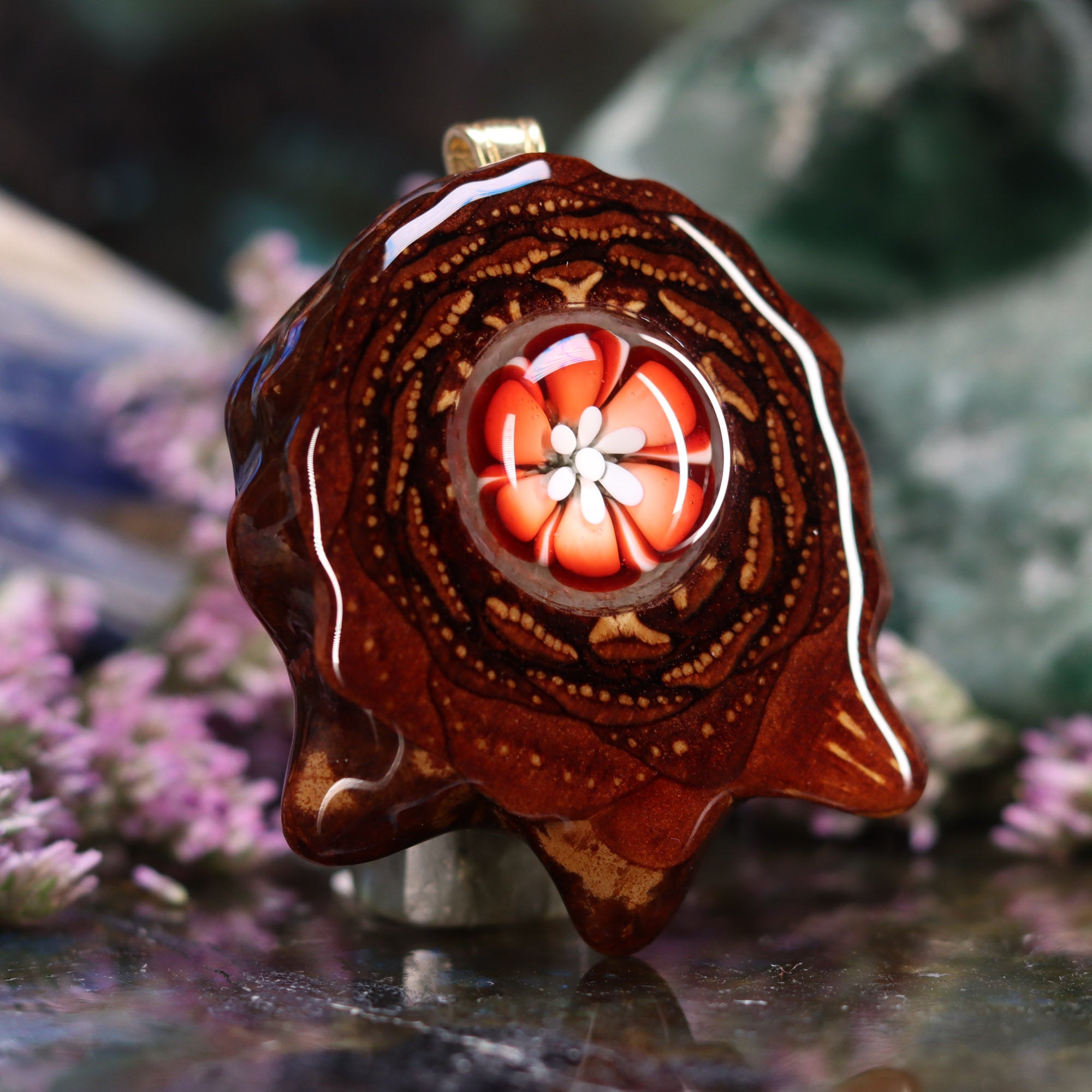 This epic collaboration between Third Eye Pinecones and Nick Anderson Art features a small Glass “Phoenix Orchid” Cab set inside one of our Pinecone Pendants! Each one of these Phoenix Orchid pendants is entirely unique, each with a life of its own. This piece is a one-of-a-kind creation, handmade by Nick, adding an exotic beauty and a stunning natural presence to the person wearing it.