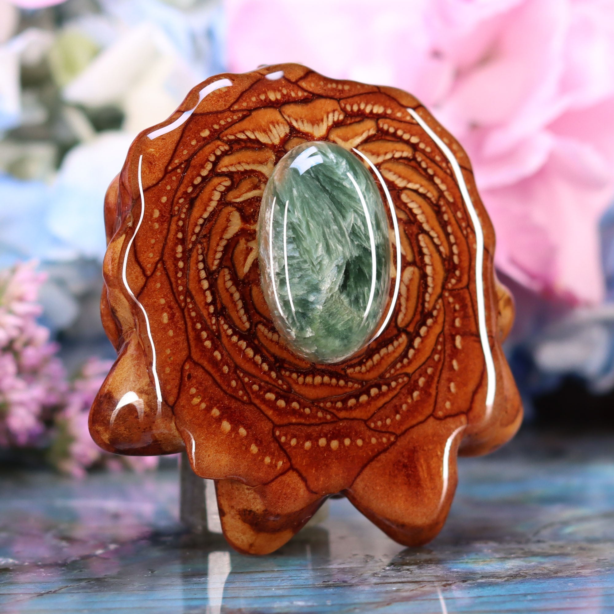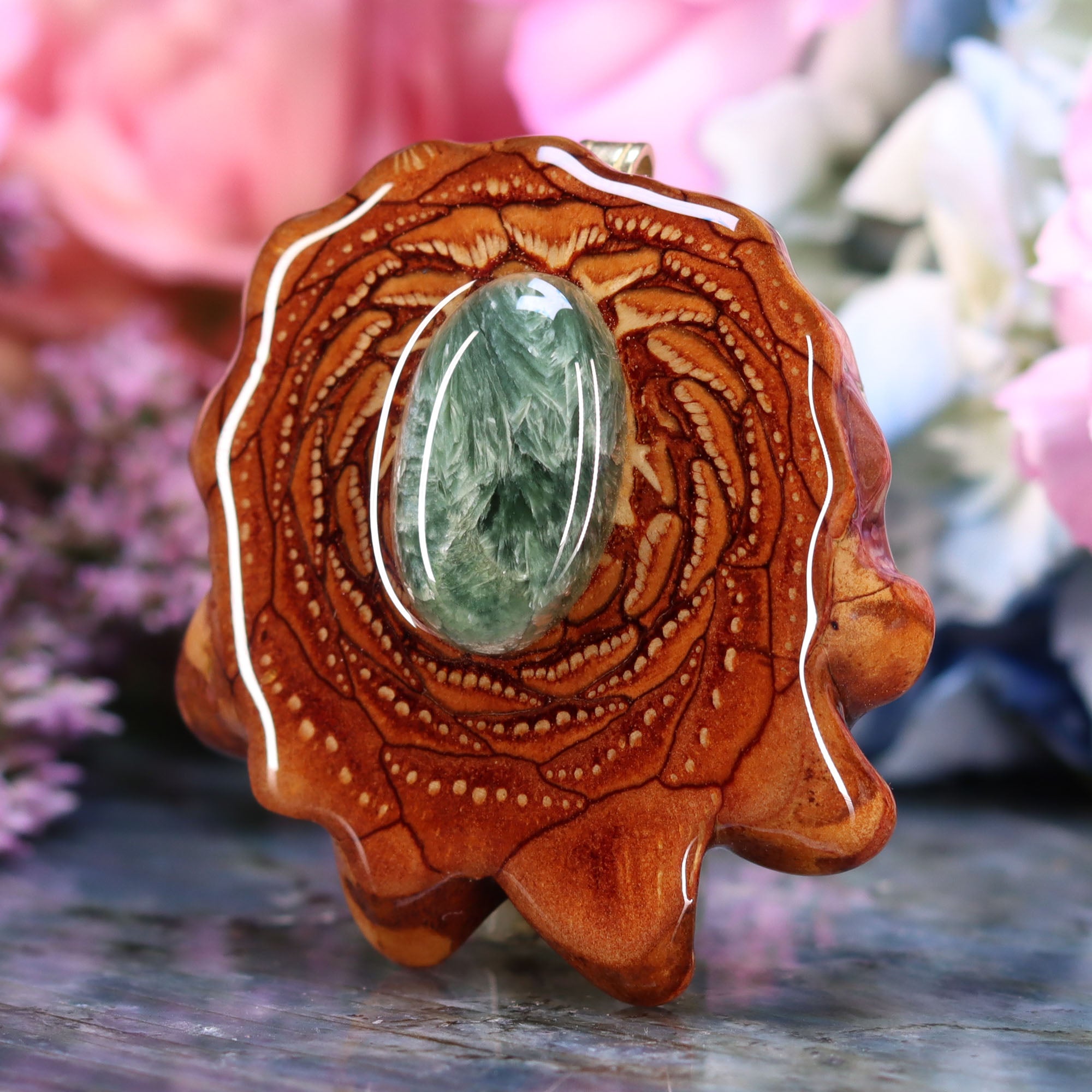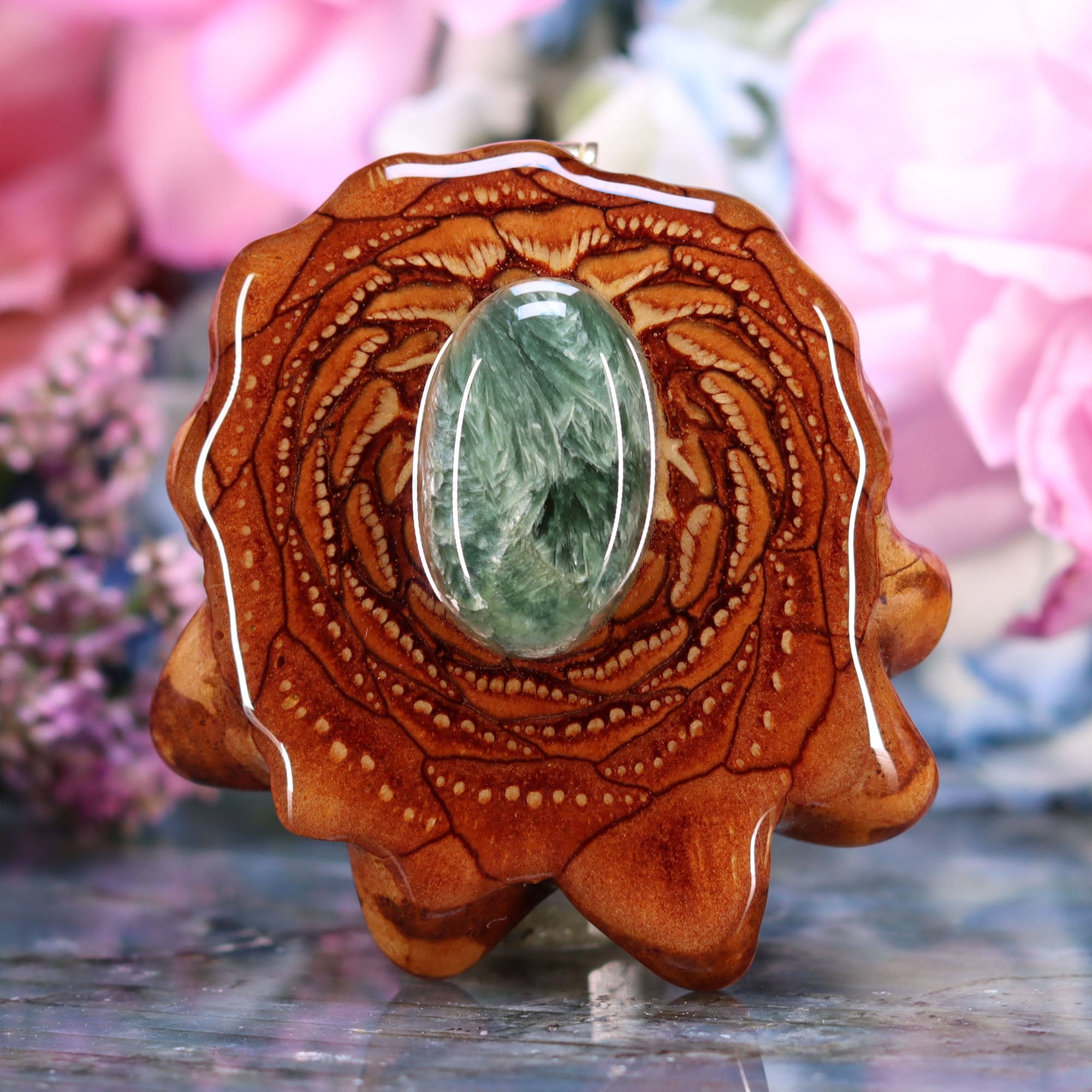 Every pinecone pendant is an elegant gift from Mother Nature -- unveiling the ornate Sacred Geometry hidden at the center of one of the world's densest Pinecones. Because only one cross-section is taken from the "heart" of each Cone, every pendant is absolutely unique, and truly one-of-a-kind.