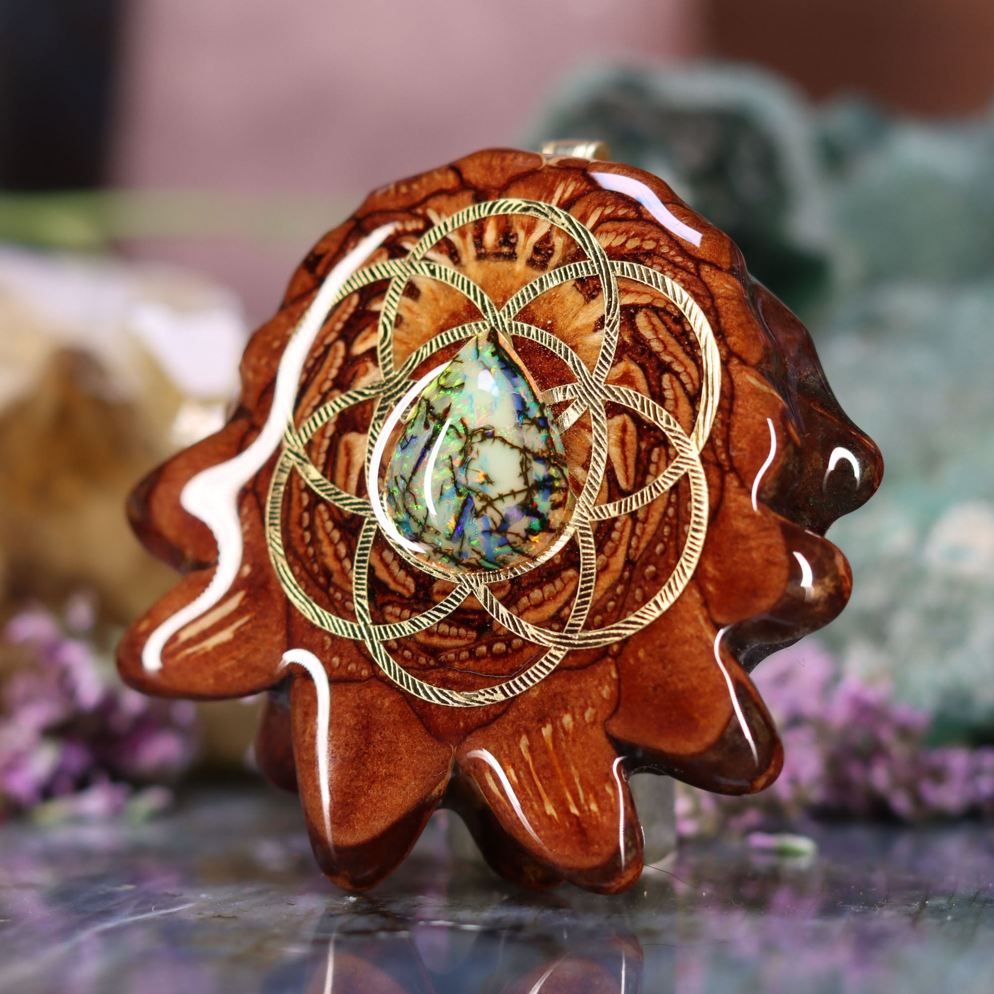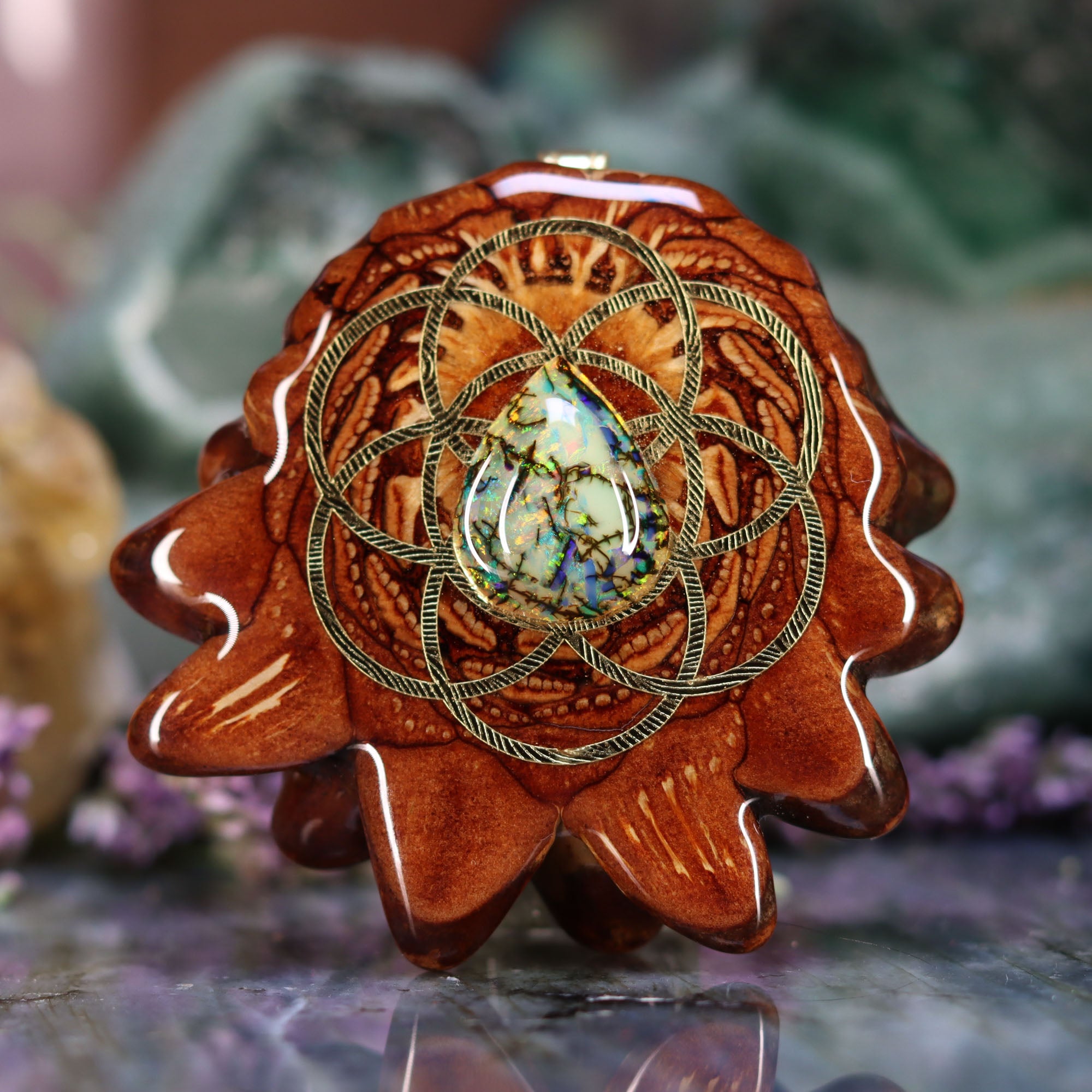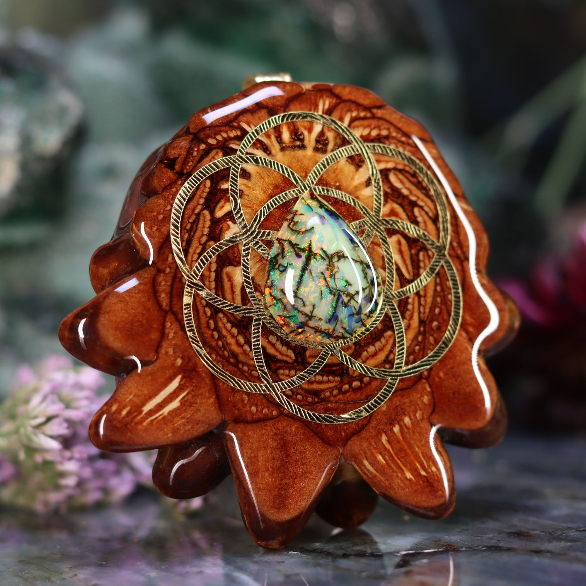 Every pinecone pendant is an elegant gift from Mother Nature -- unveiling the ornate Sacred Geometry hidden at the center of one of the world's densest Pinecones. Because only one cross-section is taken from the "heart" of each Cone, every pendant is absolutely unique, and truly one-of-a-kind.