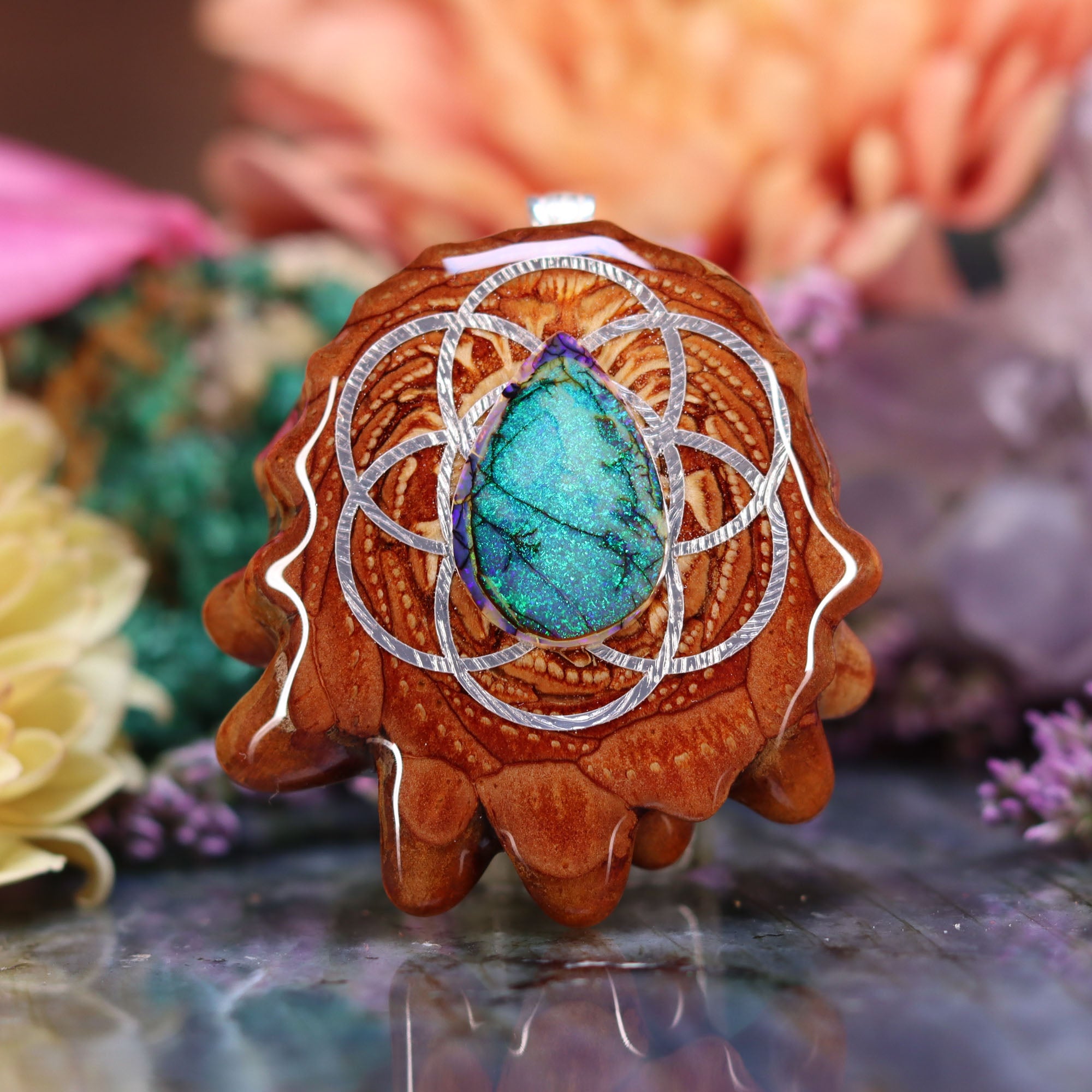Every pinecone pendant is an elegant gift from Mother Nature -- unveiling the ornate Sacred Geometry hidden at the center of one of the world's densest Pinecones. Because only one cross-section is taken from the "heart" of each Cone, every pendant is absolutely unique, and truly one-of-a-kind.