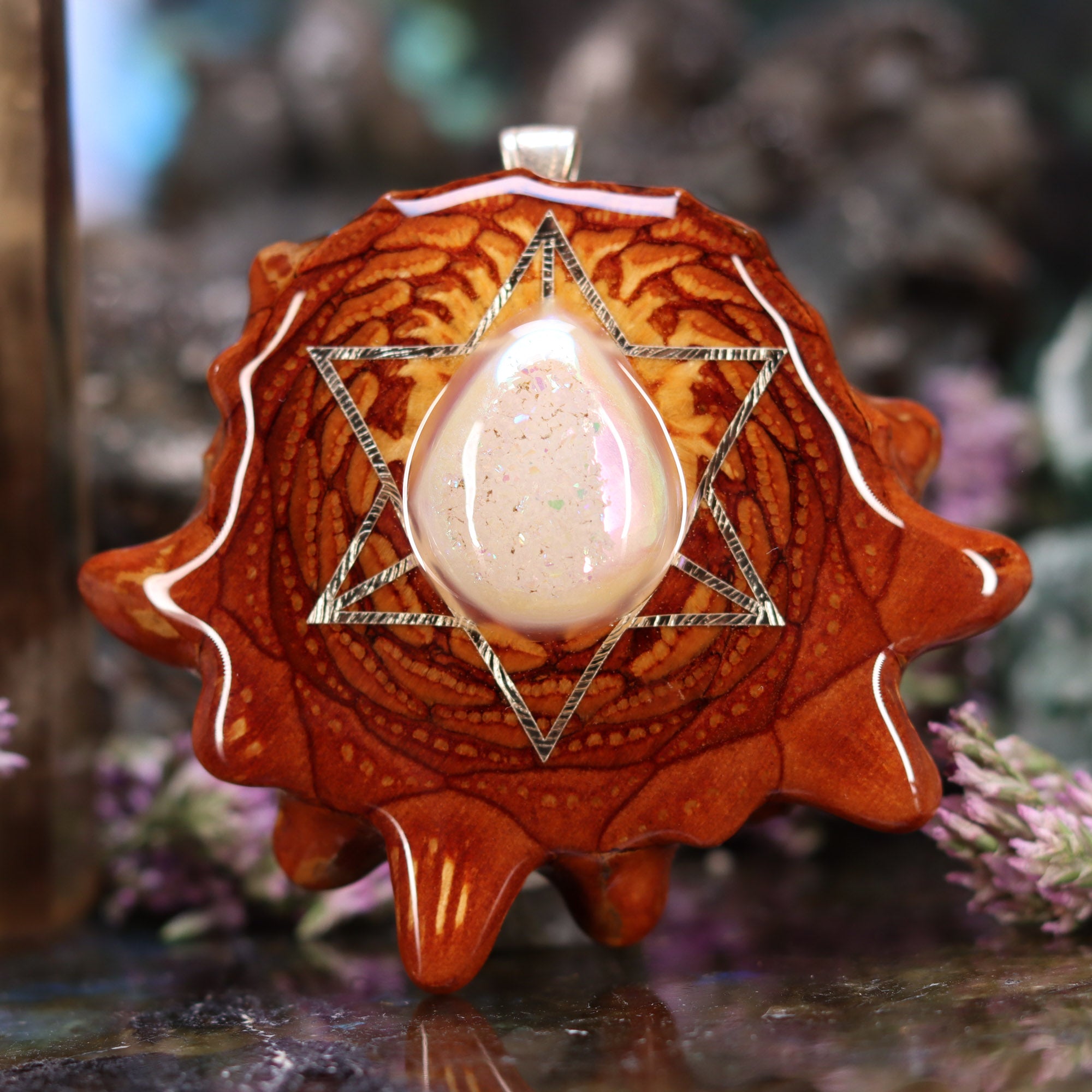 This Pinecone has been anointed with our "Merkaba" emblem, cast in Sterling Silver. Merkaba - "Mer" meaning Light, "Ka" meaning Spirit, and "Ba" meaning Body - is a powerful  icon historically known as the "Vehicle of Ascension". The Merkaba opens the mind to increased awareness and promotes deep conscious interconnection.