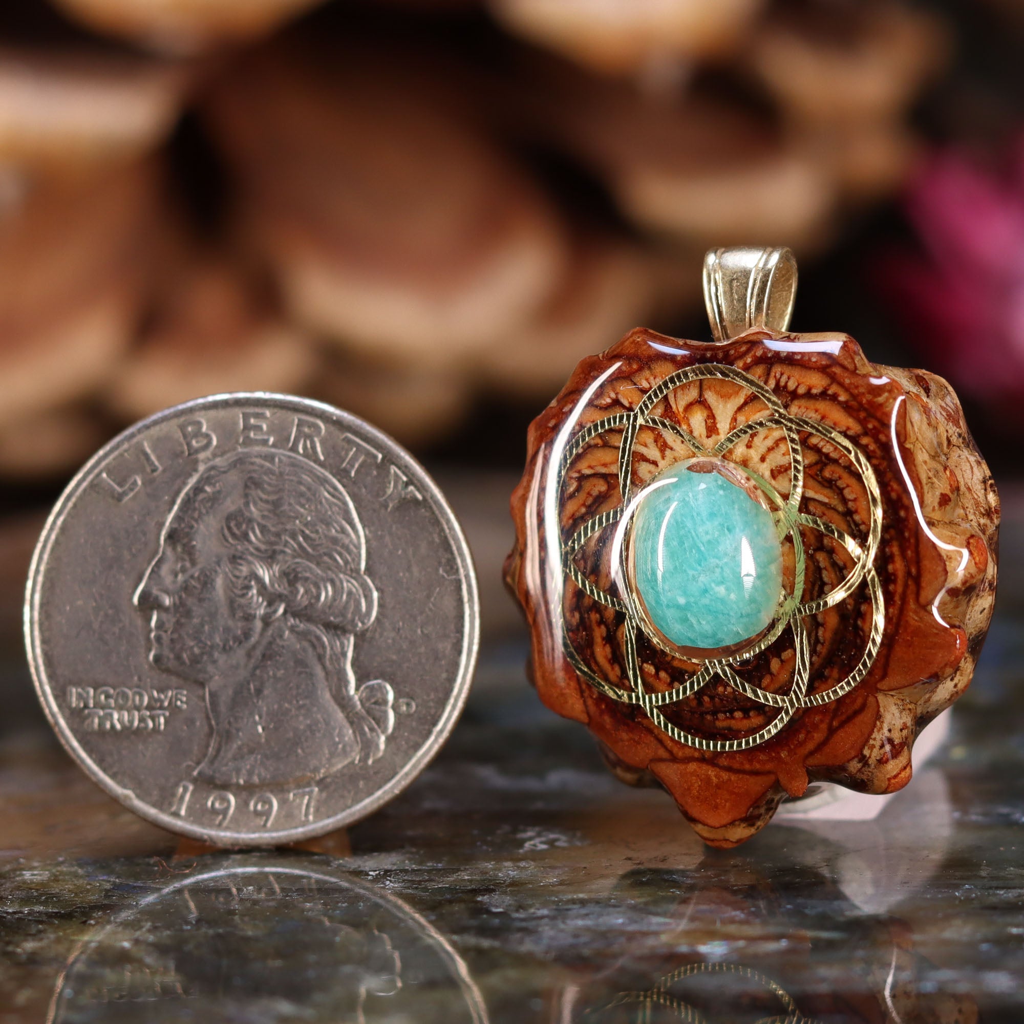 Every pinecone pendant is an elegant gift from Mother Nature -- unveiling the ornate Sacred Geometry hidden at the center of one of the world's densest Pinecones. Because only one cross-section is taken from the "heart" of each Cone, every pendant is absolutely unique, and truly one-of-a-kind.