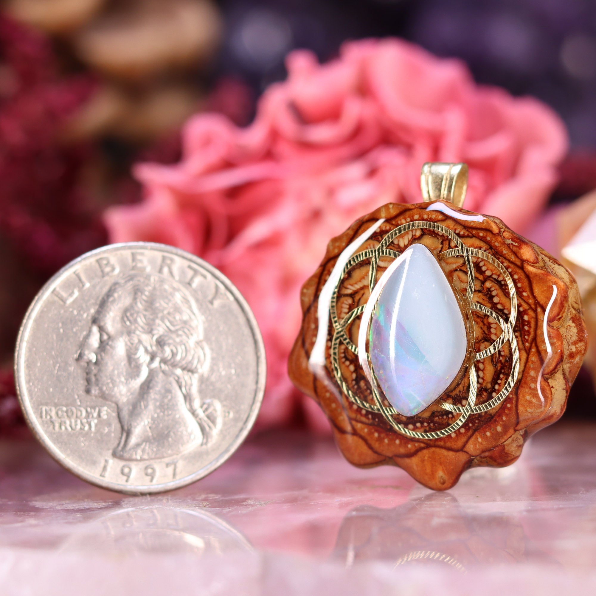 Every pinecone pendant is an elegant gift from Mother Nature -- unveiling the ornate Sacred Geometry hidden at the center of one of the world's densest Pinecones. Because only one cross-section is taken from the "heart" of each Cone, every pendant is absolutely unique, and truly one-of-a-kind.