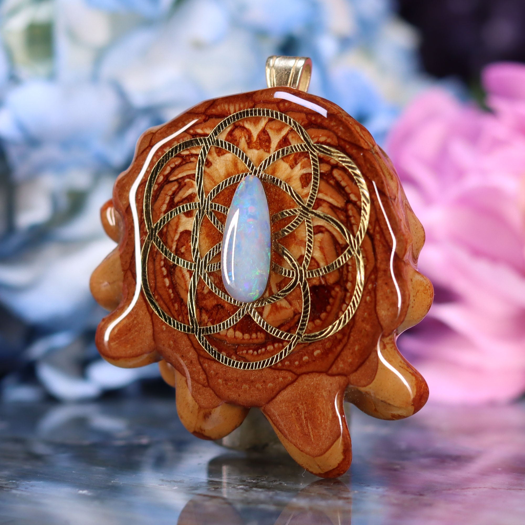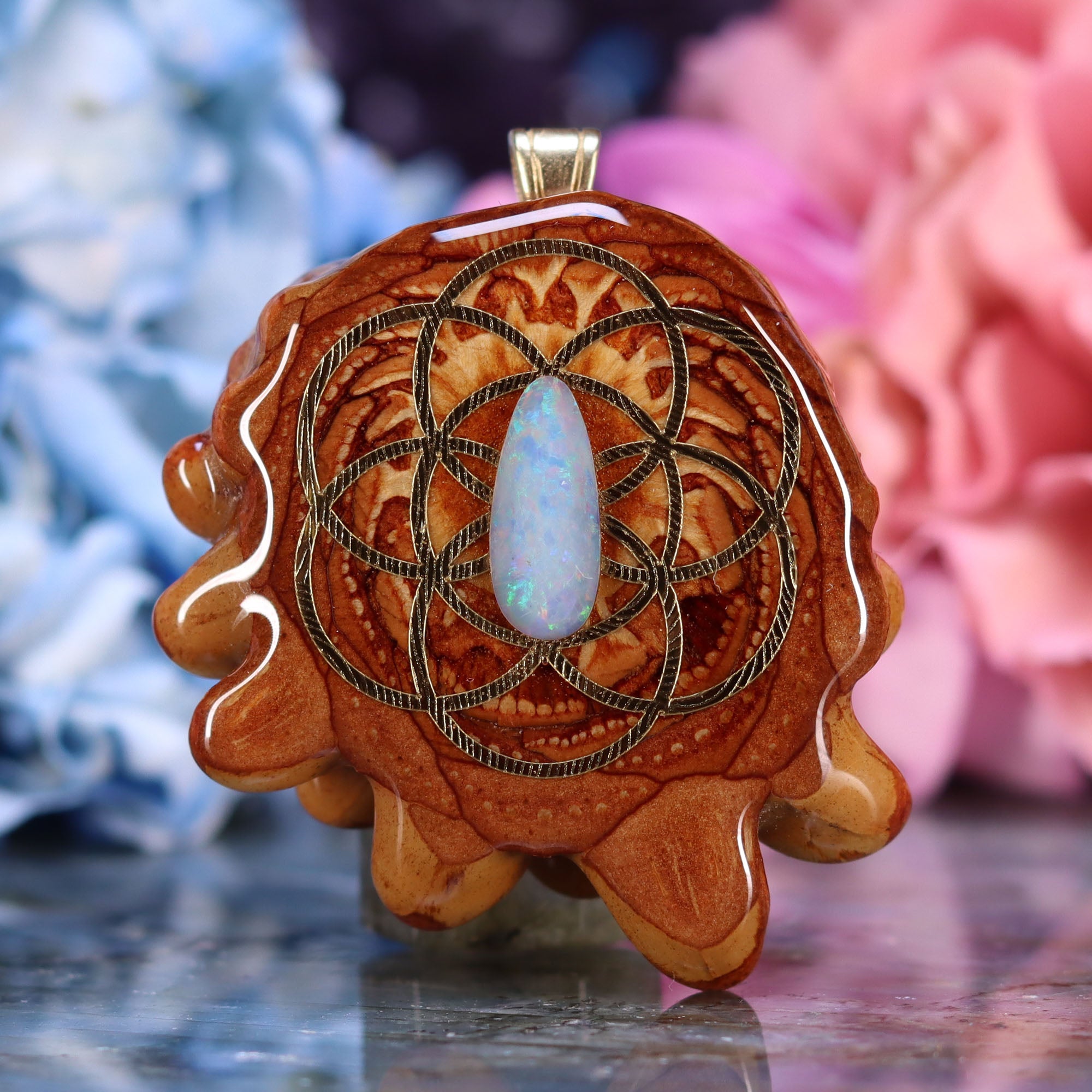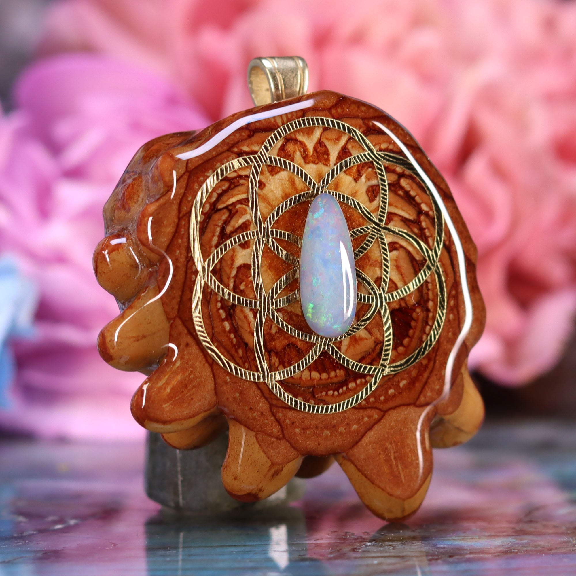 Every pinecone pendant is an elegant gift from Mother Nature -- unveiling the ornate Sacred Geometry hidden at the center of one of the world's densest Pinecones. Because only one cross-section is taken from the "heart" of each Cone, every pendant is absolutely unique, and truly one-of-a-kind.