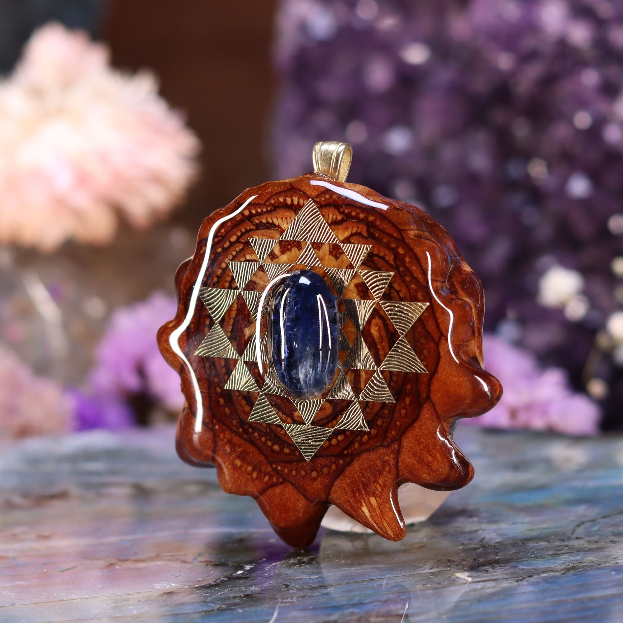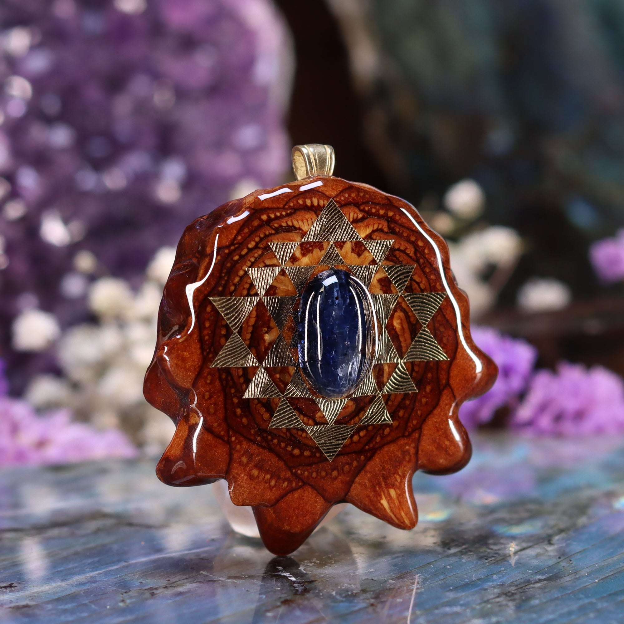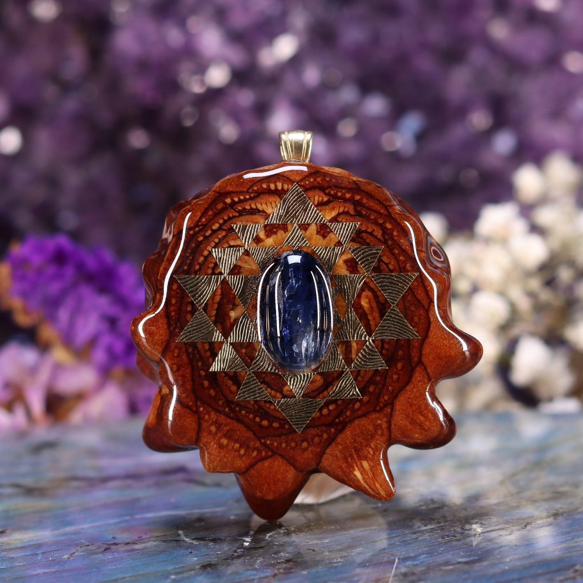This piece bears a 24k Gold Sri Yantra (literally meaning "holy instrument") Mandala, symbolizing the junction between the physical universe and its unmanifest source according to Hindu Mysticism. Four triangles face upwards to represent the Divine Masculine (Shiva), and five triangles face downwards to represent the Divine Feminine (Shakti). The Sri Yantra is often referred to as the Chakra Raja – King of all Chakras – making it a supreme instrument in the path of spiritual advancement.