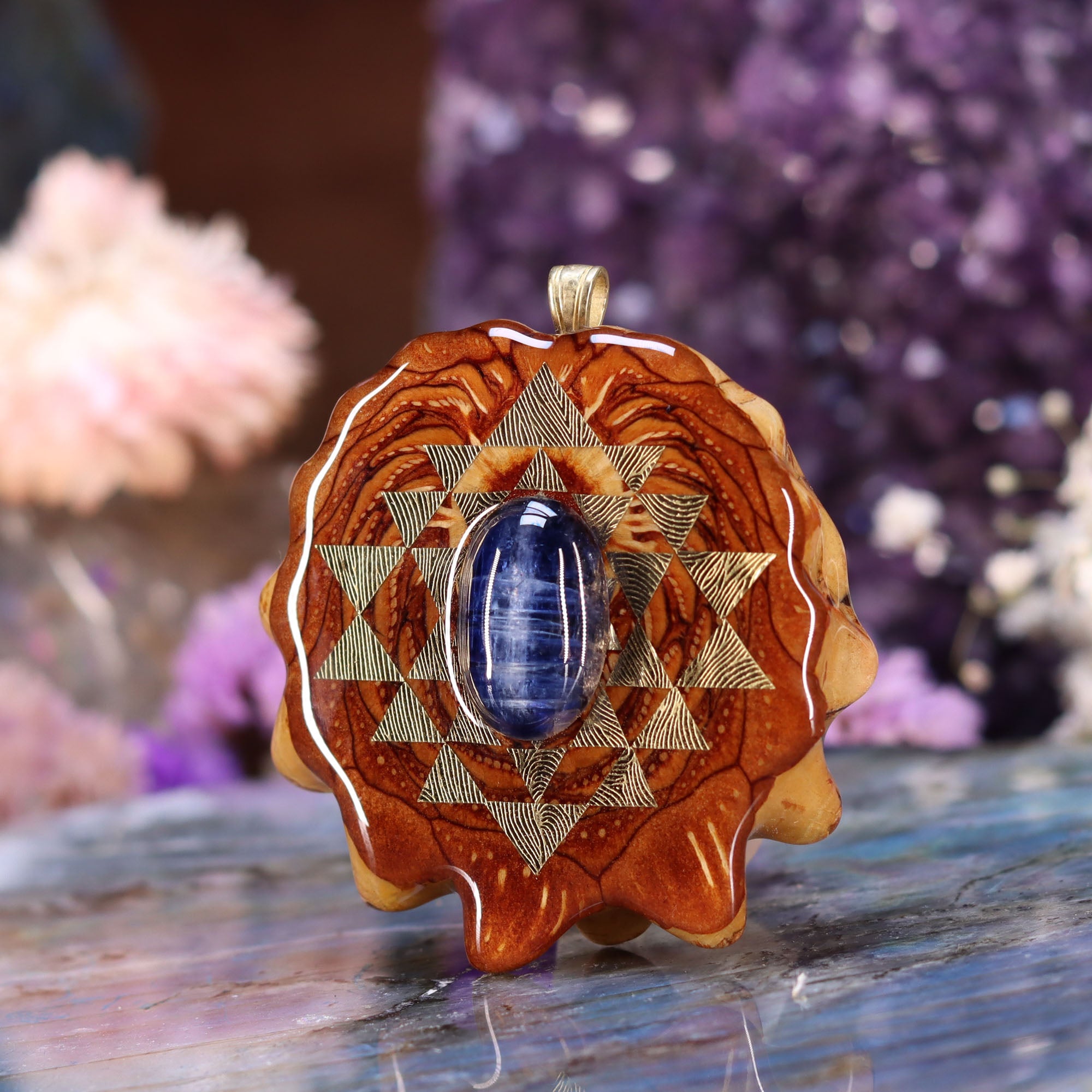 This piece bears a 24k Gold Sri Yantra (literally meaning "holy instrument") Mandala, symbolizing the junction between the physical universe and its unmanifest source according to Hindu Mysticism. Four triangles face upwards to represent the Divine Masculine (Shiva), and five triangles face downwards to represent the Divine Feminine (Shakti). The Sri Yantra is often referred to as the Chakra Raja – King of all Chakras – making it a supreme instrument in the path of spiritual advancement.