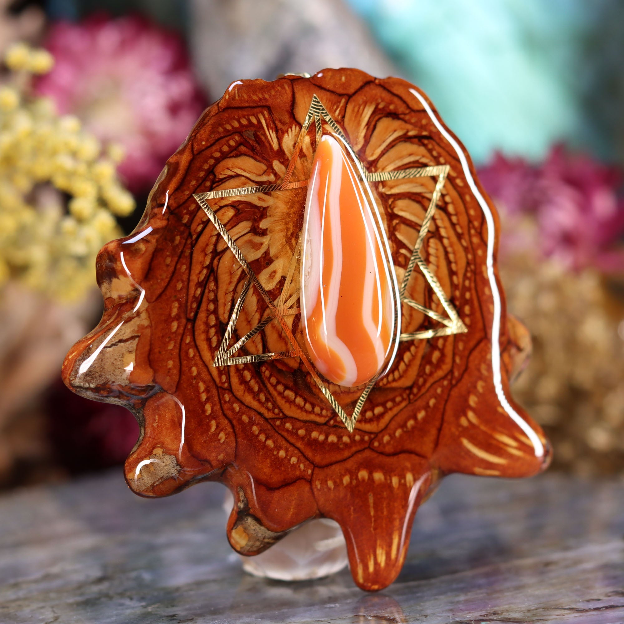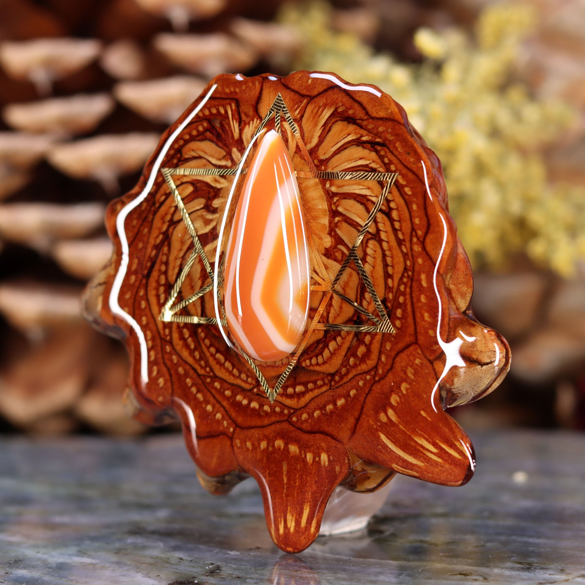 This Pinecone has been anointed with our "Merkaba" emblem, cast in 24k Gold. Merkaba - "Mer" meaning Light, "Ka" meaning Spirit, and "Ba" meaning Body - is a powerful  icon historically known as the "Vehicle of Ascension". The Merkaba opens the mind to increased awareness and promotes deep conscious interconnection.
