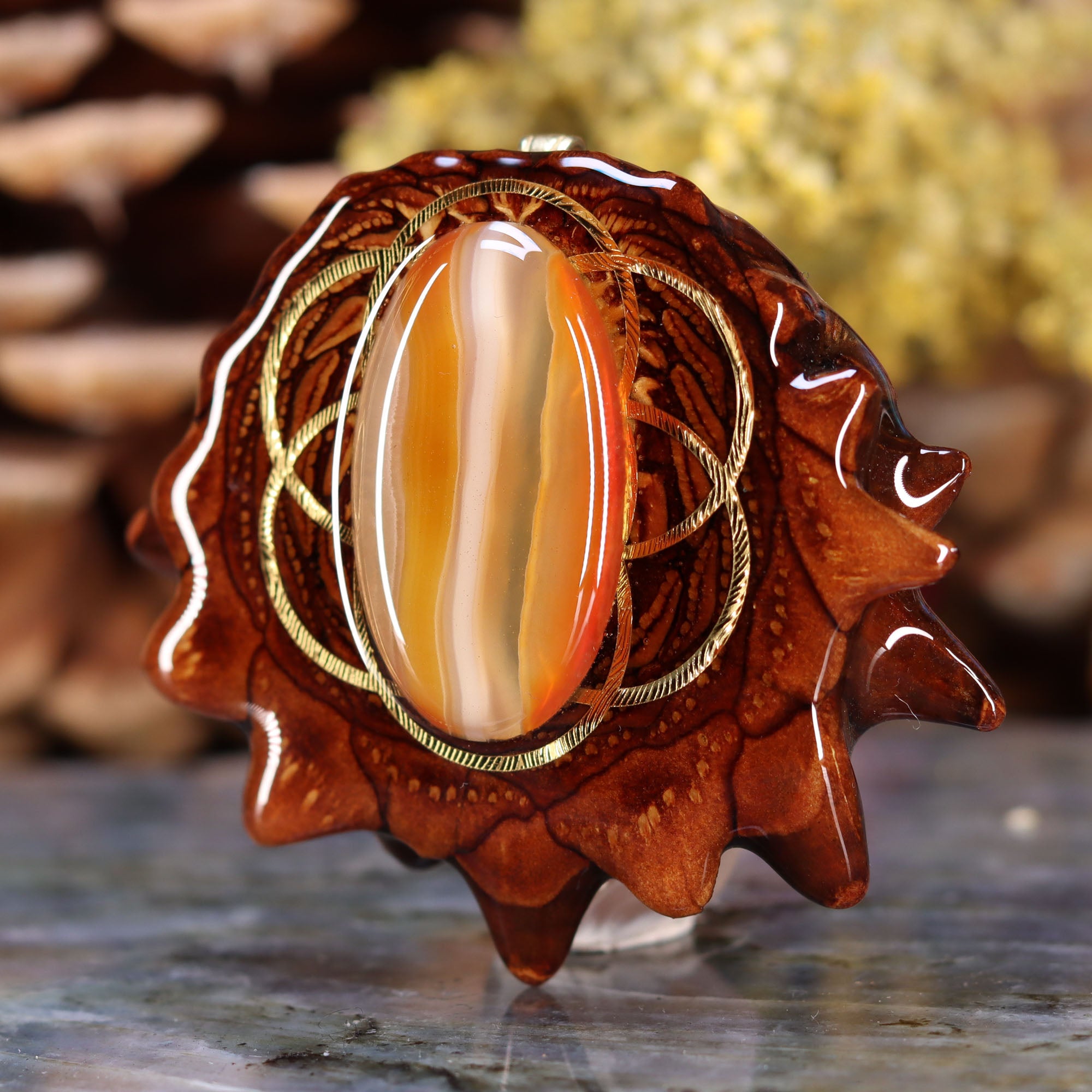 Every pinecone pendant is an elegant gift from Mother Nature -- unveiling the ornate Sacred Geometry hidden at the center of one of the world's densest Pinecones. Because only one cross-section is taken from the "heart" of each Cone, every pendant is absolutely unique, and truly one-of-a-kind.