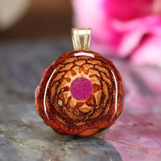 Every pinecone pendant is an elegant gift from Mother Nature -- unveiling the ornate Sacred Geometry hidden at the center of one of the world's densest Pinecones. Because only one cross-section is taken from the "heart" of each Cone, every pendant is absolutely unique, and truly one-of-a-kind.