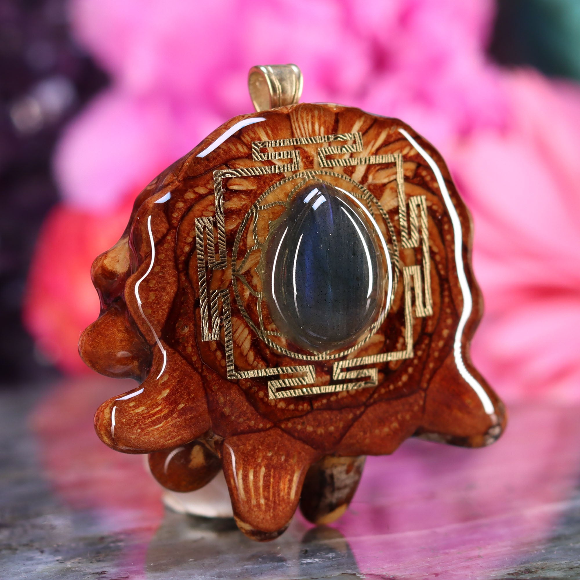 This Pinecone is adorned with a 24k Gold Kali Yantra. The Kali Yantra (also known as the Dakshinikali Yantra) is a geometric symbol existing in the external world as well as a subject to be internalized within human consciousness. Kali is the Hindu Goddess of time, and of change. She is the power of action, of the breath and of transformation (kriya-shakti). Kali's essence is Divine Love and through time, breath, and Divine Love all things are said to be accomplished. The Kali Yantra, then, contains within it the transformative energy of change.