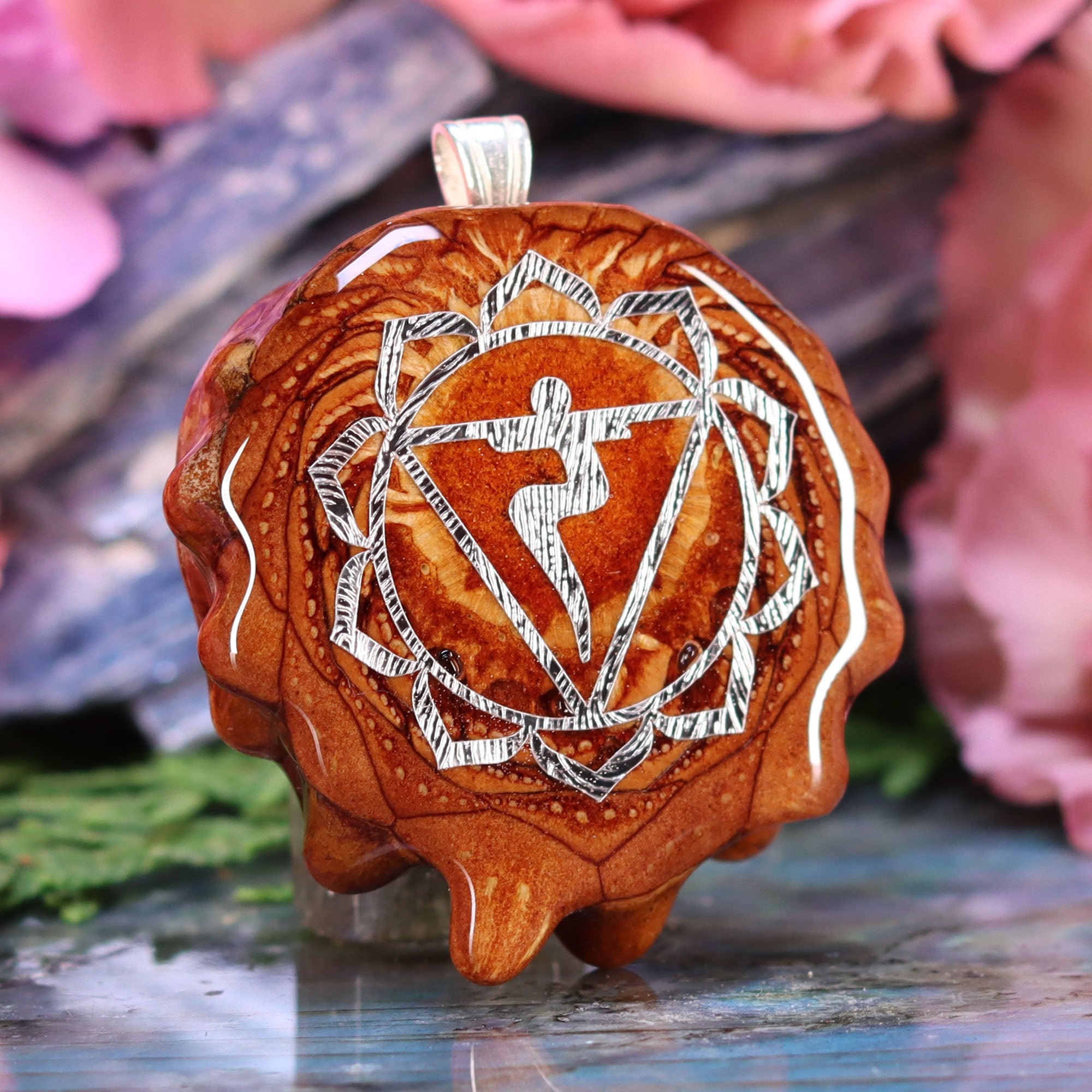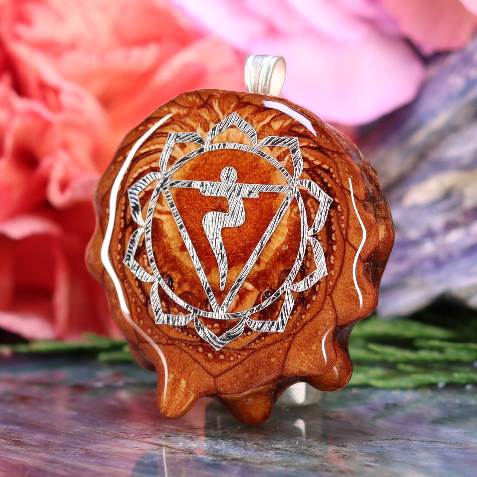 This pinecone bears a Sterling Silver emblem of the 3rd chakra, the Solar Plexus Chakra. Known as “Manipura” (“the place of resplendence”) in Sanskrit, the 3rd chakra is characterized by the Archetype of the Warrior, and is associated with self-esteem, transformation, and the ability to assert one’s Will in the world.